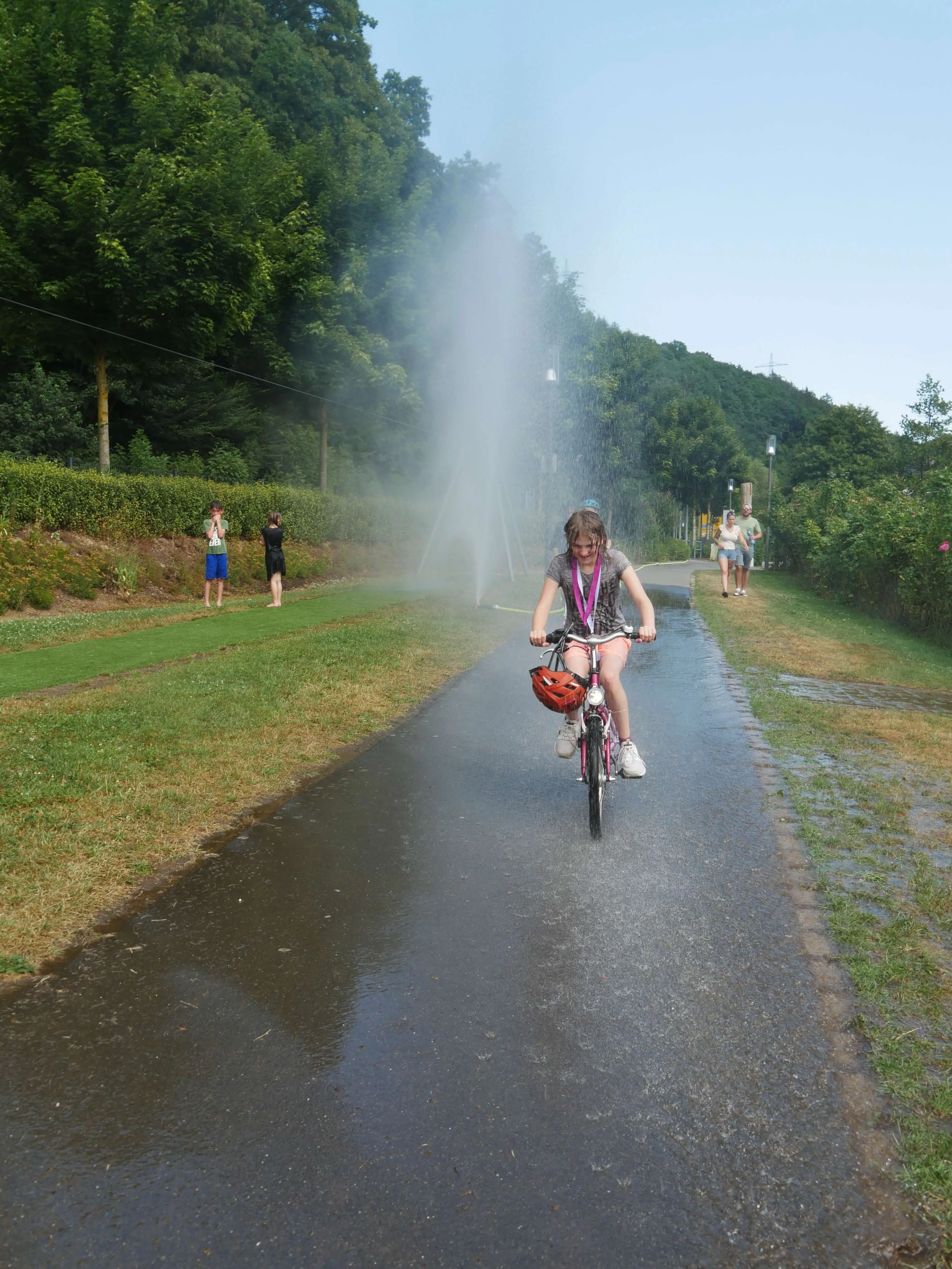 4. Juli: Am bislang wärmsten Tag des Jahres — die Temperaturen klettern auf bis zu 38 Grad — findet das Familienfest der Awo im Volmepark statt. Zahlreiche Familien und auch die OGS-Kinder der Primusschule finden trotz der brütenden Hitze den Weg in den Volmepark. Die Feuerwehr Schalksmühle kommt zur Hilfe und bringt Abkühlung mit — in Form eines Hydroschildes, das konstanten, erfrischenden Sprühnebel erzeugt — und schnell zum Anziehungspunkt für die Besucher wird.