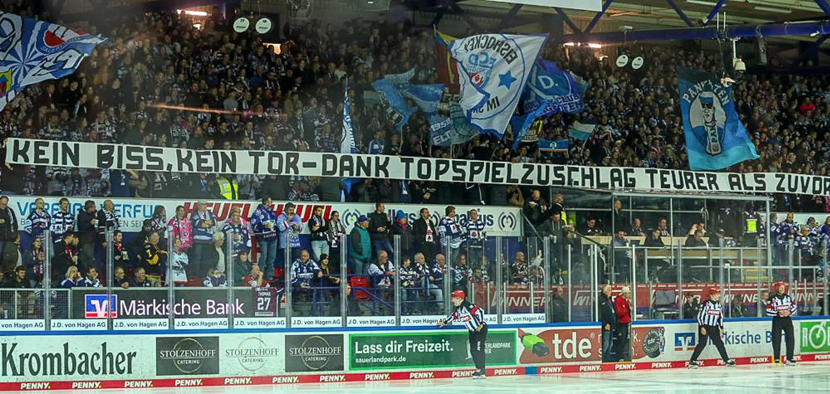 Die Gastgeber wollten gegen die Rheinländer endlich den Negativlauf beenden. Die Aussichten waren vor dem ersten Bully im Westderby durchaus gut. Immerhin konnten die Sauerländer drei der letzten fünf Begegnungen gegen die Haie für sich entscheiden. Das erste Drittel war arm an Höhepunkten. Beide Teams agierten auf Augenhöhe, keines konnte sich nachhaltig durchsetzen und beide Goalies hatten wenig Mühe, ihr jeweiliges Gehäuse sauber zu halten. So blieb es bis zum ersten Pausentee beim torlosen Unentschieden.
