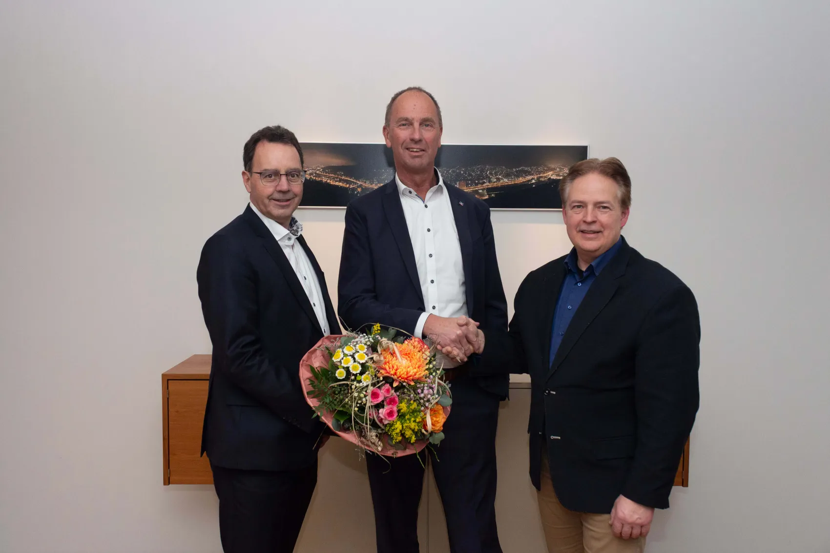Für Vorstandsmitglied Jens Brinkmann startete das Jahr 2026 mit einem Jubiläum. Vor 20 Jahren berief ihn der Aufsichtsrat der damaligen Volksbank Siegerland mit Wirkung zum 1. Januar 2006 in den Vorstand. Aufsichtsratsvorsitzender Prof. Dr.-Ing. Sven Keller und Vorstandssprecher Roland Krebs gratulierten zum Jubiläum.