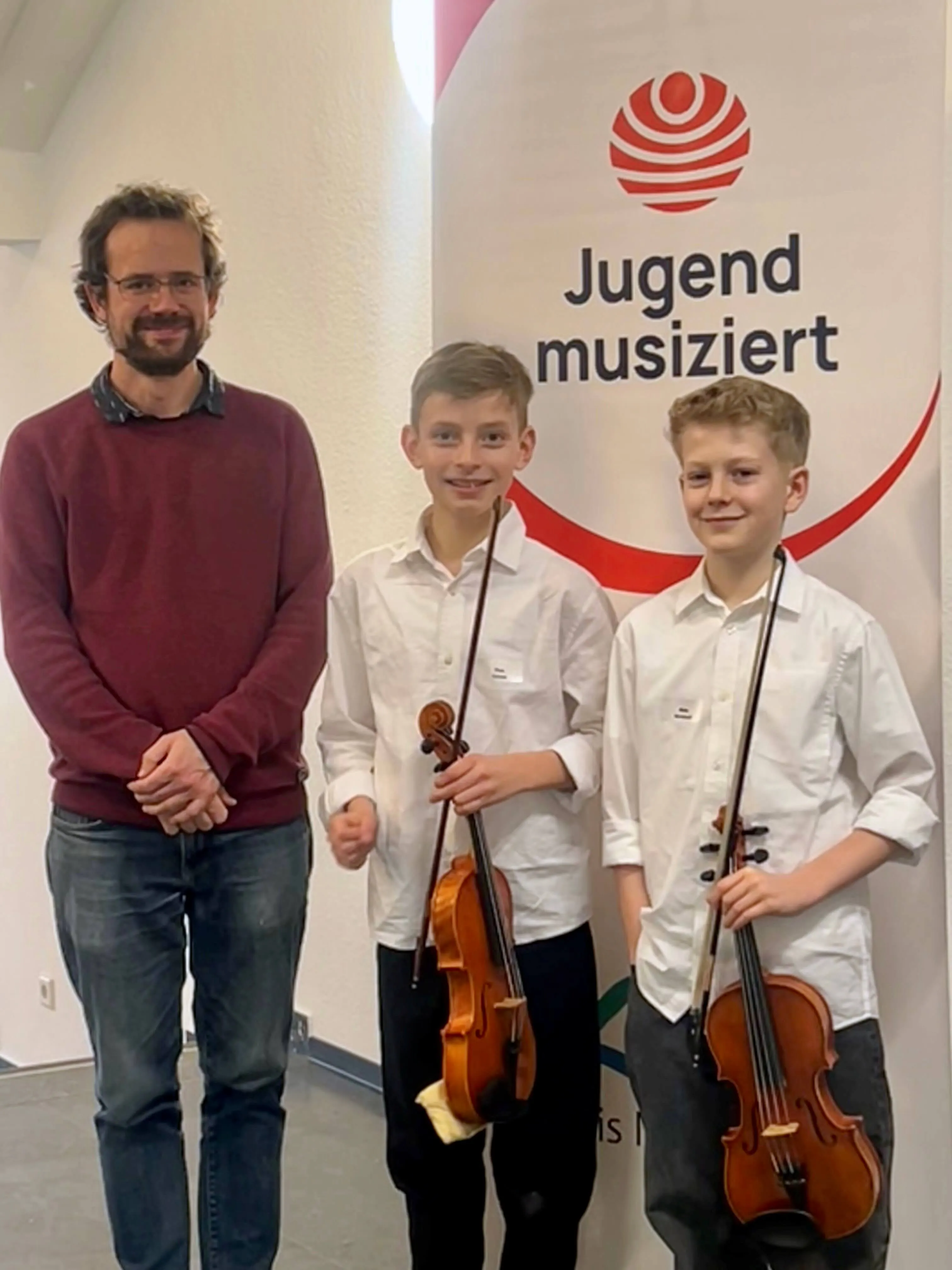 Am selben Tag trat das Geigenduo mit Mats Brinkhoff und Theo Tornow aus der Violinklasse von Johannes Gehring in der Kategorie Streicher-Kammermusik (Altersgruppe II) an. Und auch sie freuen sich nach ihrem erfolgreichen Auftritt in Ratingen über einen 1. Preis mit 23 Punkten, womit sie sich ebenfalls für den Landeswettbewerb in Dortmund qualifiziert haben.