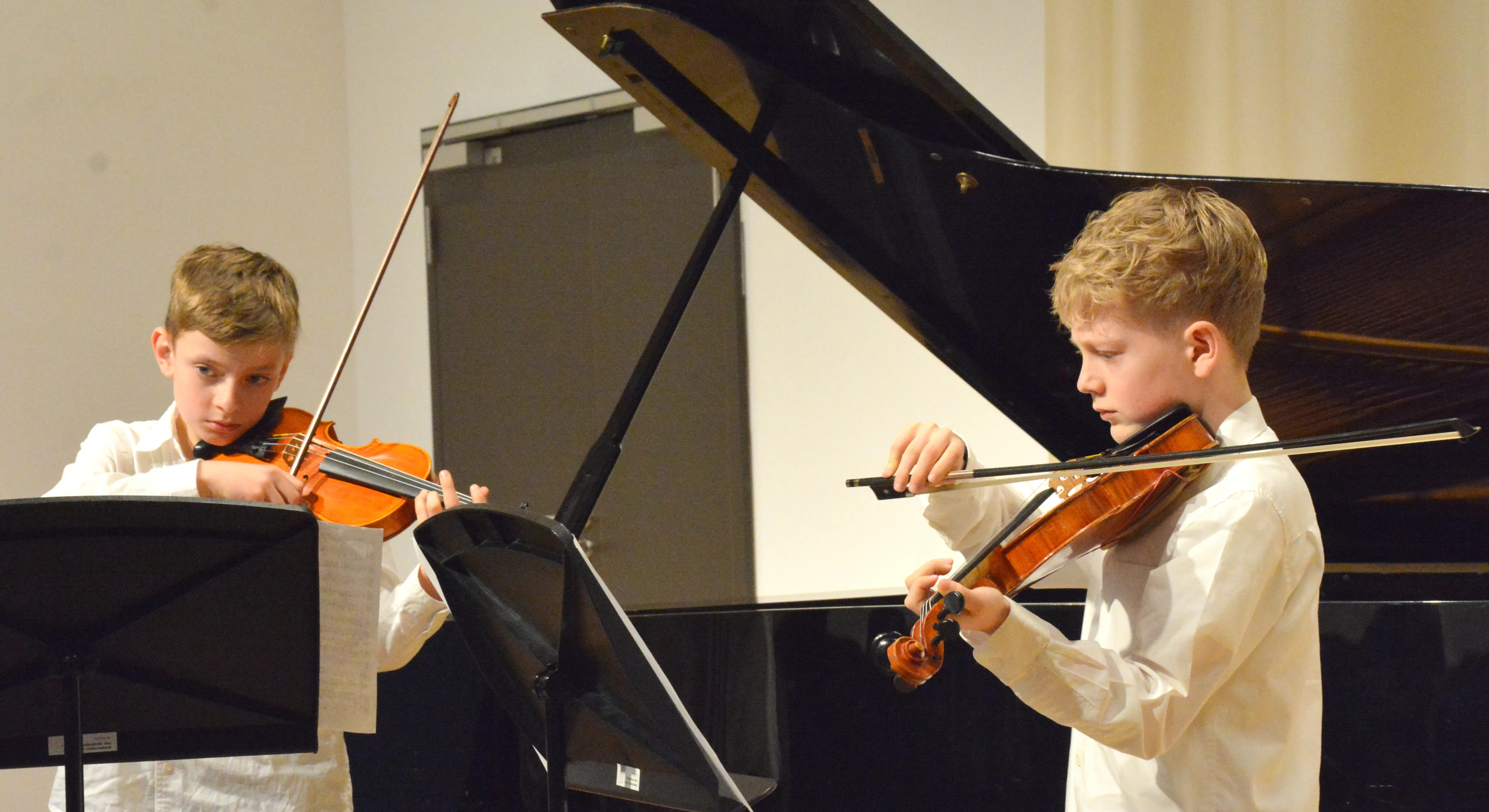 Das Geigenduo mit Mats Brinkhoff und Theo Tornow freute sich nach seinem erfolgreichen Auftritt beim Regionalwettbewerb über einen 1. Preis mit 23 Punkten. Damit hatte sich das Duo ebenfalls für den Landeswettbewerb in Dortmund qualifiziert.