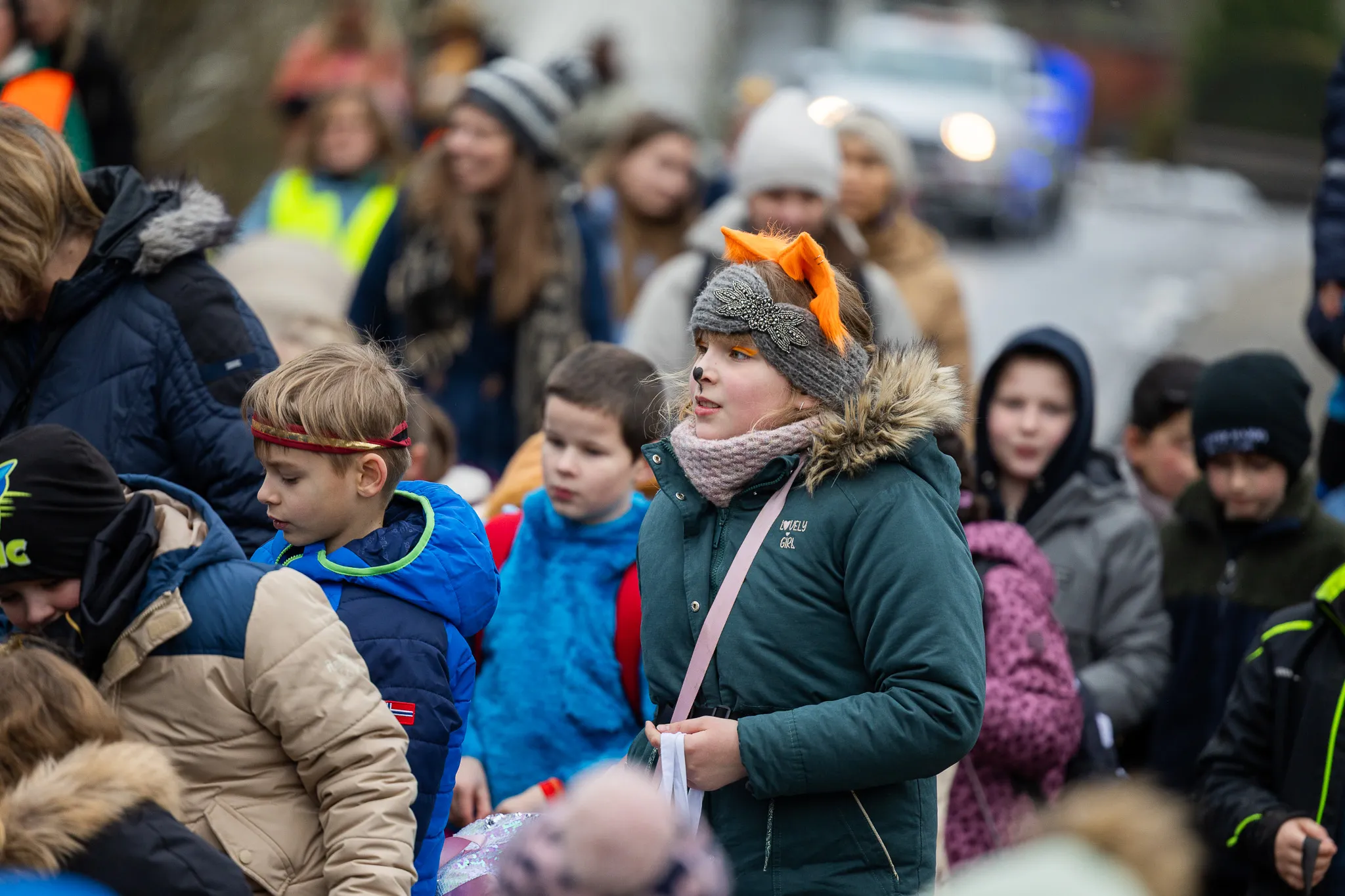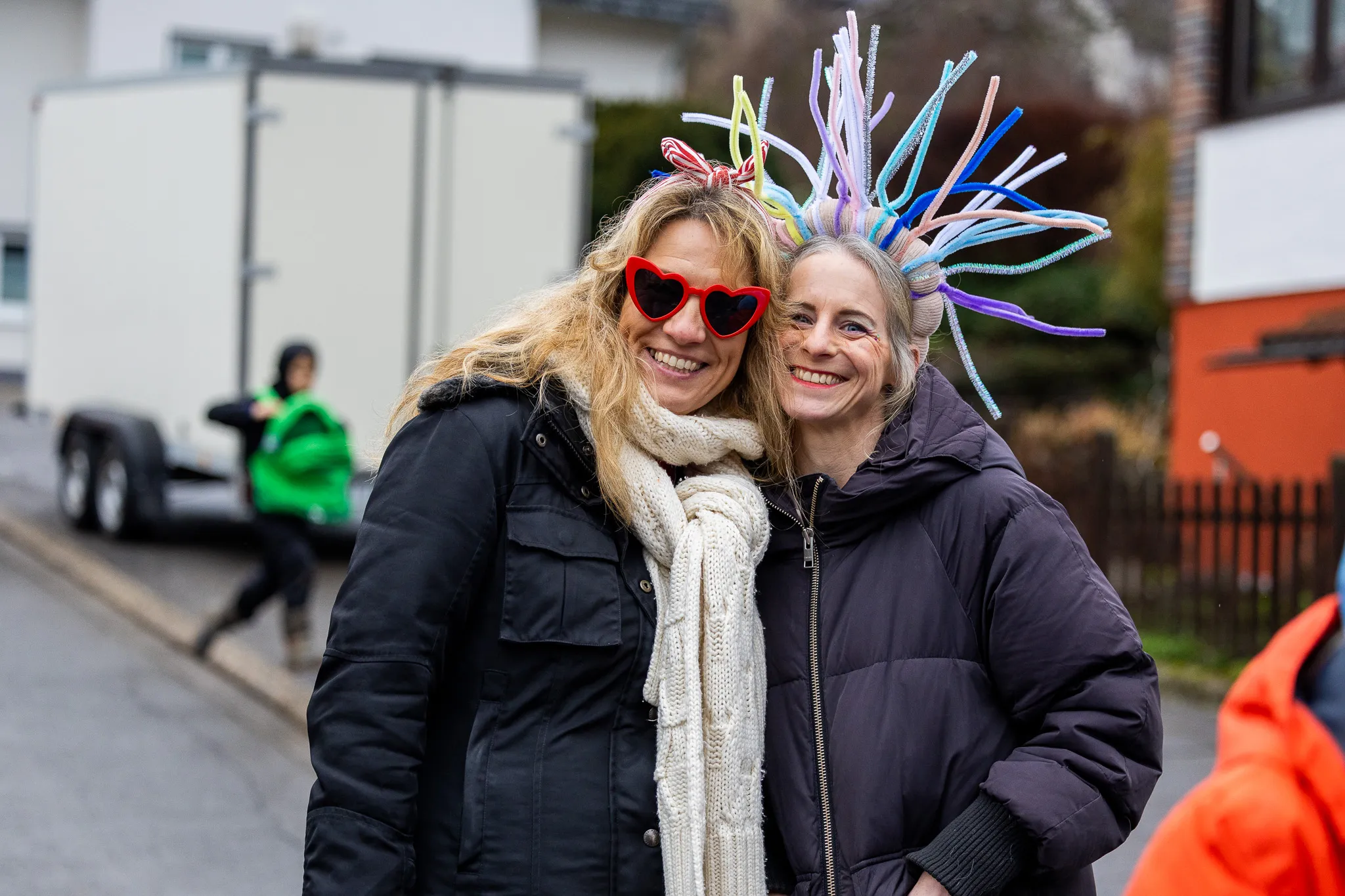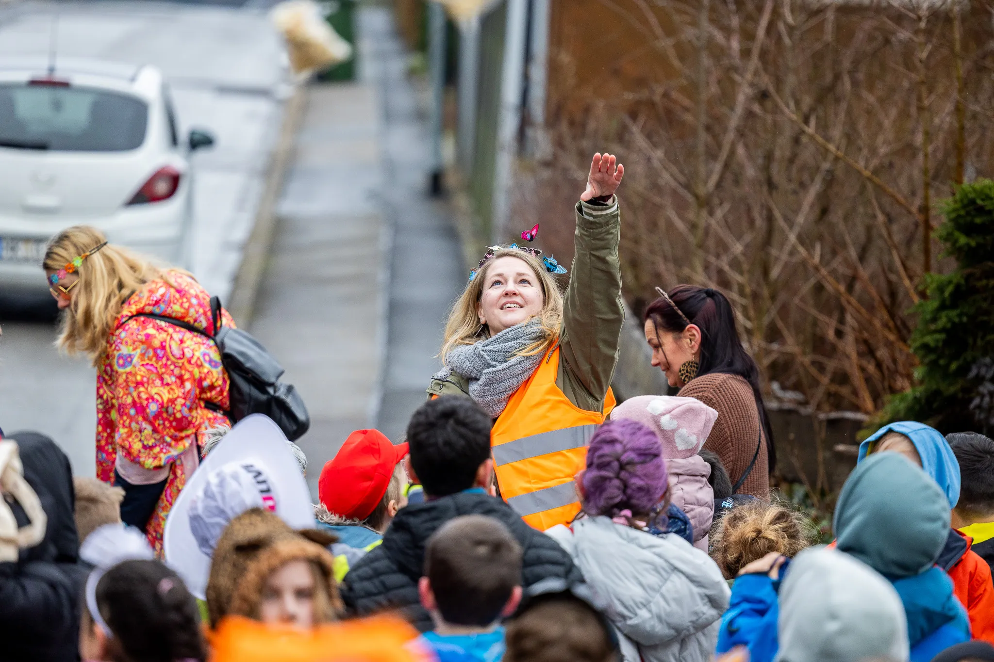 Rund 100 Regenbogenschüler starteten gemeinsam mit den Vorschulkindern der Kita Wunderland Am Nocken und zogen anschließend etwa eine Stunde lang durch die Straßen von Oberbrügge. Polizei und Ordnungsamt sperrten die Straßen ab, während einige Eltern die jungen Jecken begleiteten, damit sie unbeschwert feiern konnten. Auf ihrem Weg trafen die jungen Karnevalisten auf zahlreiche Anwohner, die am Dienstagmorgen süße Überraschungen vorbereitet hatten.
