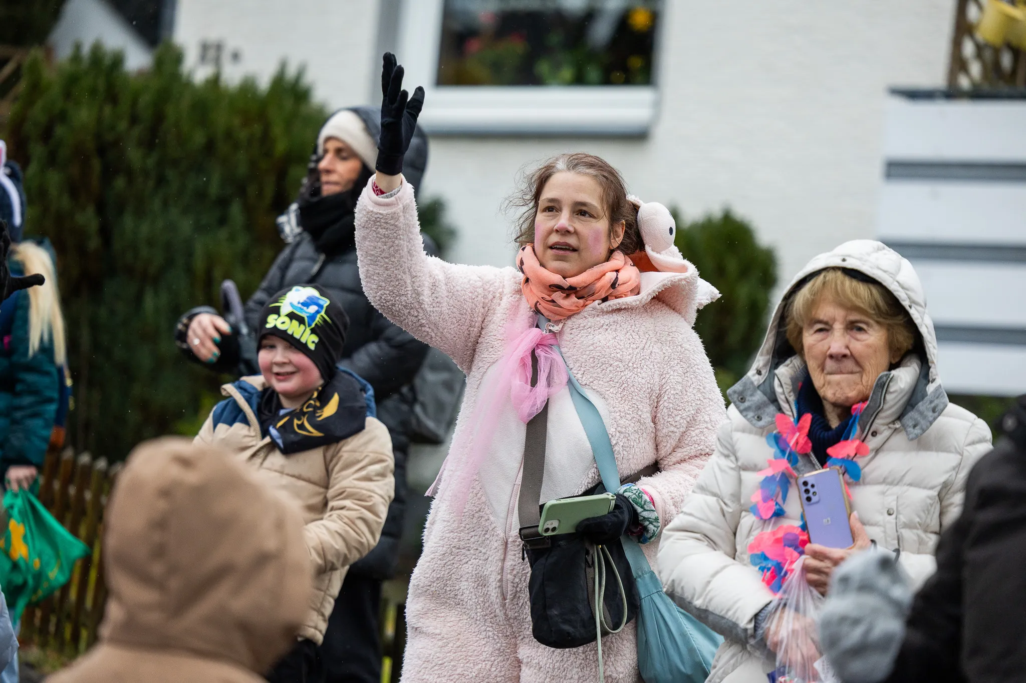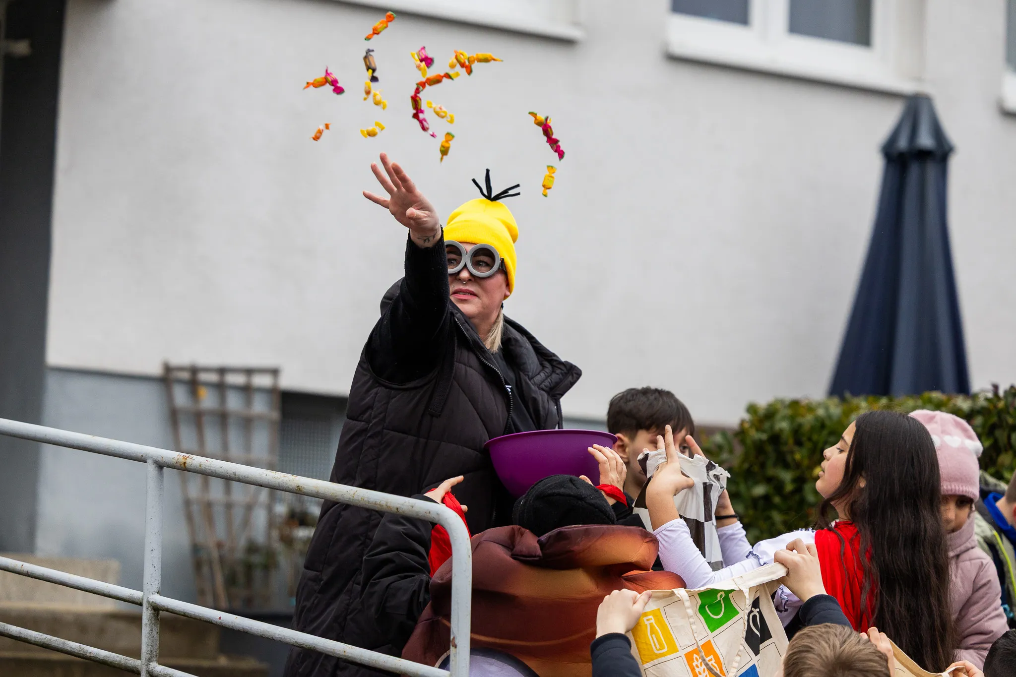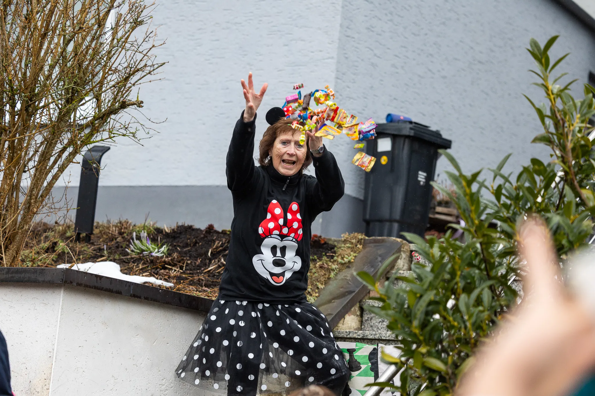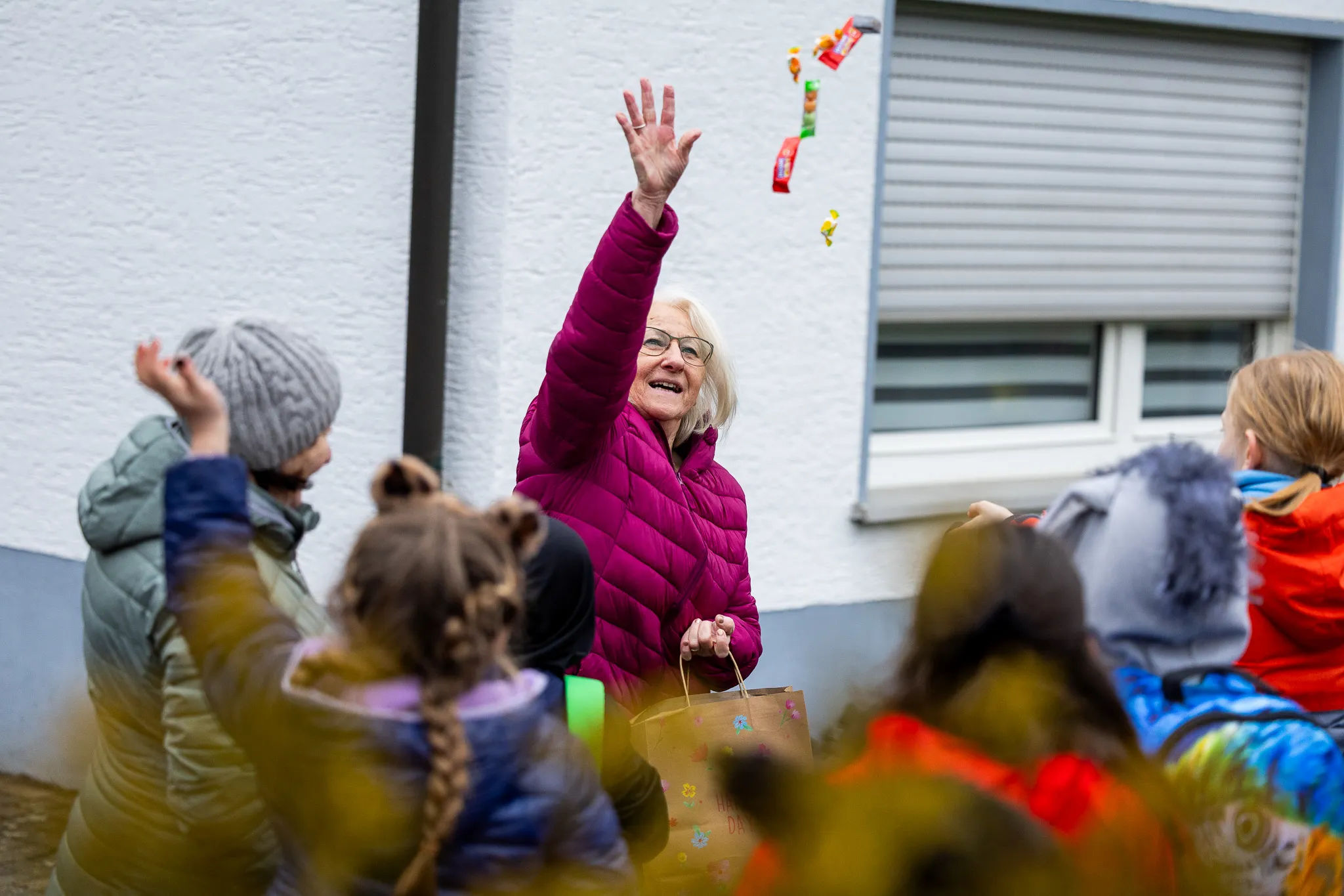 Seit mehr als 50 Jahren ist es Tradition in Oberbrügge, dass die Zuschauer den Umzug der Kinder mit Musik und vielen „Kamelle“ begleiten. „In solchen Dörfern funktioniert das einfach besser. Wir sind dankbar für die Anwohner, die hier Süßigkeiten verschenken“, sagt die kommissarische Schulleiterin Simone Domke. „Ein besonderer Höhepunkt für die Kinder ist der Stopp an der Tagespflege, weil die Senioren dann alle herauskommen, um Kamelle an die Kinder zu verteilen.“