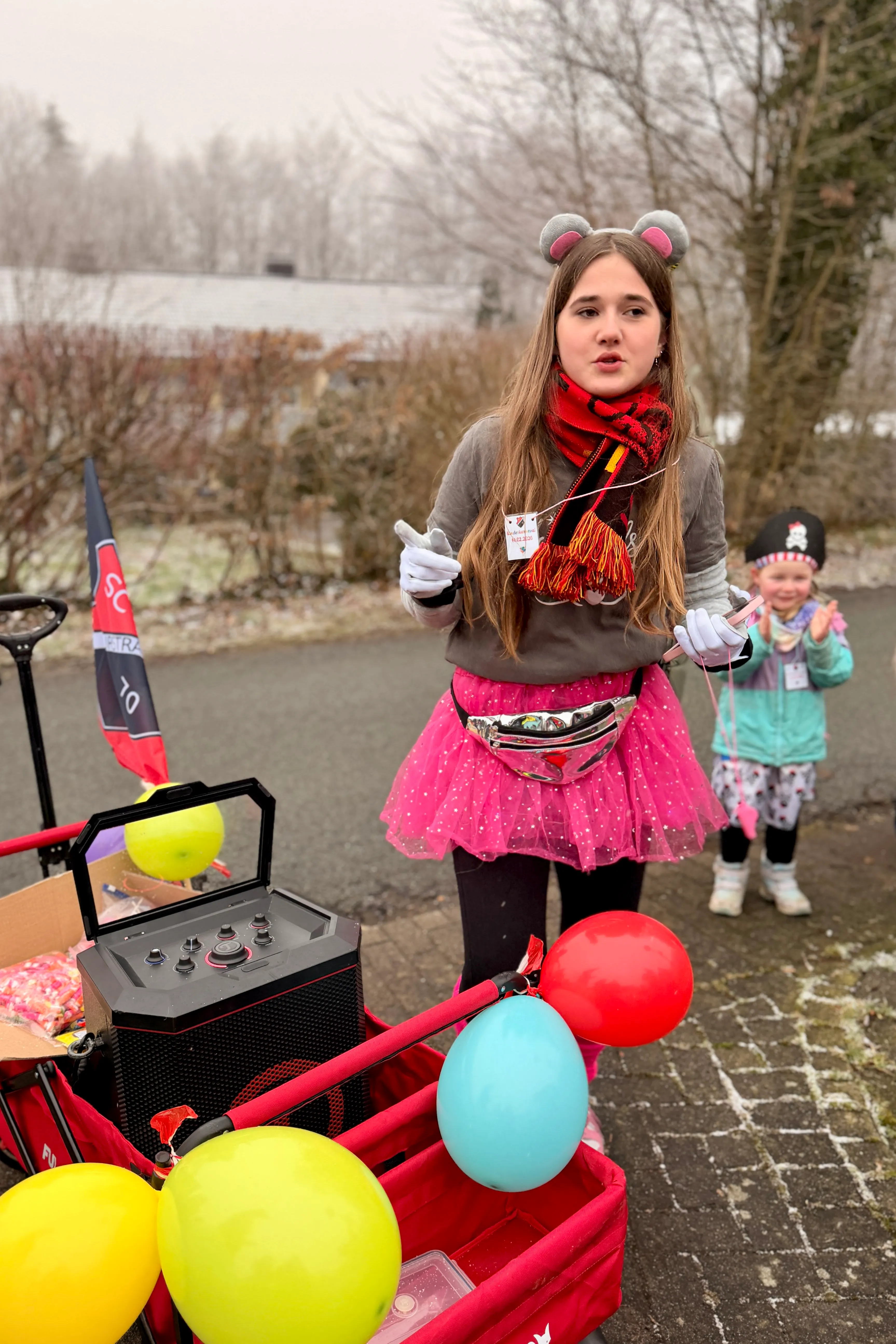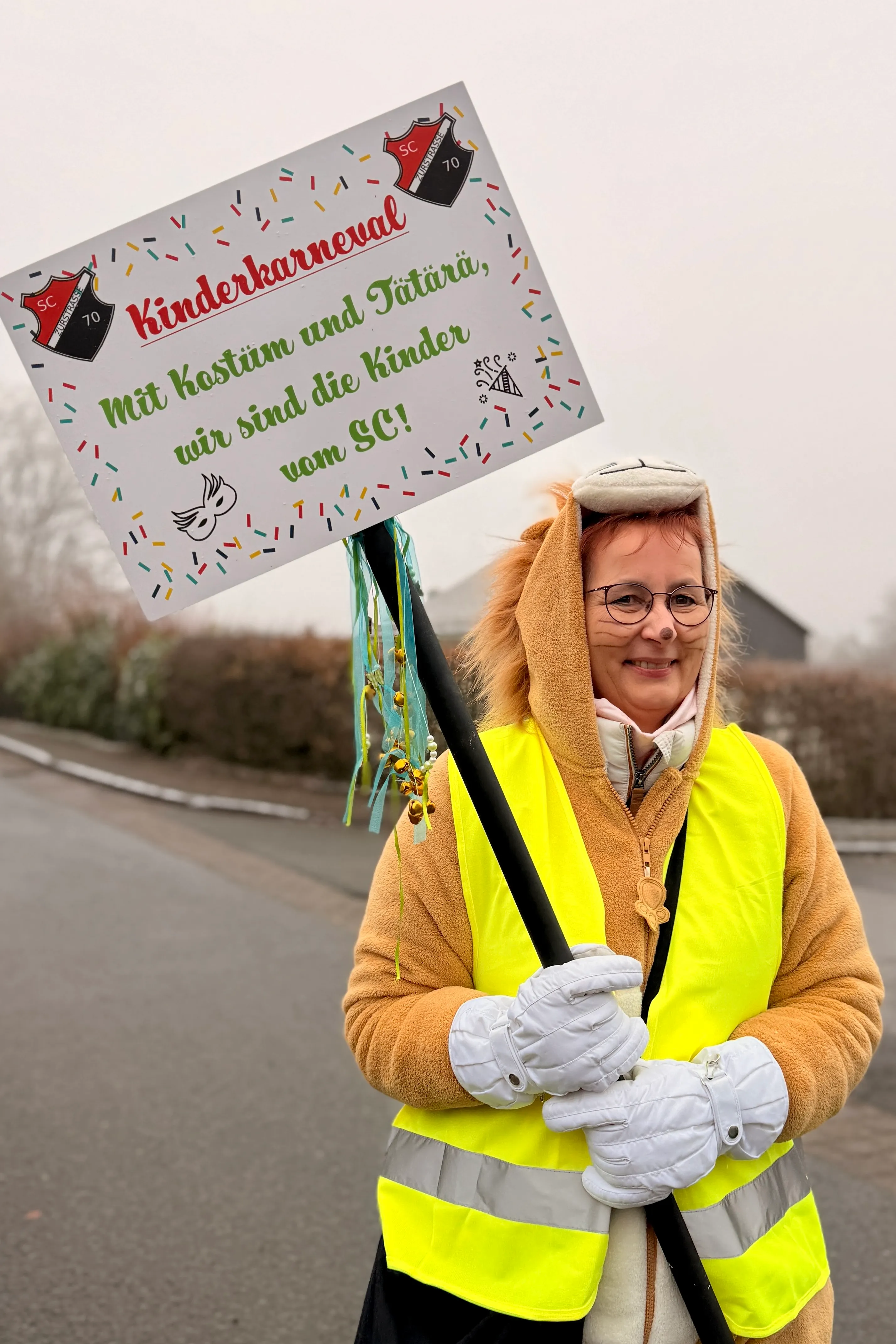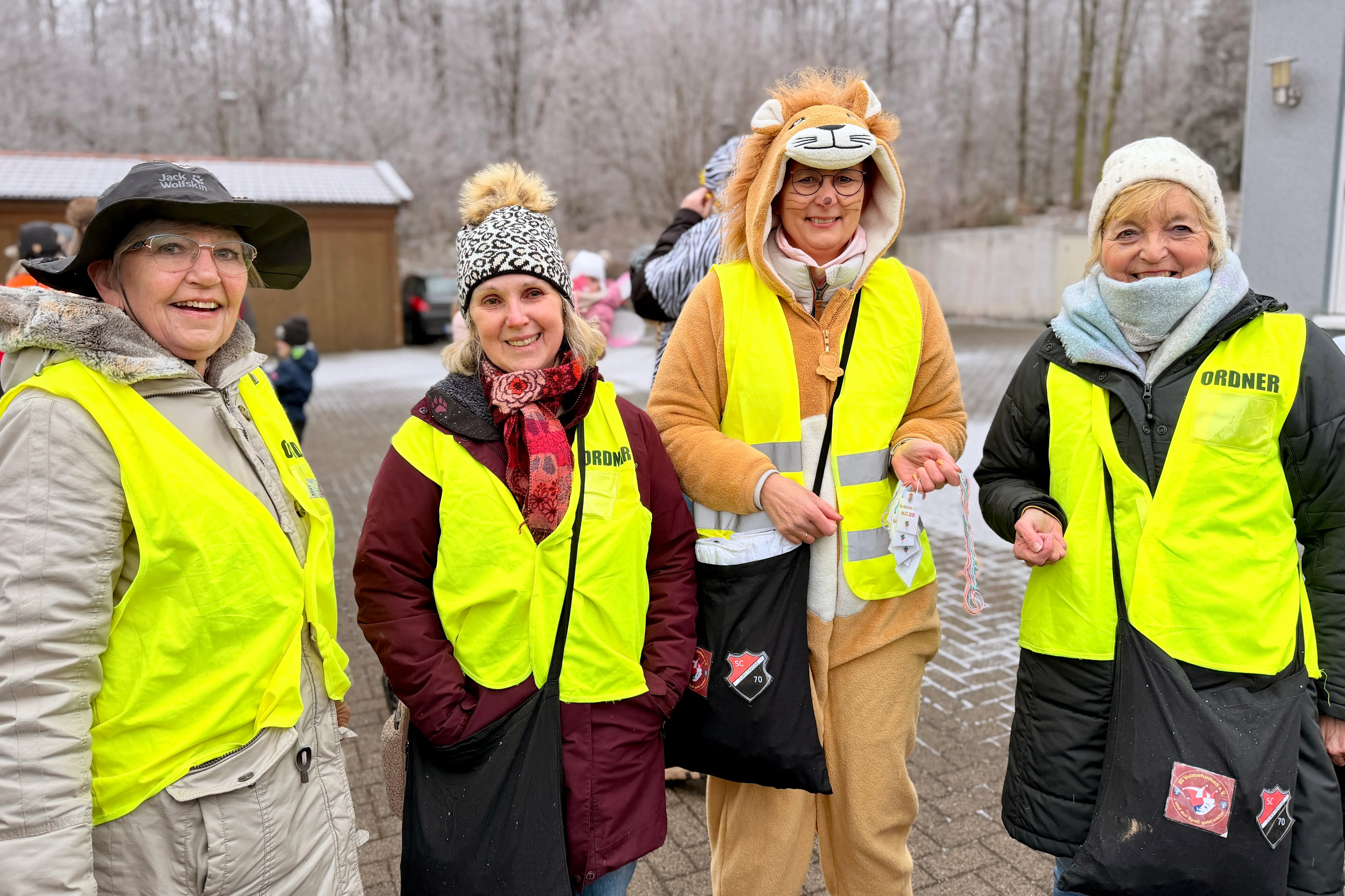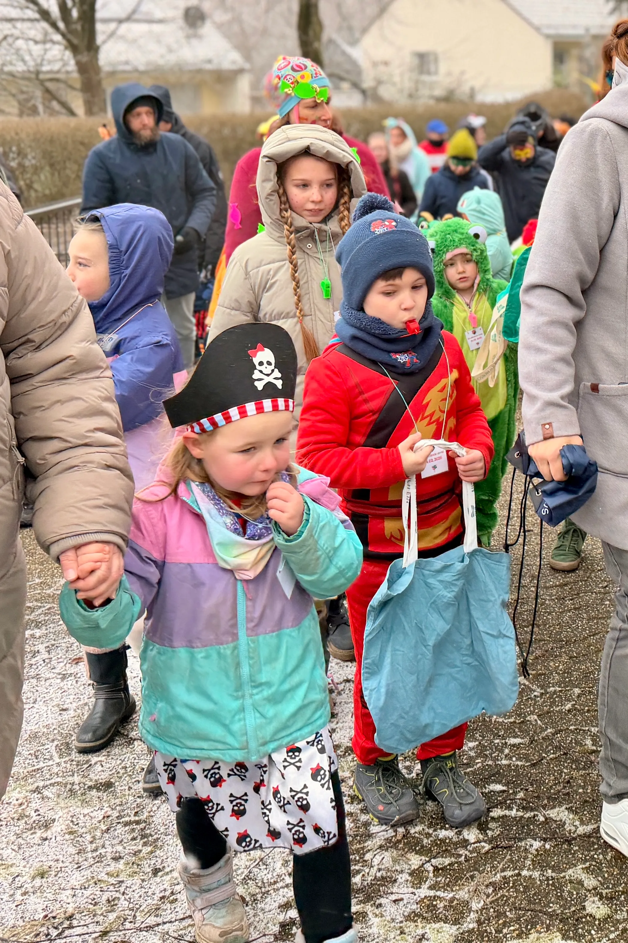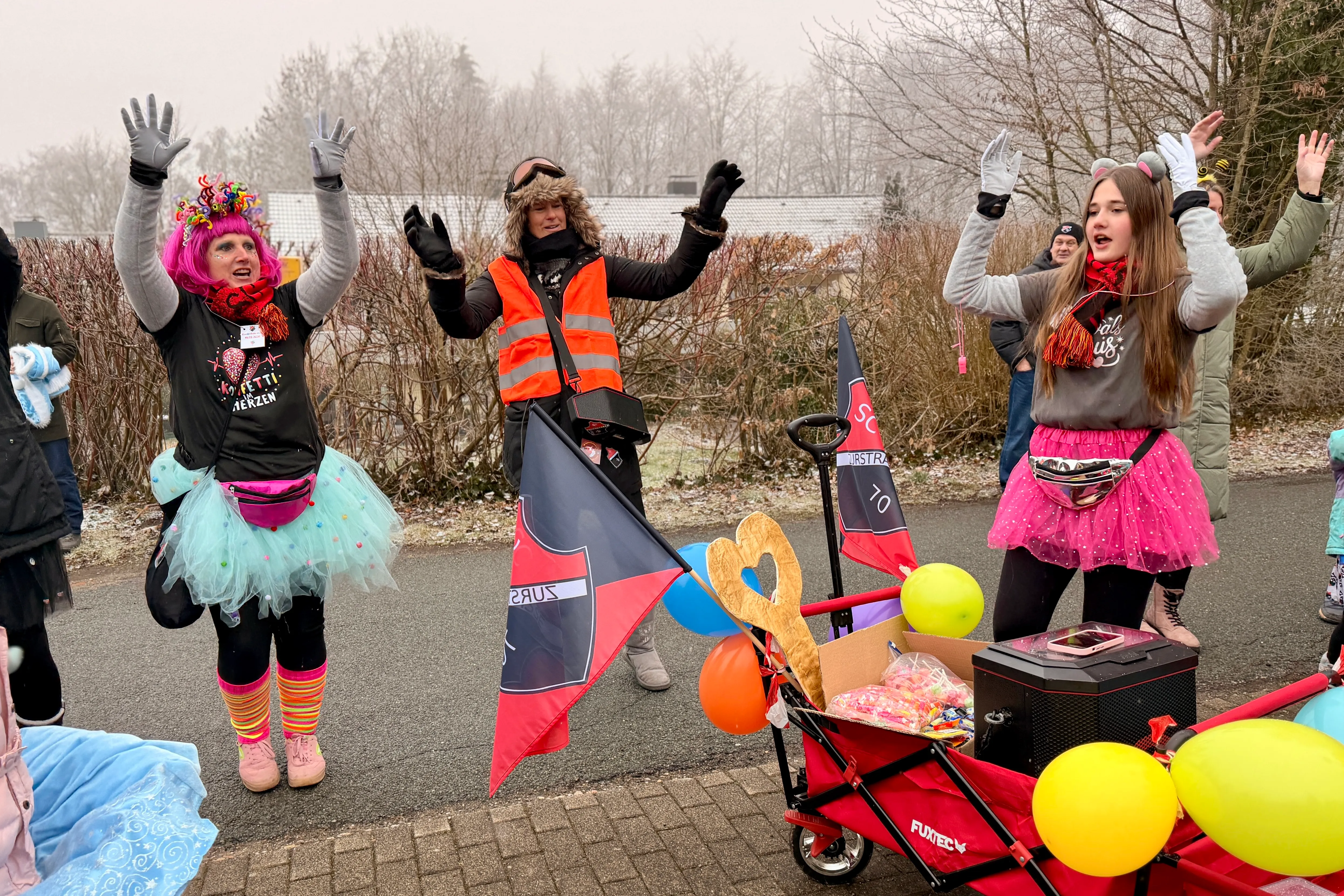 Mit der Hand auf dem Herzen stimmte sie alle auf den Schlachtruf ein und ein dreifaches „SC Zurstrasse“ hallte über den Platz. Danach wurden Trillerpfeifen verteilt. „Damit wir gleich richtig gut zu hören sind, wenn wir durch die Ortschaft ziehen“, kündigte Meinker an. Ein Gute-Laune-Lied aus der Bluetooth-Box sorgte für den letzten Stimmungsschub – dann setzte sich der närrische Lindwurm unter dem Motto „Mit Kostüm und Täter — Wir sind die Kinder vom SC“ in Bewegung.