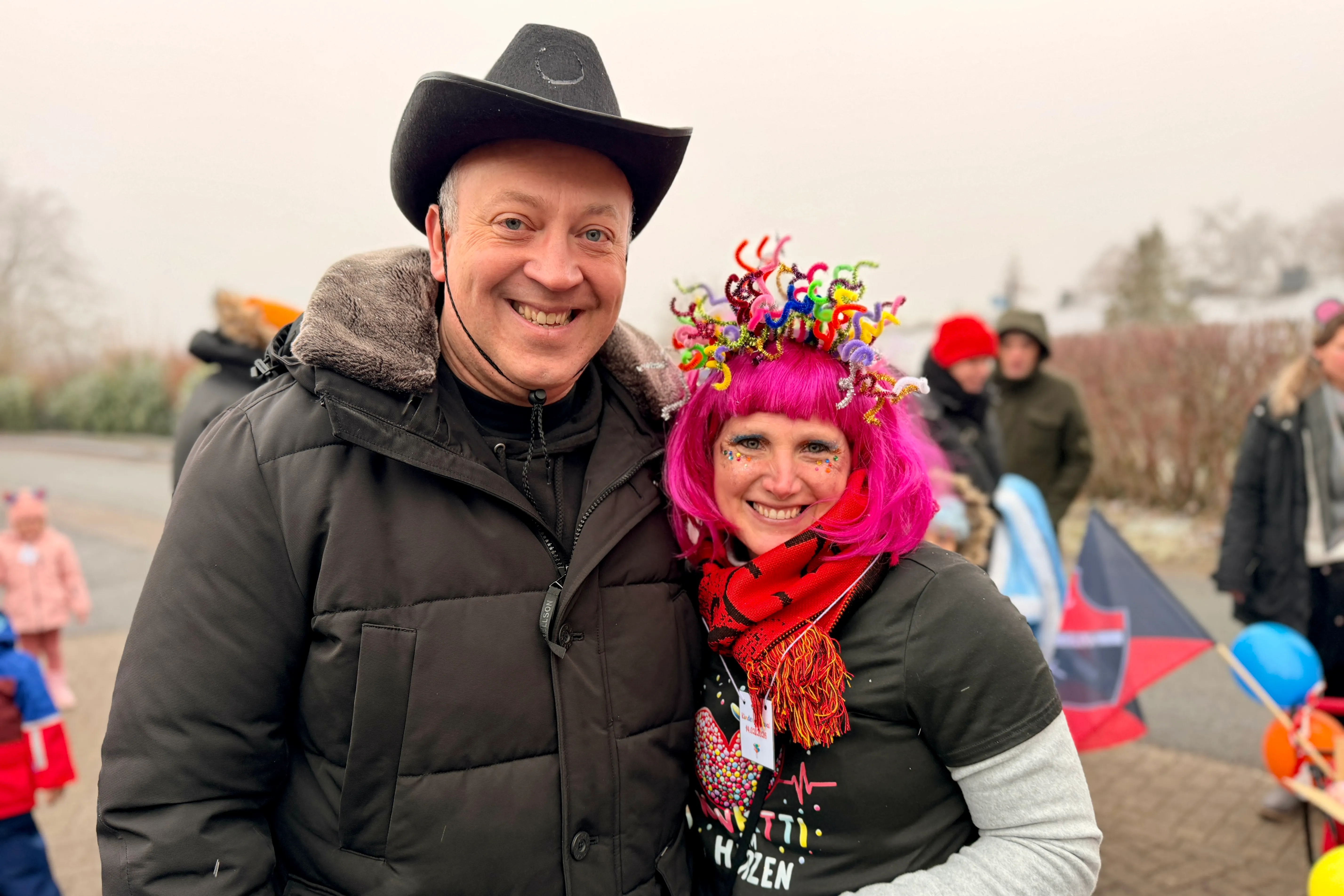 Doch Sandra Meinker winkte bescheiden ab: „Ich mache das ja nicht alleine, hinter mir stehen ganz, ganz viele andere aus dem Verein, die diese Veranstaltung unterstützen.“ Im Anschluss verlieh sie dem Bürgermeister den Karnevalsorden des SC Zurstrasse – der kurzerhand einen Ehrenplatz am Cowboyhut fand. Außerdem bedankte sie sich für die zahlreichen Süßigkeitenspenden, die später als „Kamelle“ unter die Kinder gebracht werden sollten.