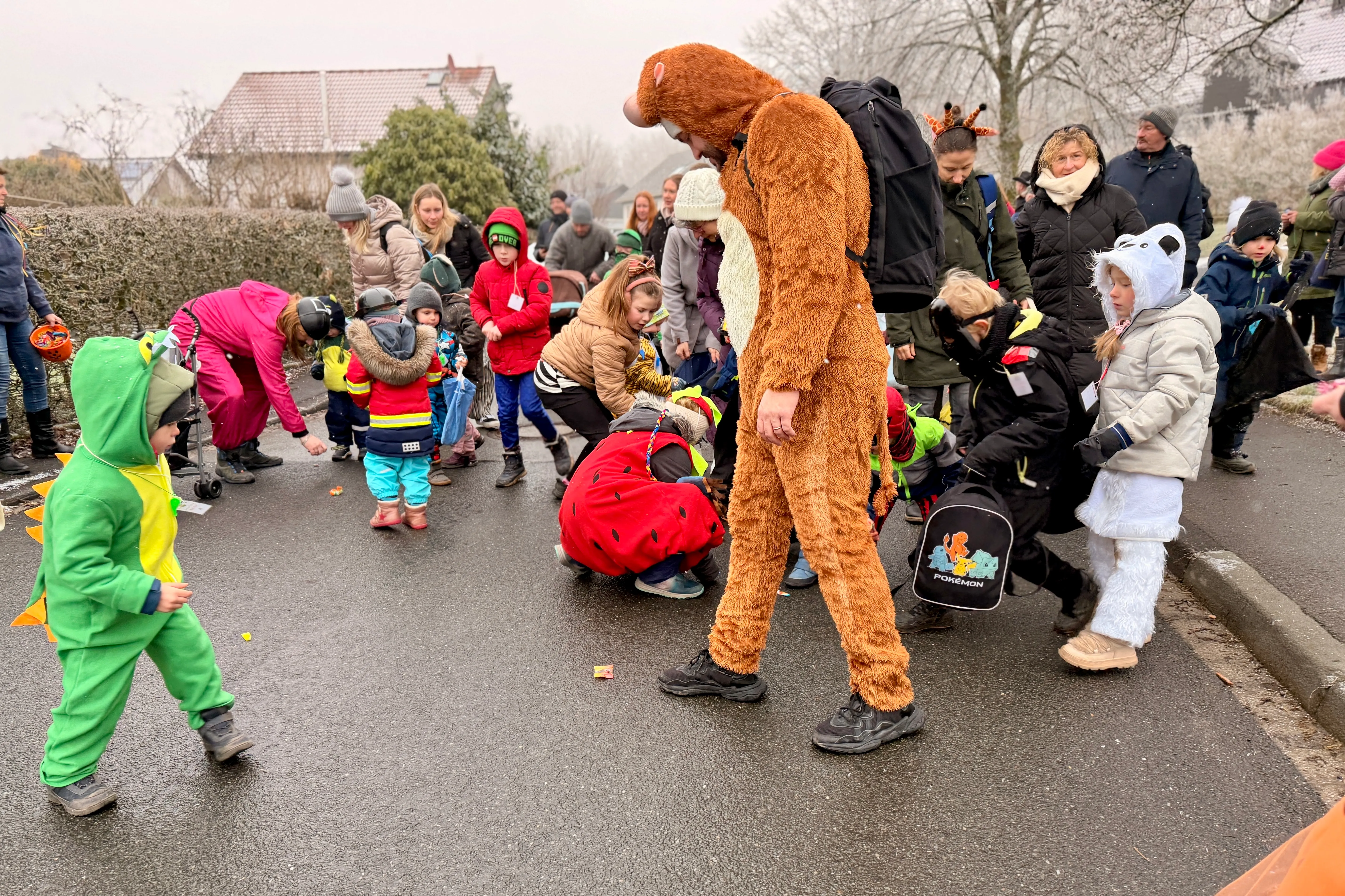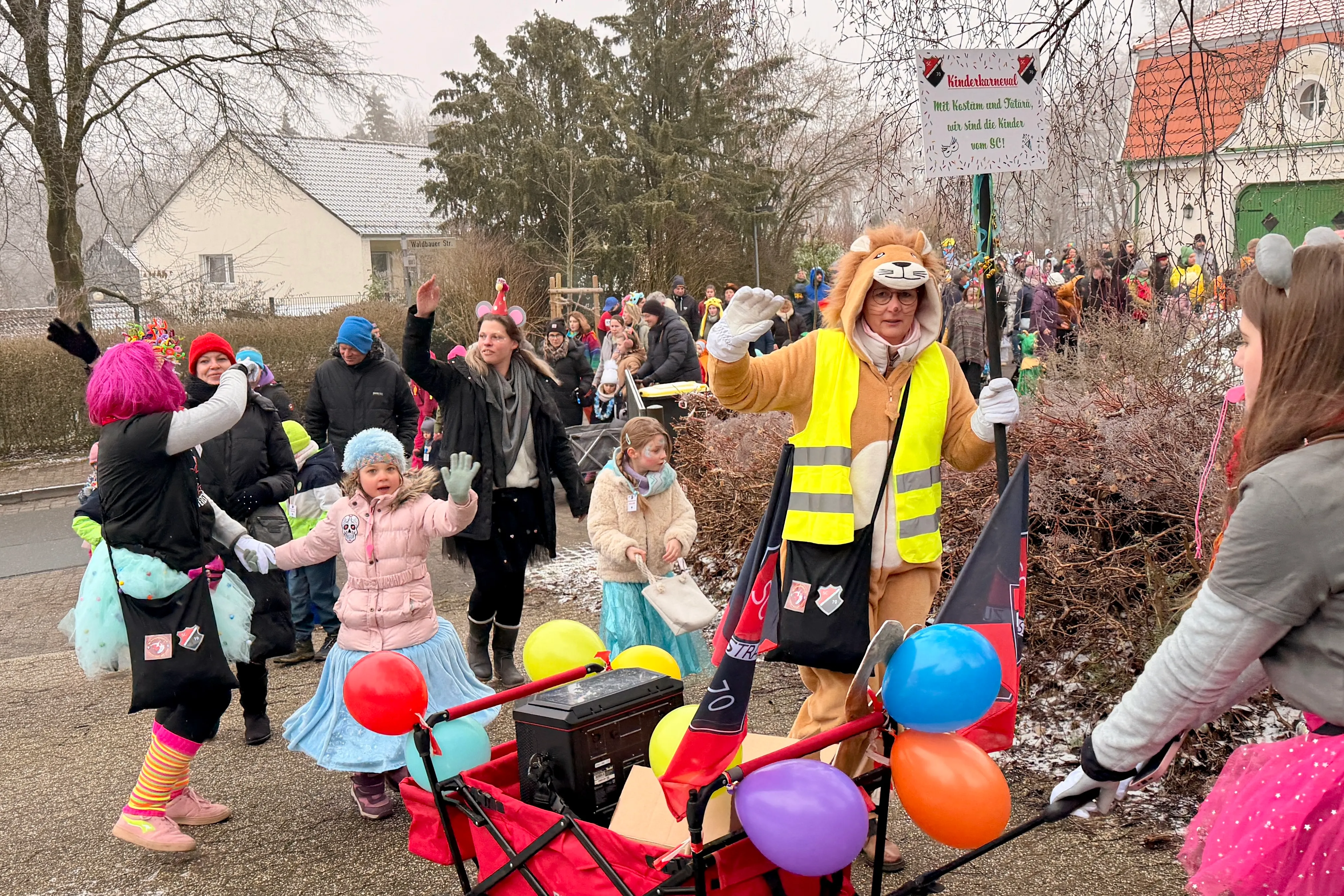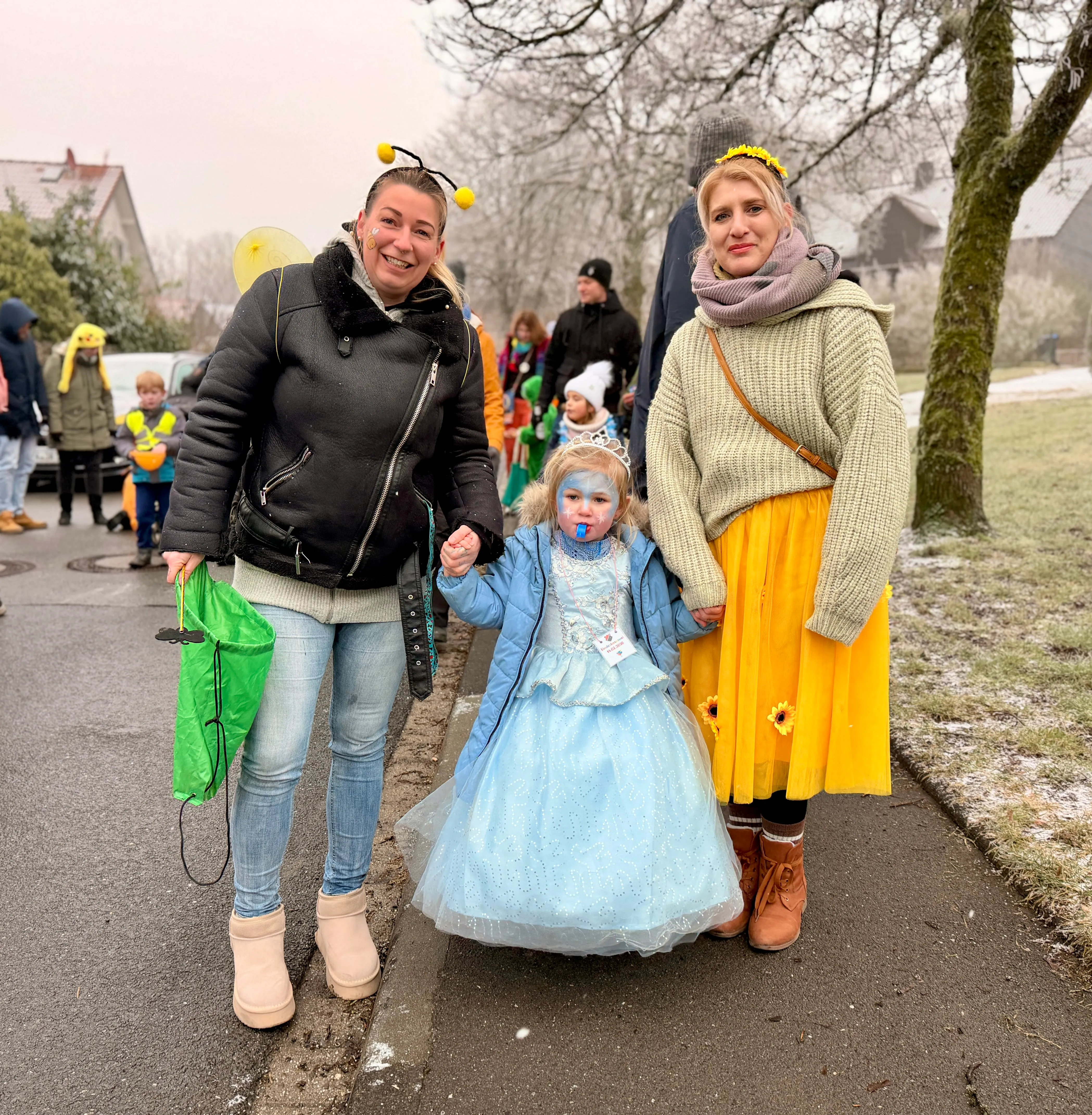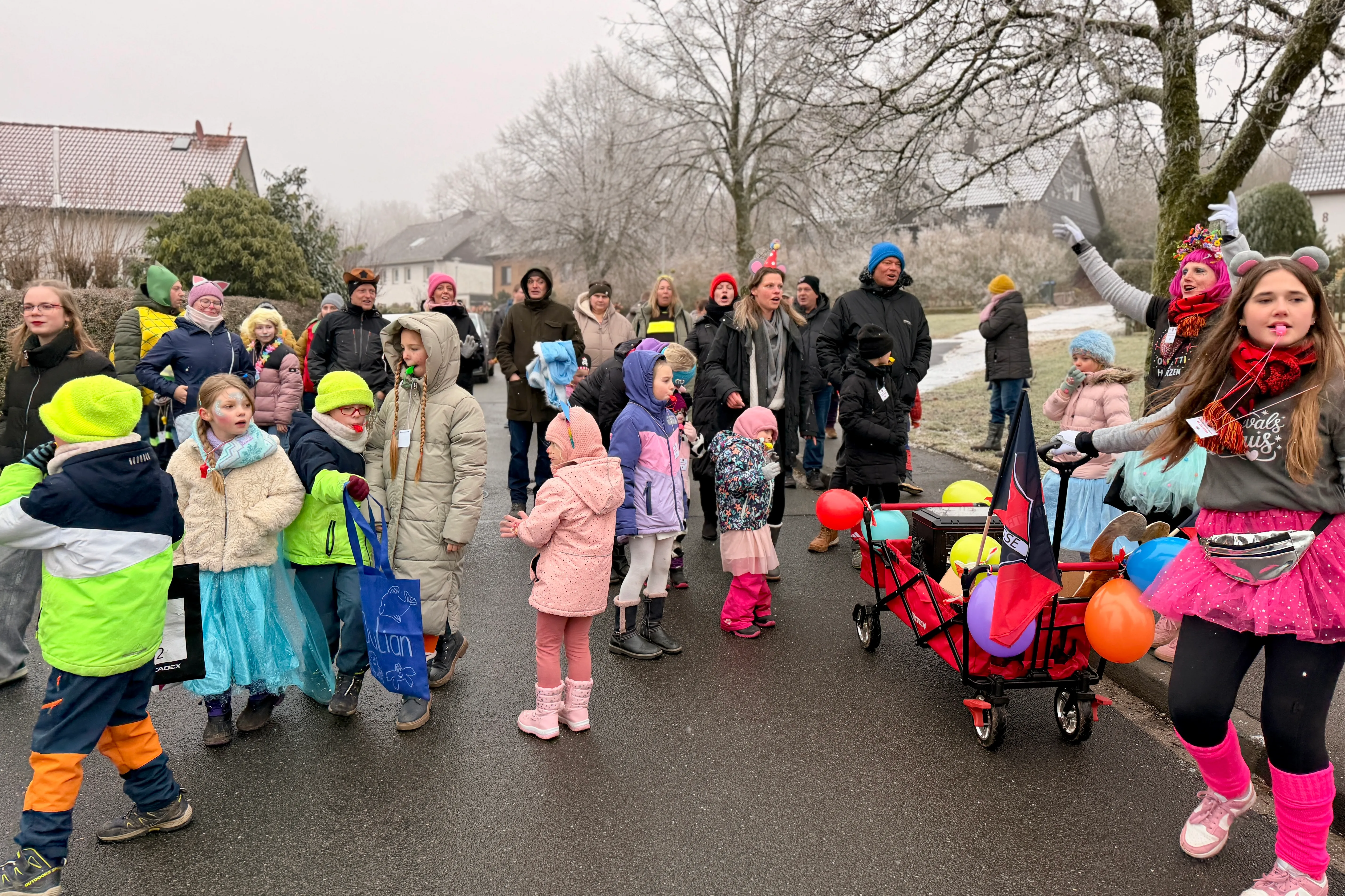 Vielerorts warteten Passanten und Anwohner bereits auf die bunte Schar — und ließen Kamelle regnen. Für die kleinen Jecken ein Riesenspaß, auch wenn die Temperaturen knapp über dem Gefrierpunkt lagen und der einstündige Fußmarsch so manch einen ein wenig frösteln ließ.