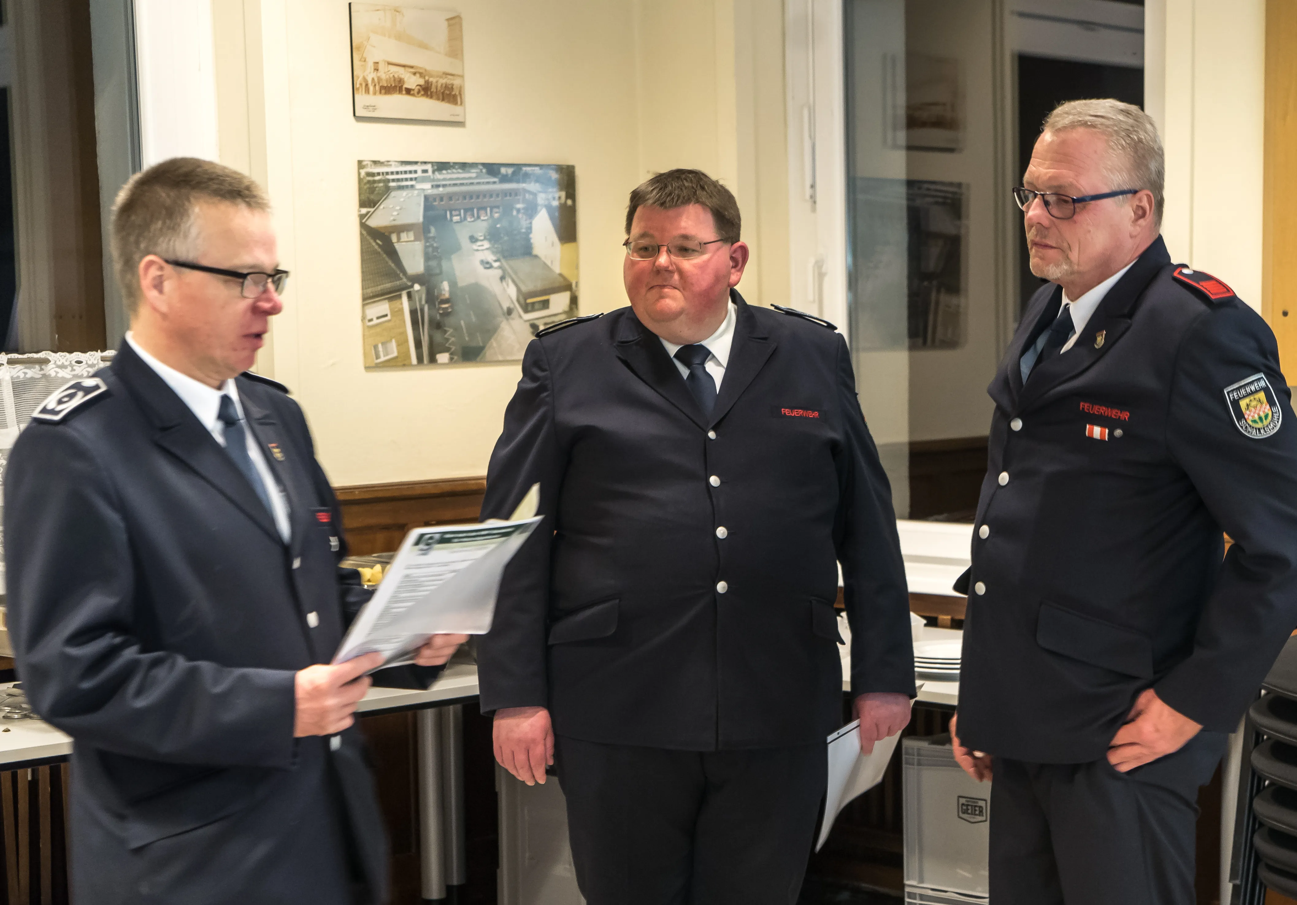 Drei Beförderungen wurden vorgenommen: Lewin Humme und Yanik Schmid jeweils vom Feuerwehrmann zum Oberfeuerwehrmann, sowie Gavin Kämper vom Brandmeister zum Oberbrandmeister.