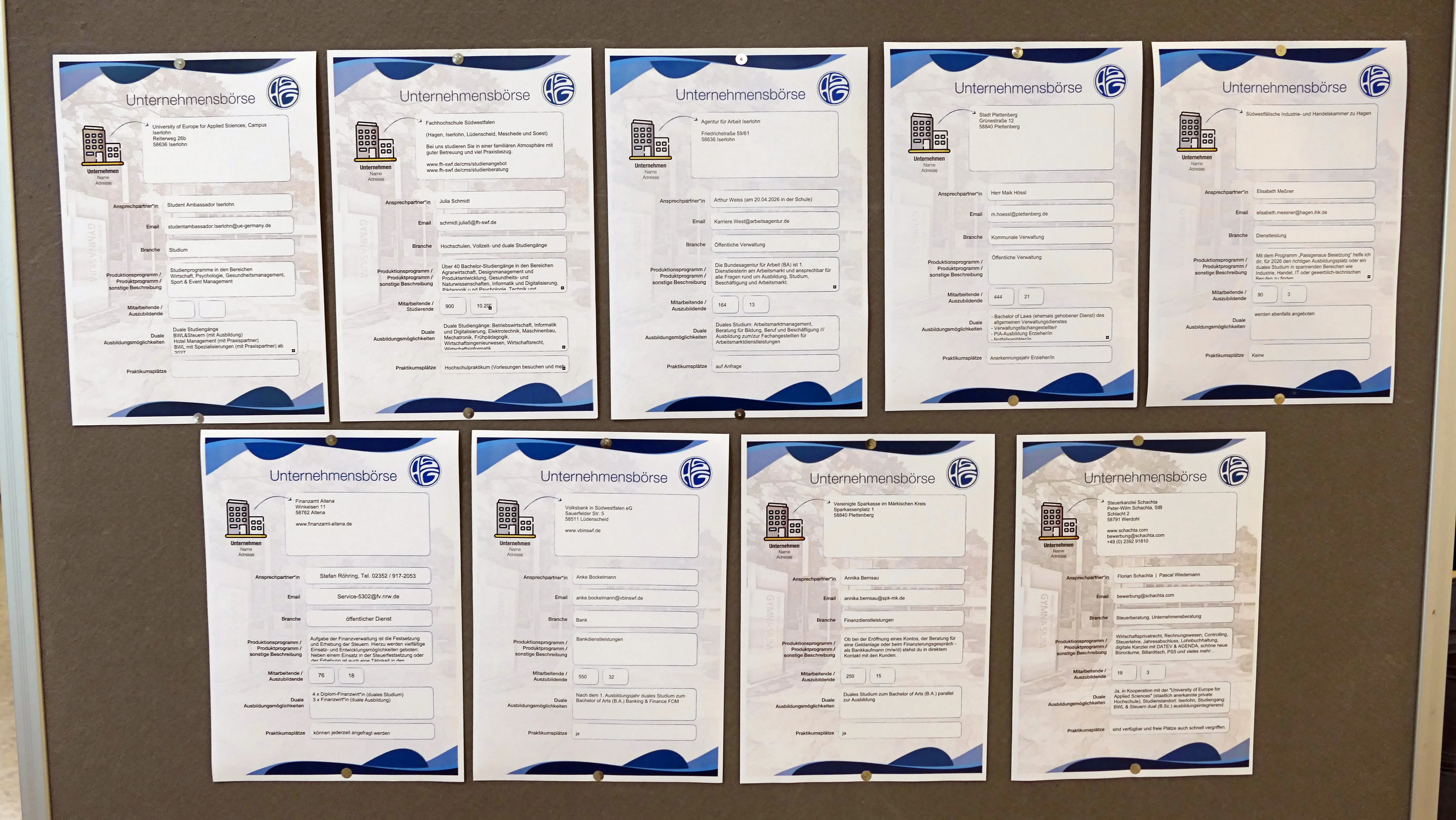 Zur Vorbereitung konnten sich die Schüler im Foyer anhand von Unternehmenssteckbriefen informieren. Die eigentlichen Gespräche fanden anschließend in Klassenräumen statt. Zwischen 13.30 und 15.30 Uhr nutzten viele Schüler die Gelegenheit zum direkten Austausch.