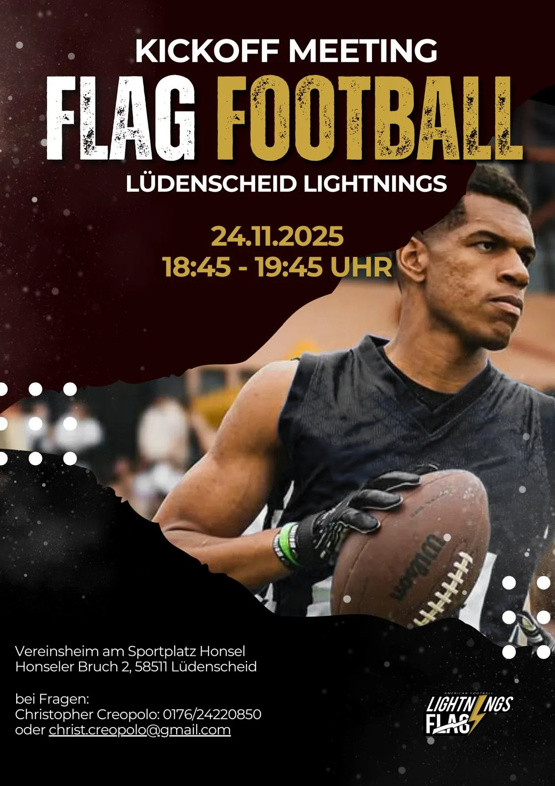 2028 wird Flagfootball eine olympische Sportart und auch in Lüdenscheid erfreut sich die amerikanische Sportart immer größerer Aufmerksamkeit. Die Lüdenscheid Lightnings wollen ihr Angebot jetzt im Seniorenbereich erweitern und gründen deshalb eine Flagfootballabteilung. Bisher gibt es schon eine Jugendabteilung und ein Ladiesteam.