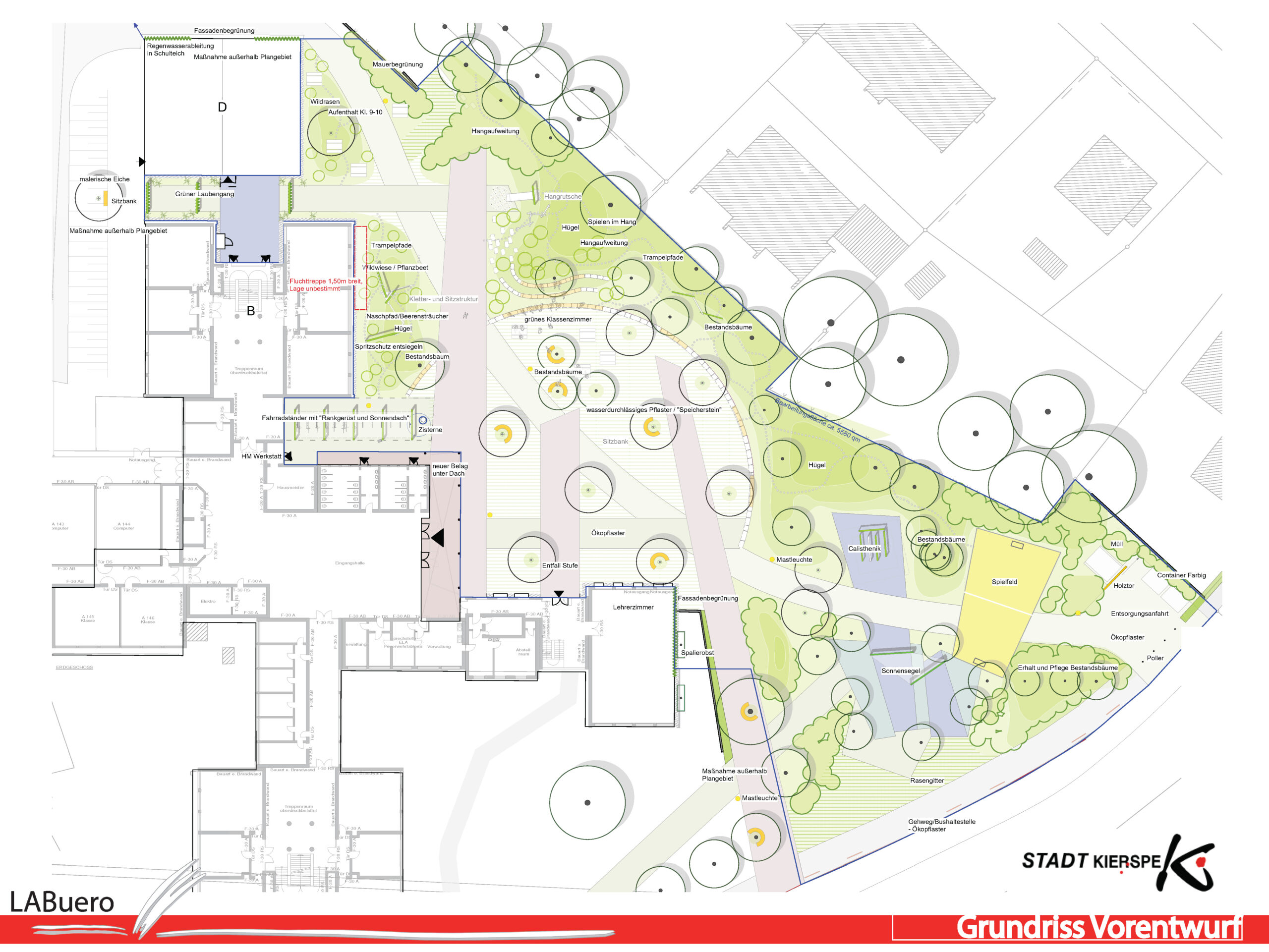 Die übrige Fläche soll nach den im Vorfeld gemeinsam erarbeiteten Vorstellungen landschaftsgärtnerisch gestaltet werden. Ziel ist es, möglichst viel Niederschlagswasser vor Ort zu verwenden, die Bepflanzung mit hitzebeständigen und regionalen Arten vorzunehmen und die Aufenthaltsqualität auf der Fläche erheblich zu verbessern. Der Schulhof könnte dann auch als Klassenzimmer im Grünen genutzt werden.