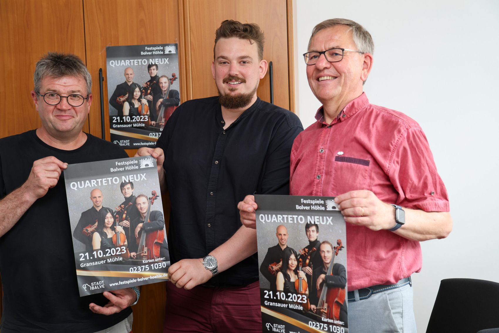 Balve. Am Samstag, 21. Oktober, gastiert „Quarteto Neux“ um 19 Uhr (Einlass 18 Uhr), in der Gransauer Mühle. Die Musiker, deren Programm und die Gründe für den Umzug von der großen Balver Höhle in die familiäre Gransauer Mühle, stellten Vorsitzender Lukas Koch, Pressesprecher Thomas Münch vom Verein Festspiele Balver Höhle sowie Michael Bathe, Allgemeiner Vertreter des Balver Bürgermeisters, jetzt im Rathaus vor.
