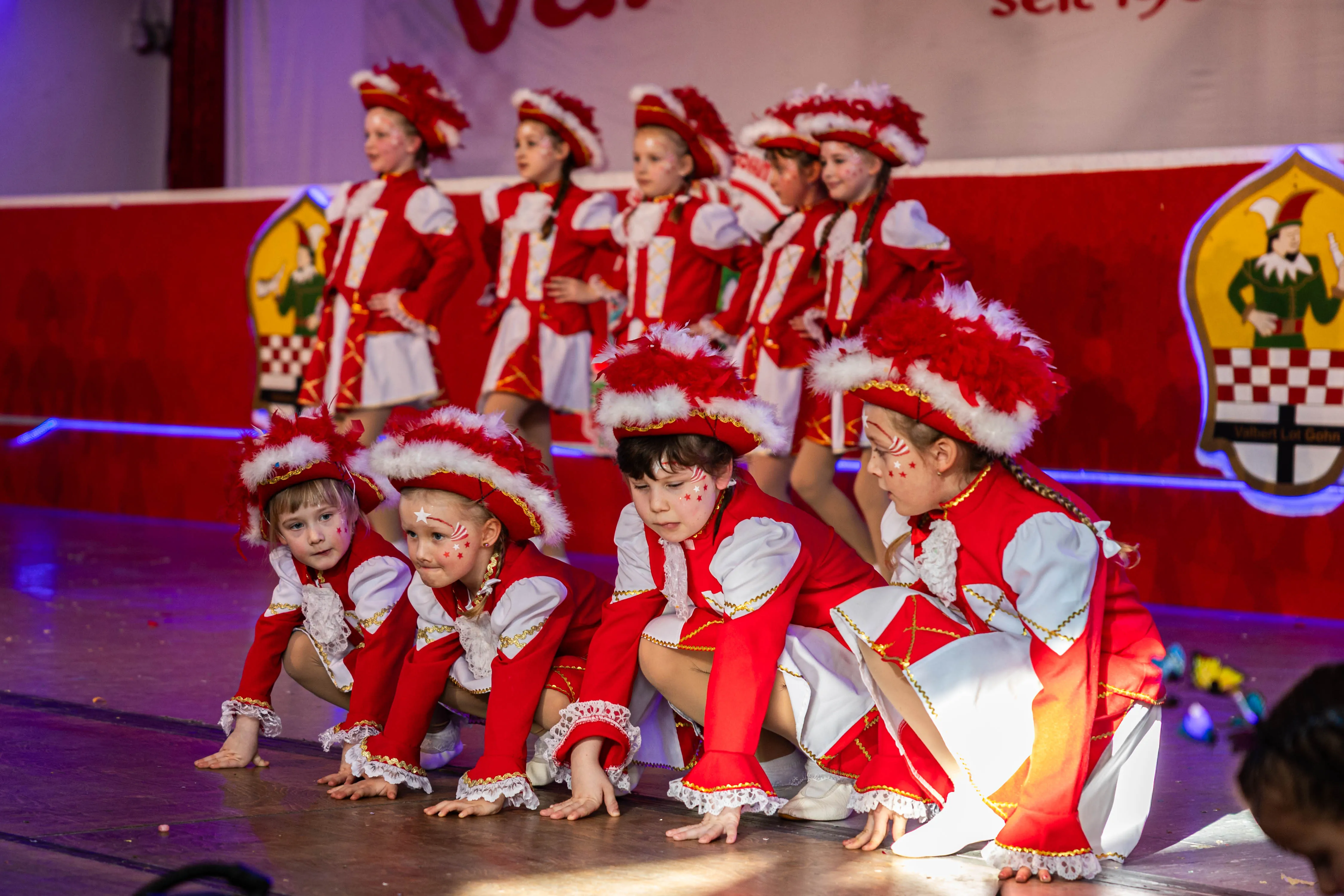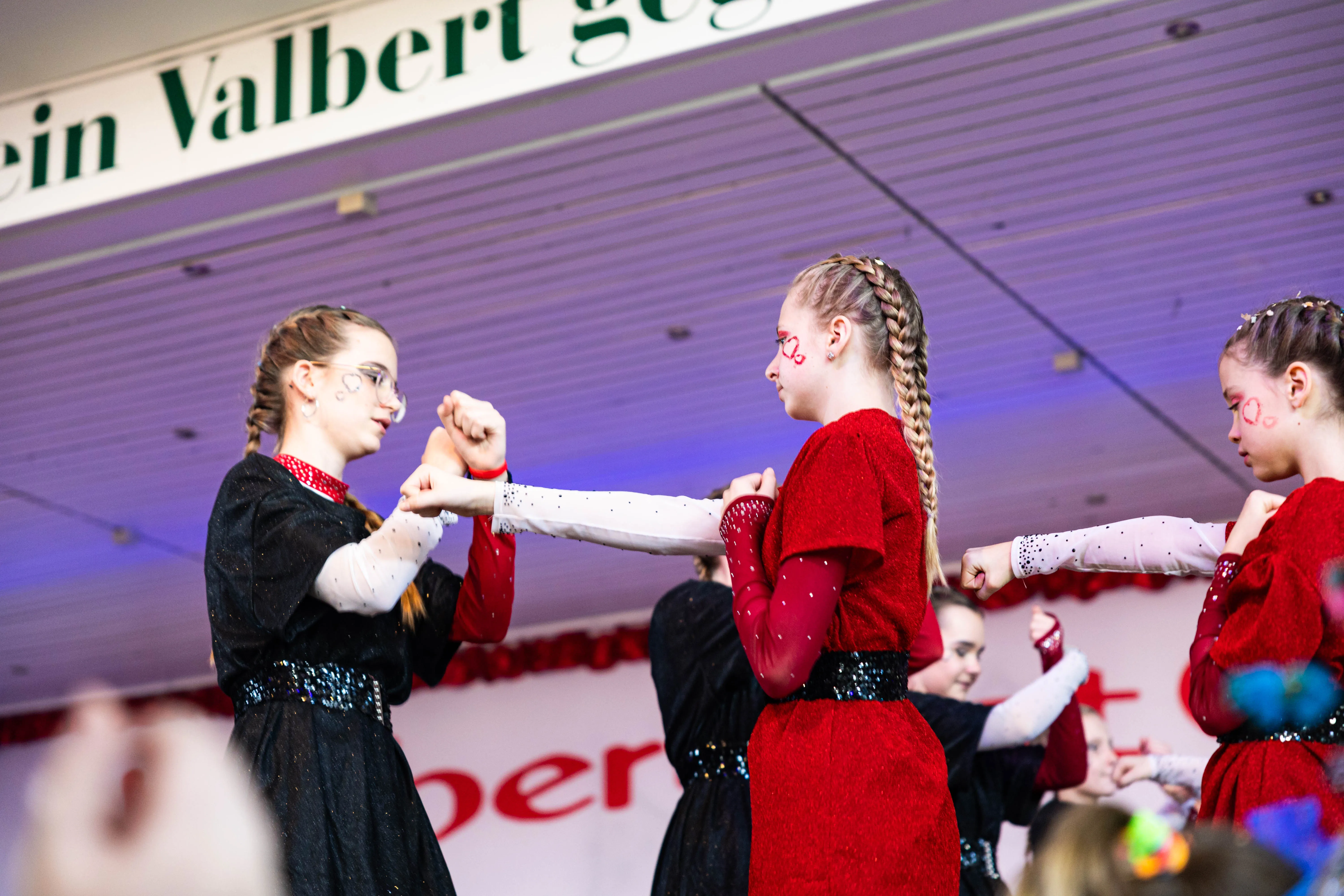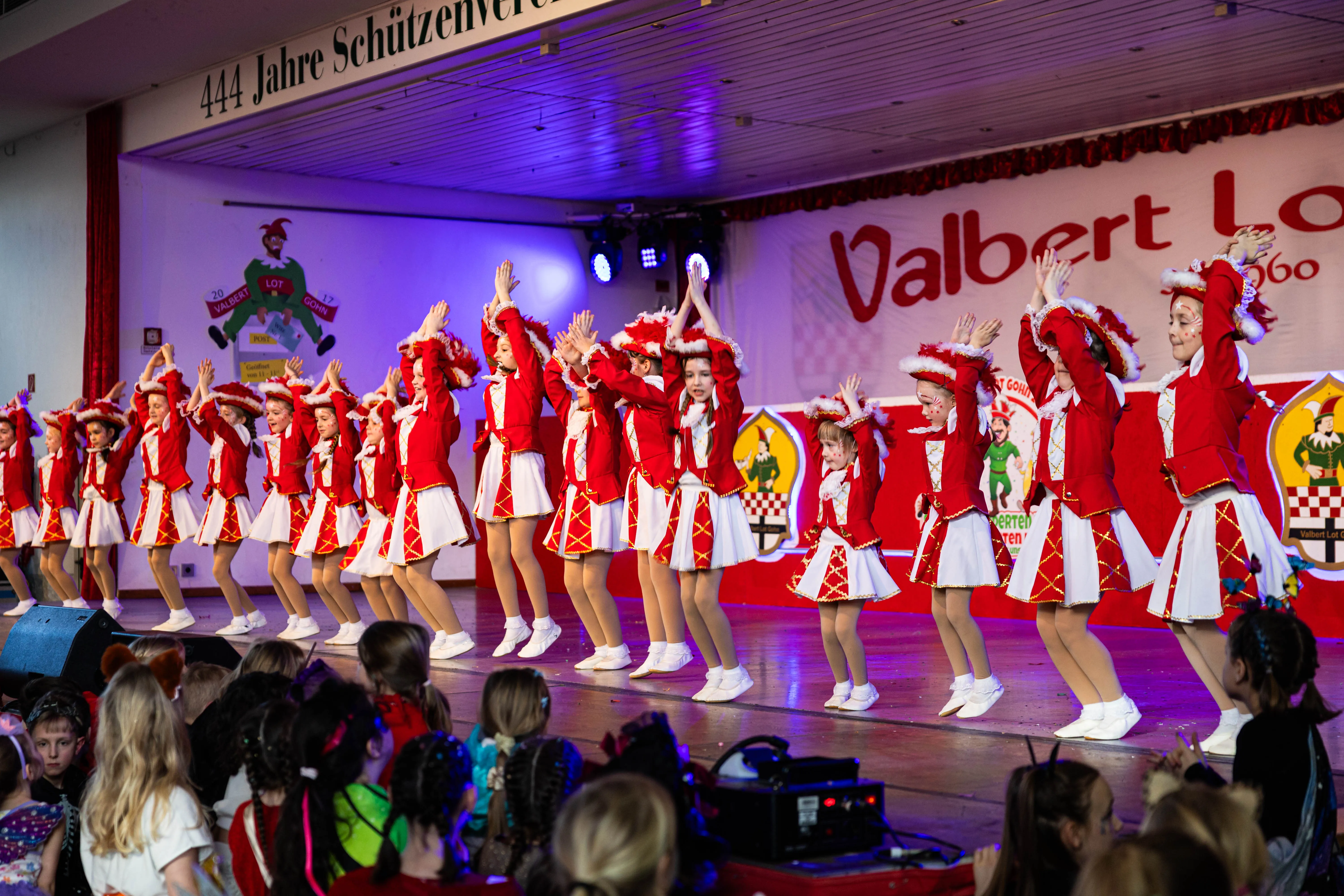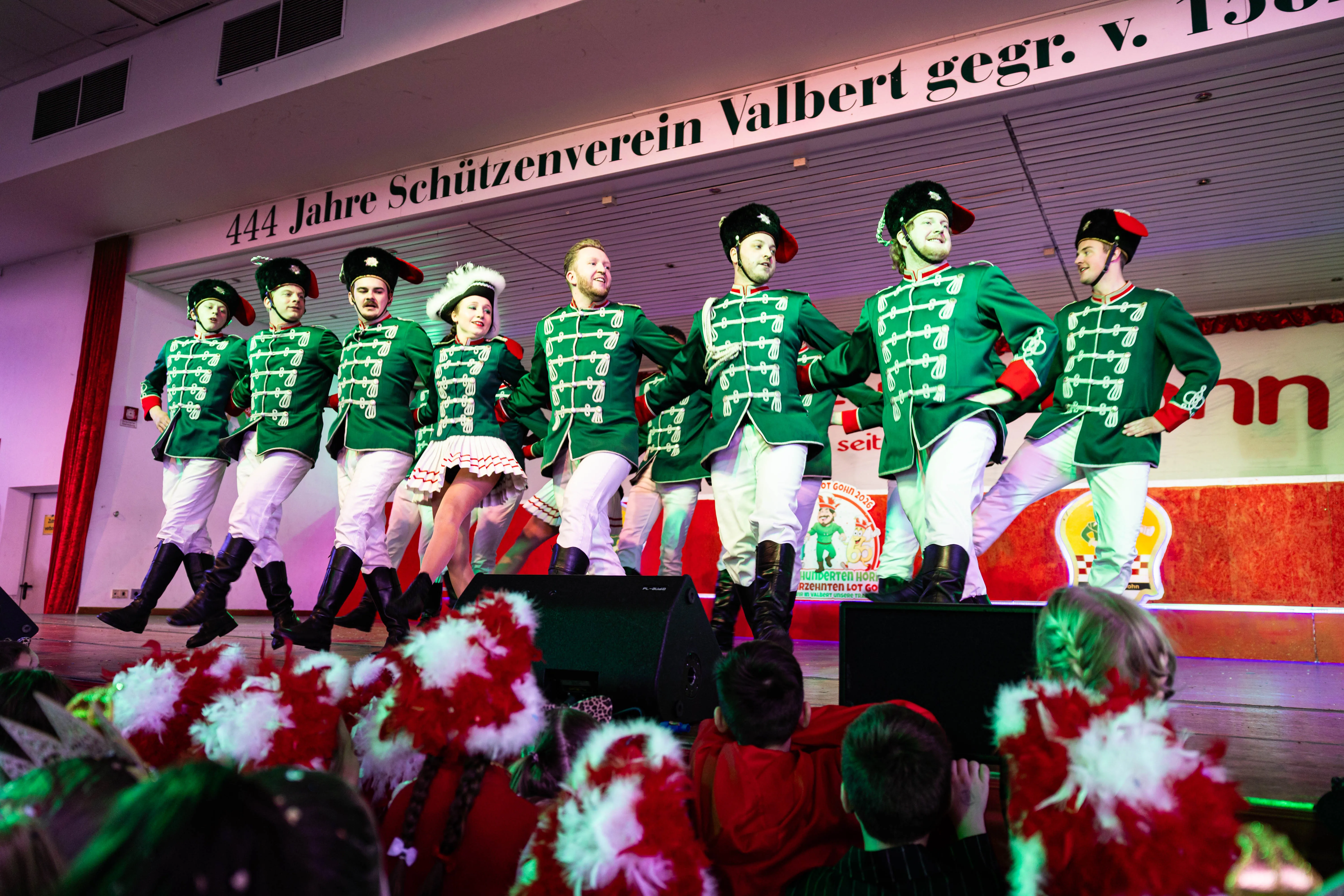 Für viele Kinder waren vermutlich die Tanzpausen das Highlight — denn dann konnten sie auf der großen Bühne immer wieder spielen, toben und tanzen. Moderator Dominik Busch im Comic-Anzug hatte jedenfalls zum Ende der Pause hin immer wieder Mühe, die Kinder zum Verlassen der Bühne zu bewegen. Der Platz auf der Bühne wurde jedoch für die fünf eigenen Garden der Valberter sowie die Gäste vom Miniballett Neu-Listernohl sowie des Schützenvereins Welschen Ennest benötigt, die zum wiederholten Mal in der Session ihr Können zeigten.
