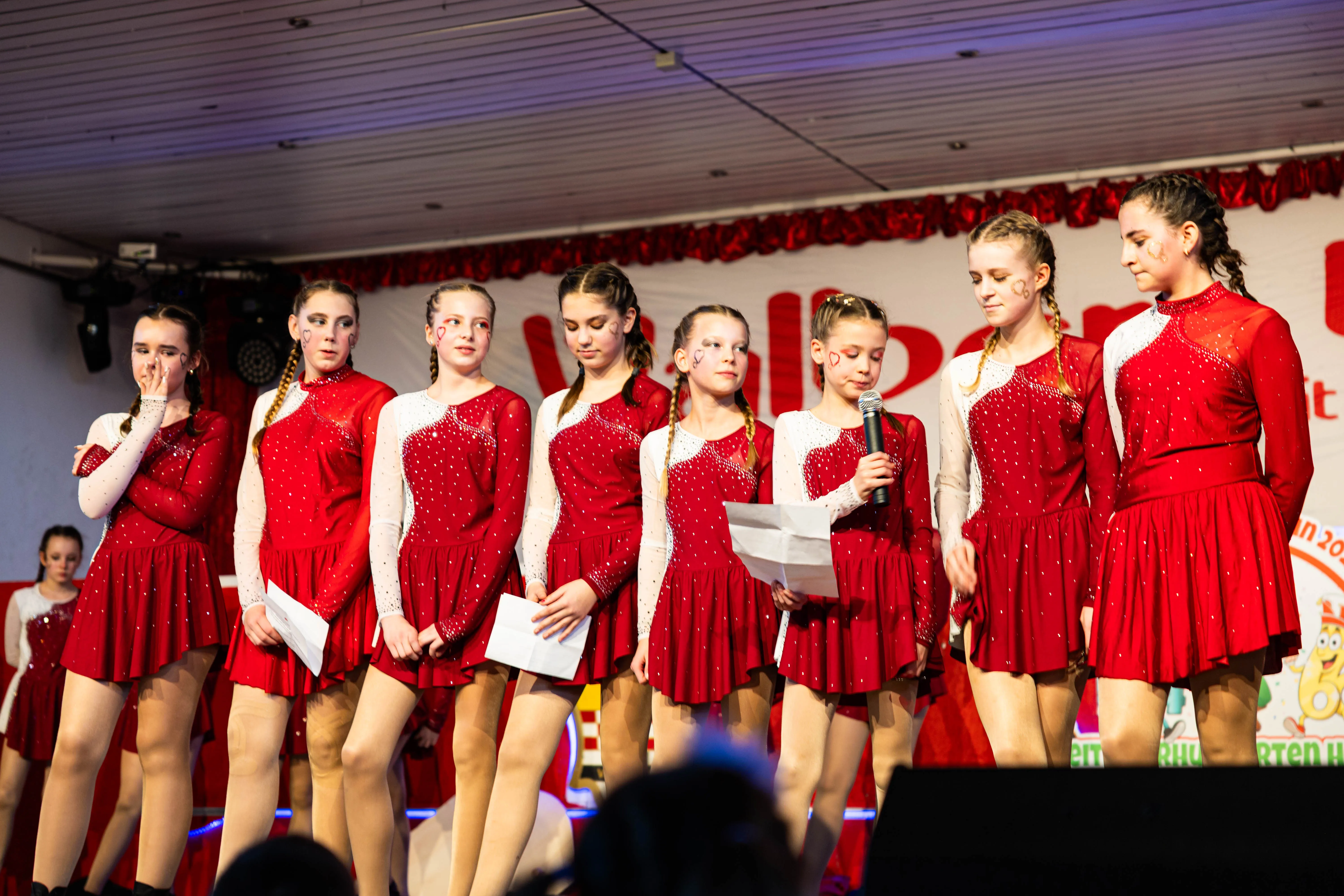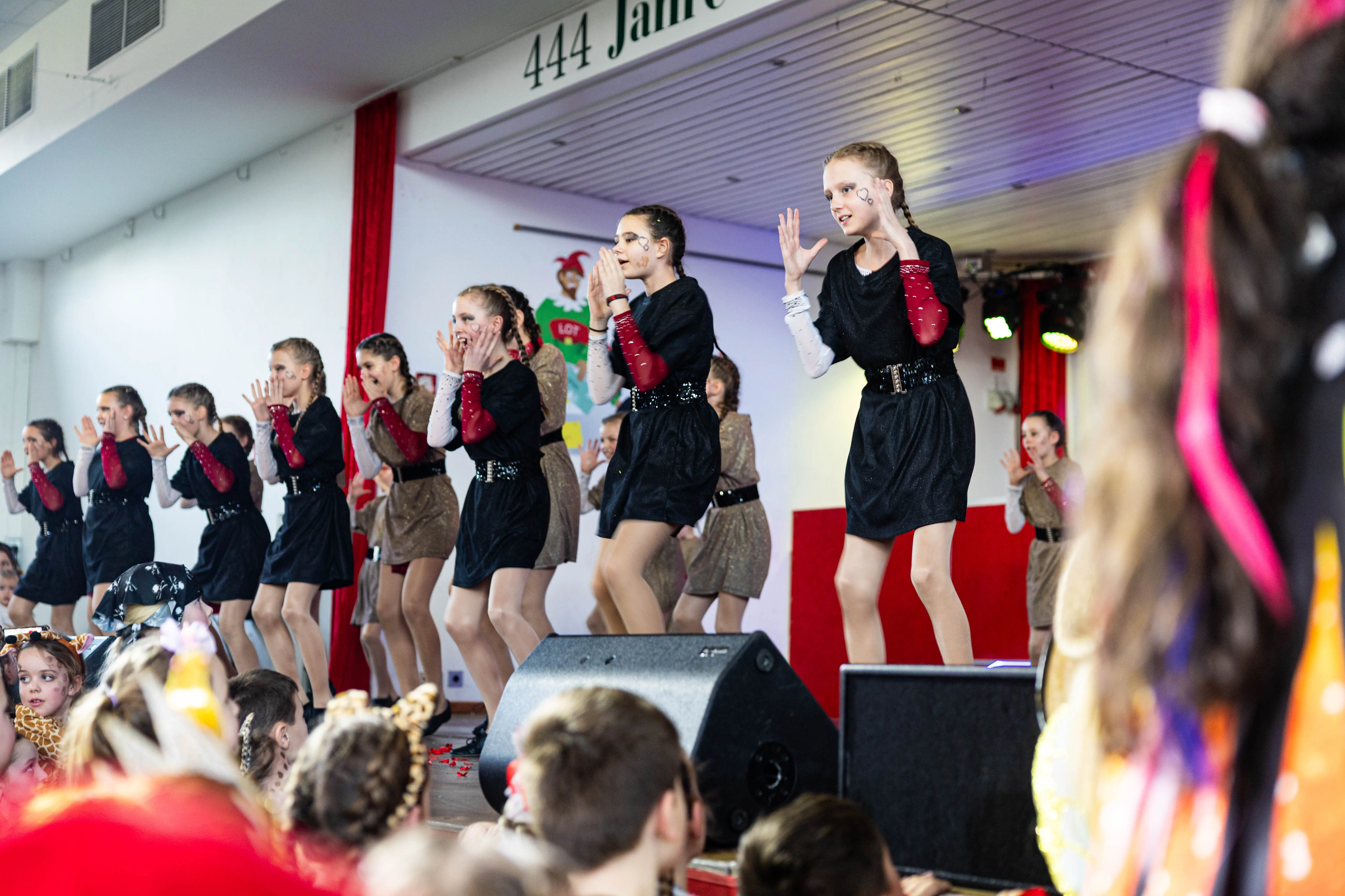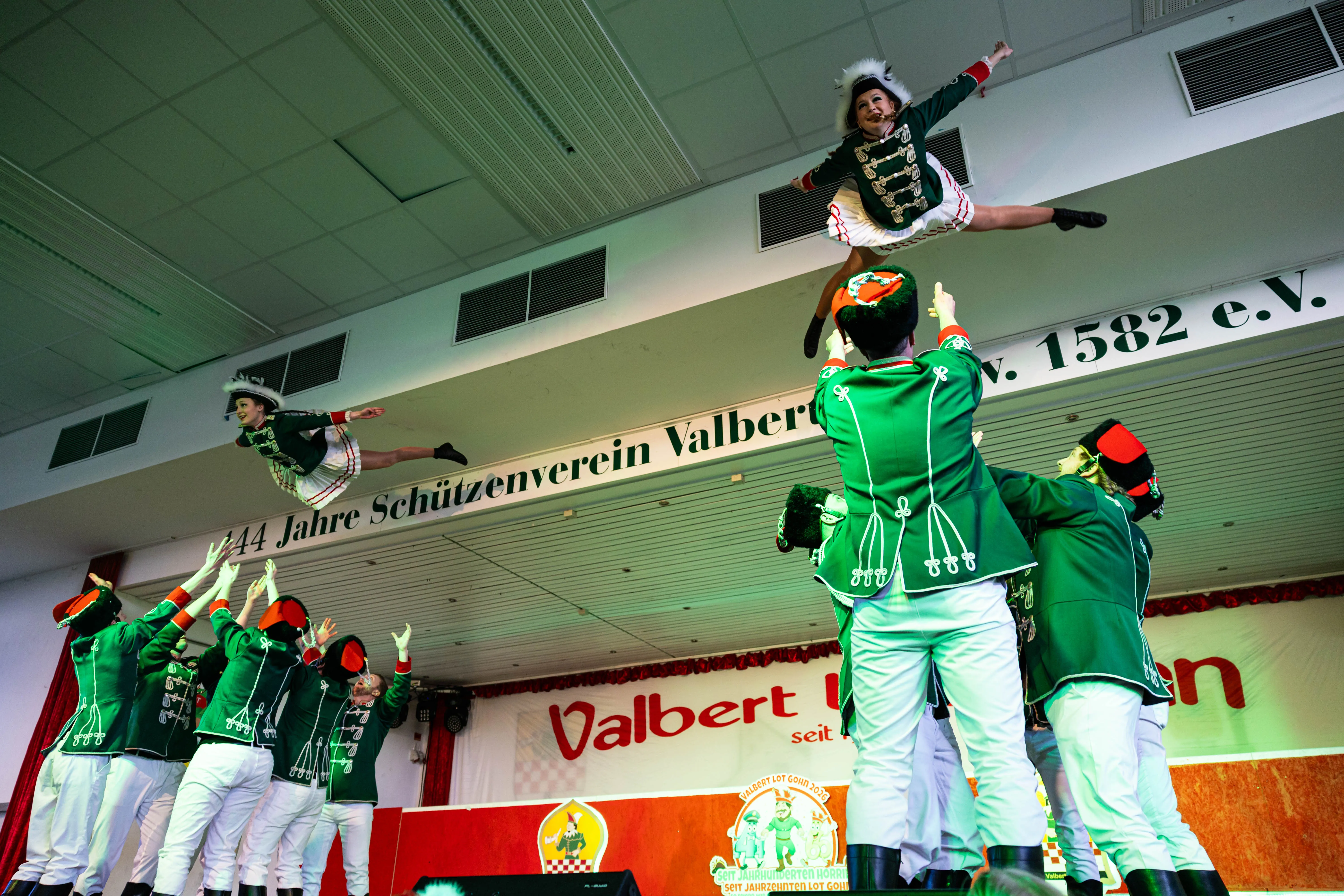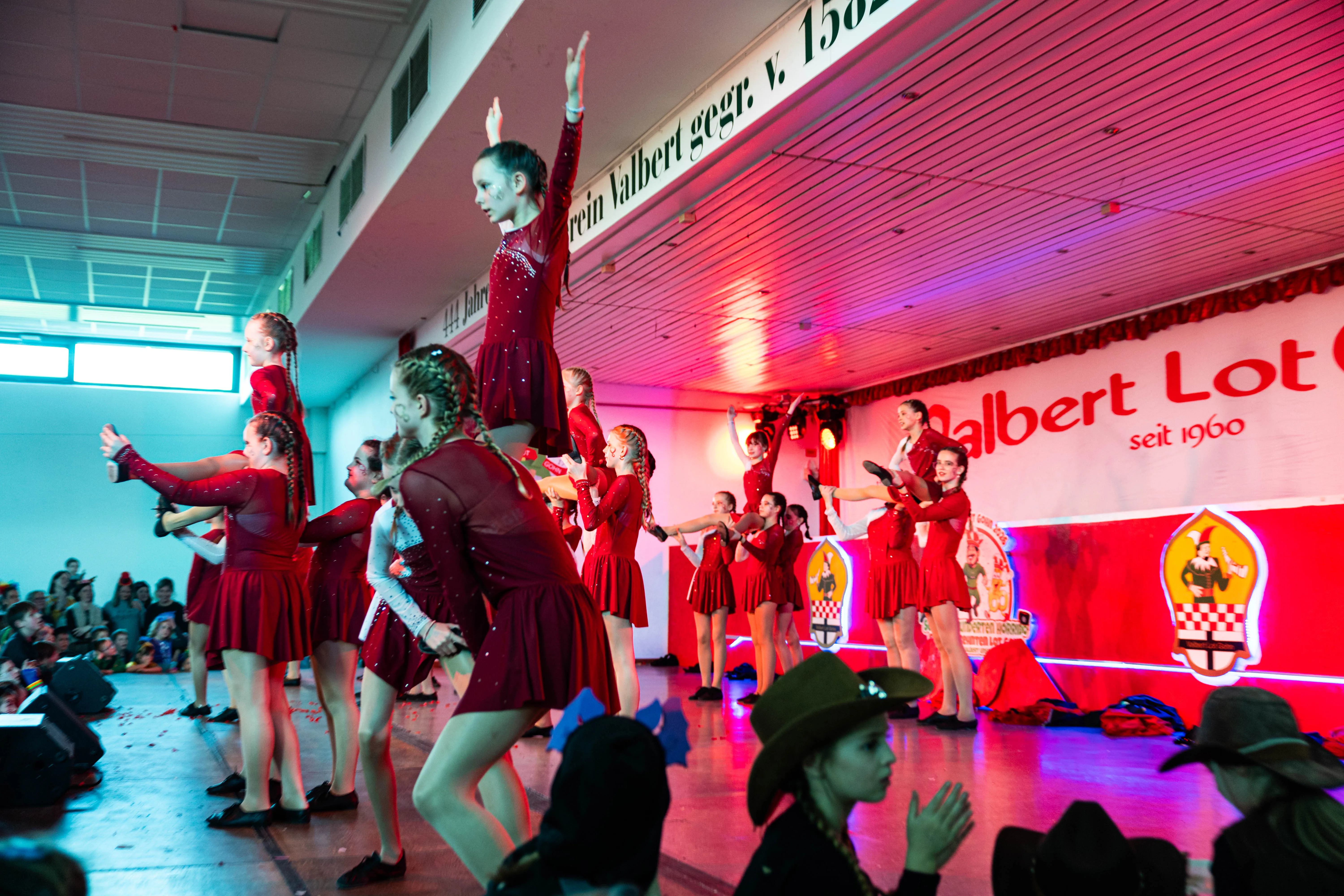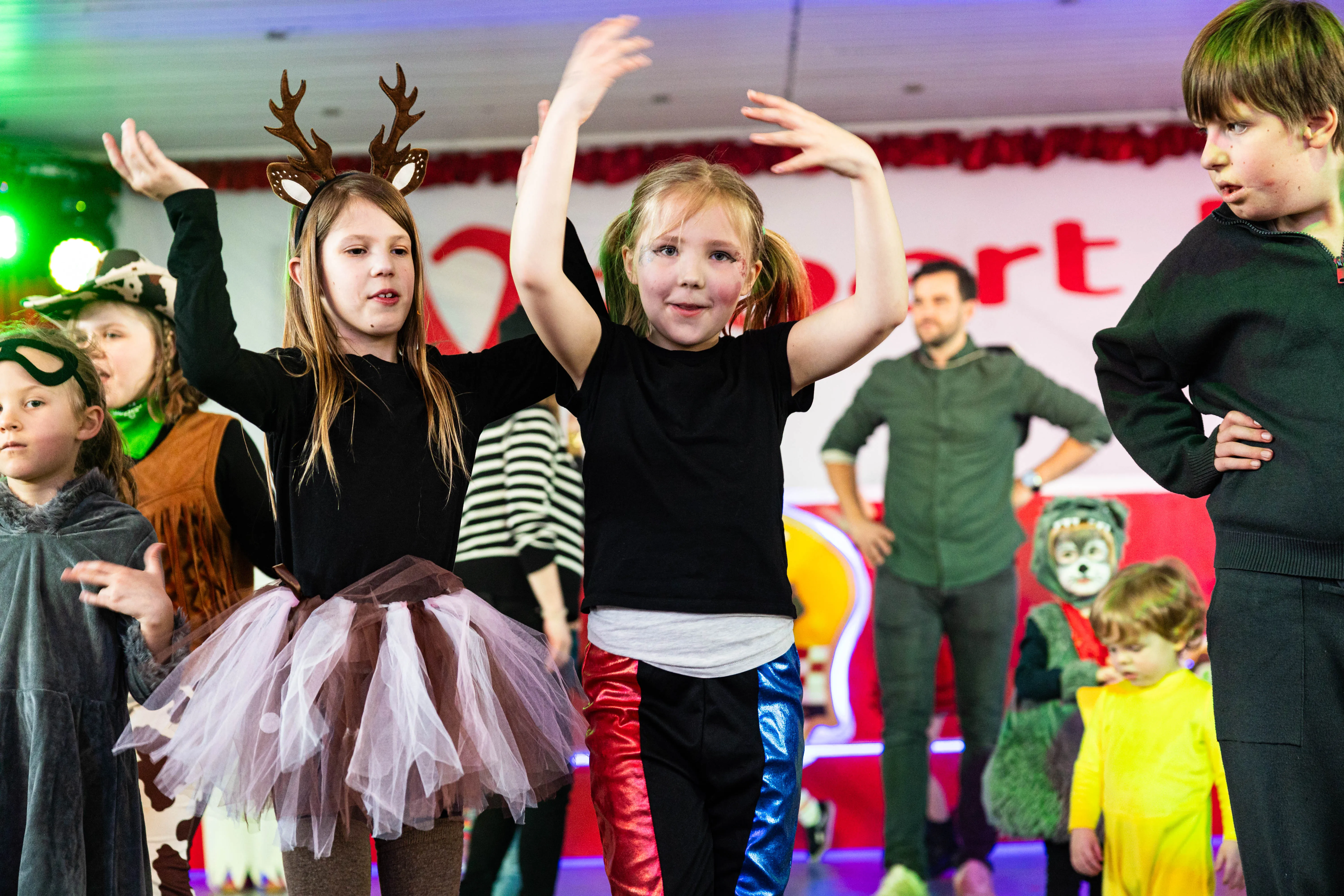 Für viele Kinder waren vermutlich die Tanzpausen das Highlight — denn dann konnten sie auf der großen Bühne immer wieder spielen, toben und tanzen. Moderator Dominik Busch im Comic-Anzug hatte jedenfalls zum Ende der Pause hin immer wieder Mühe, die Kinder zum Verlassen der Bühne zu bewegen. Der Platz auf der Bühne wurde jedoch für die fünf eigenen Garden der Valberter sowie die Gäste vom Miniballett Neu-Listernohl sowie des Schützenvereins Welschen Ennest benötigt, die zum wiederholten Mal in der Session ihr Können zeigten.