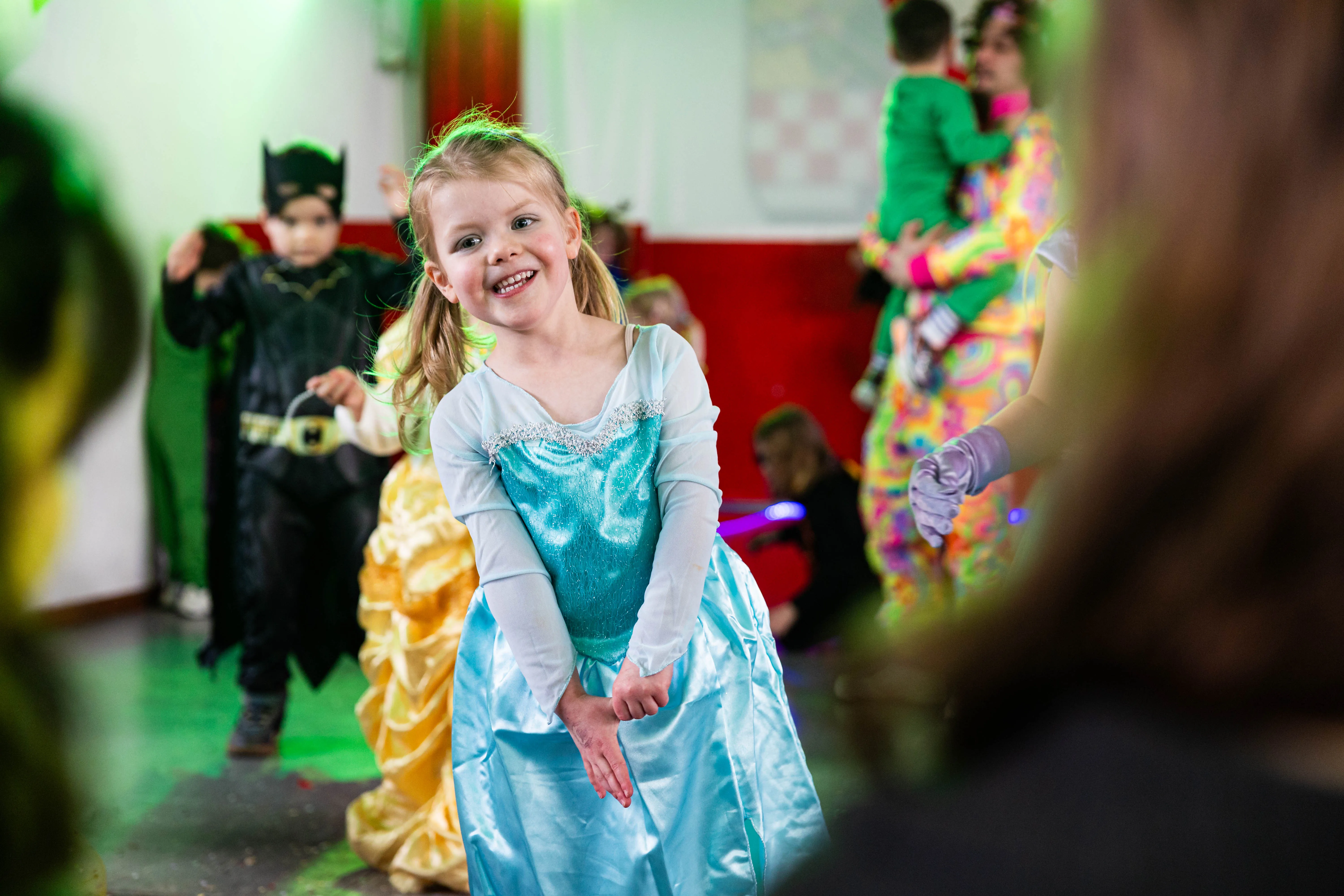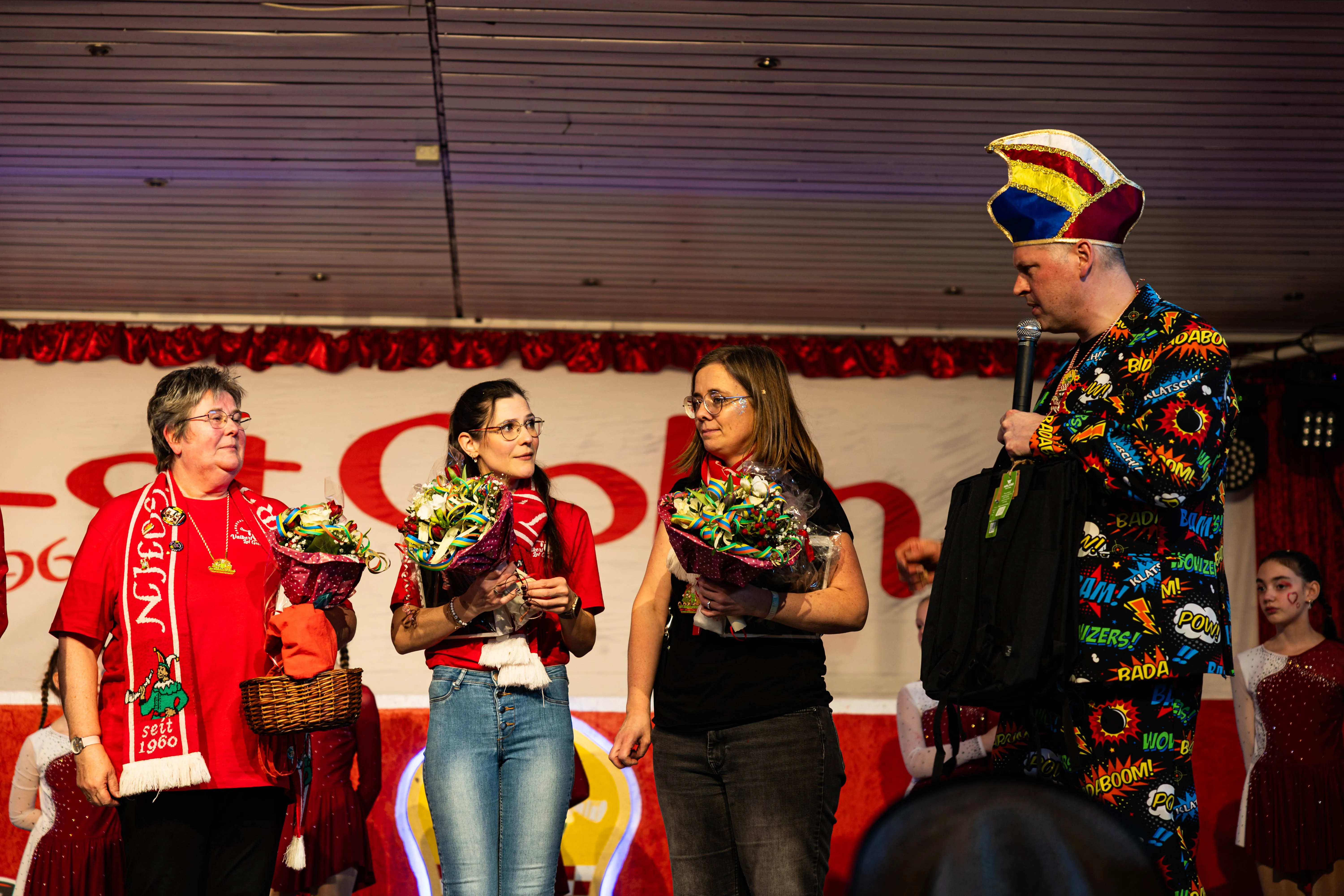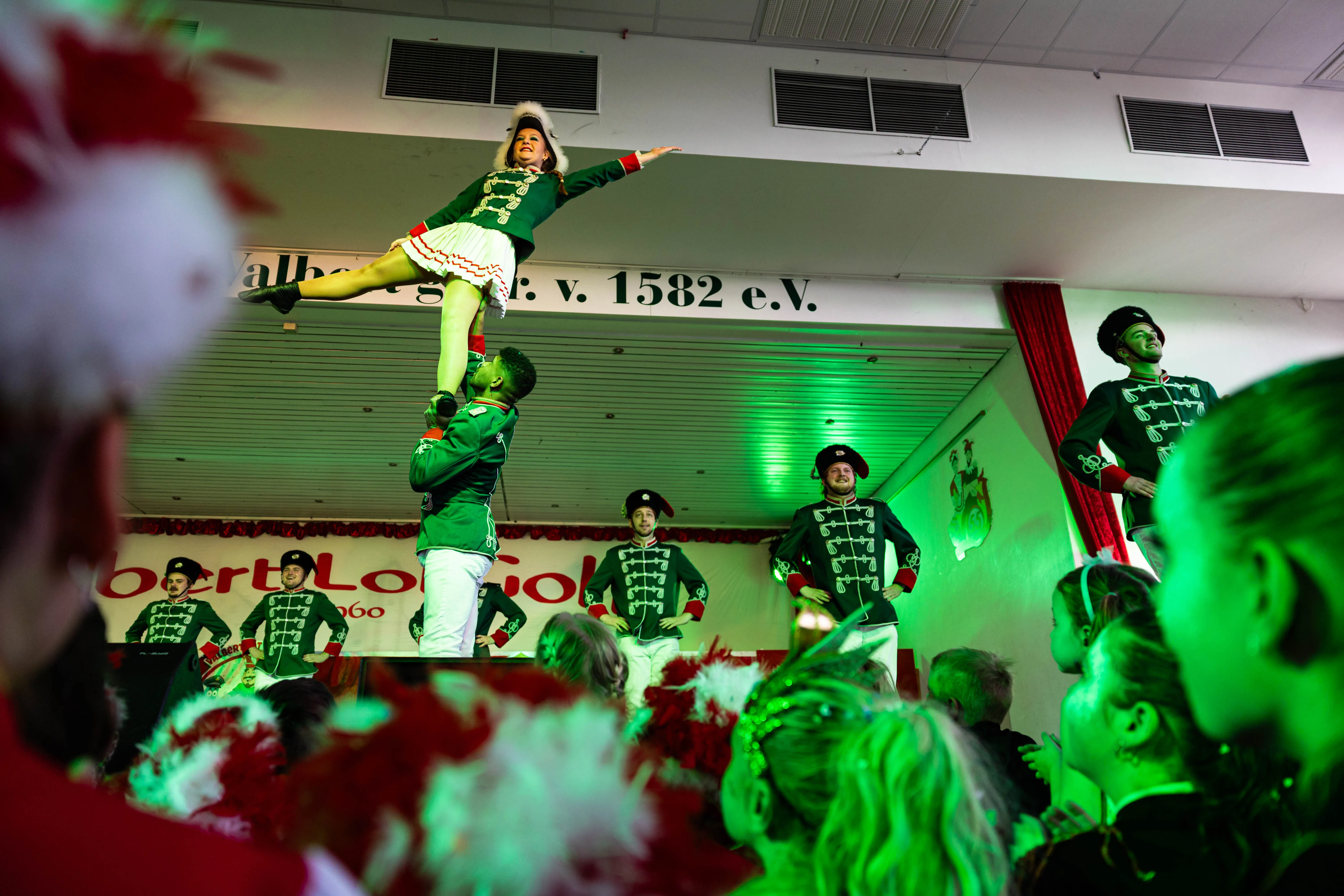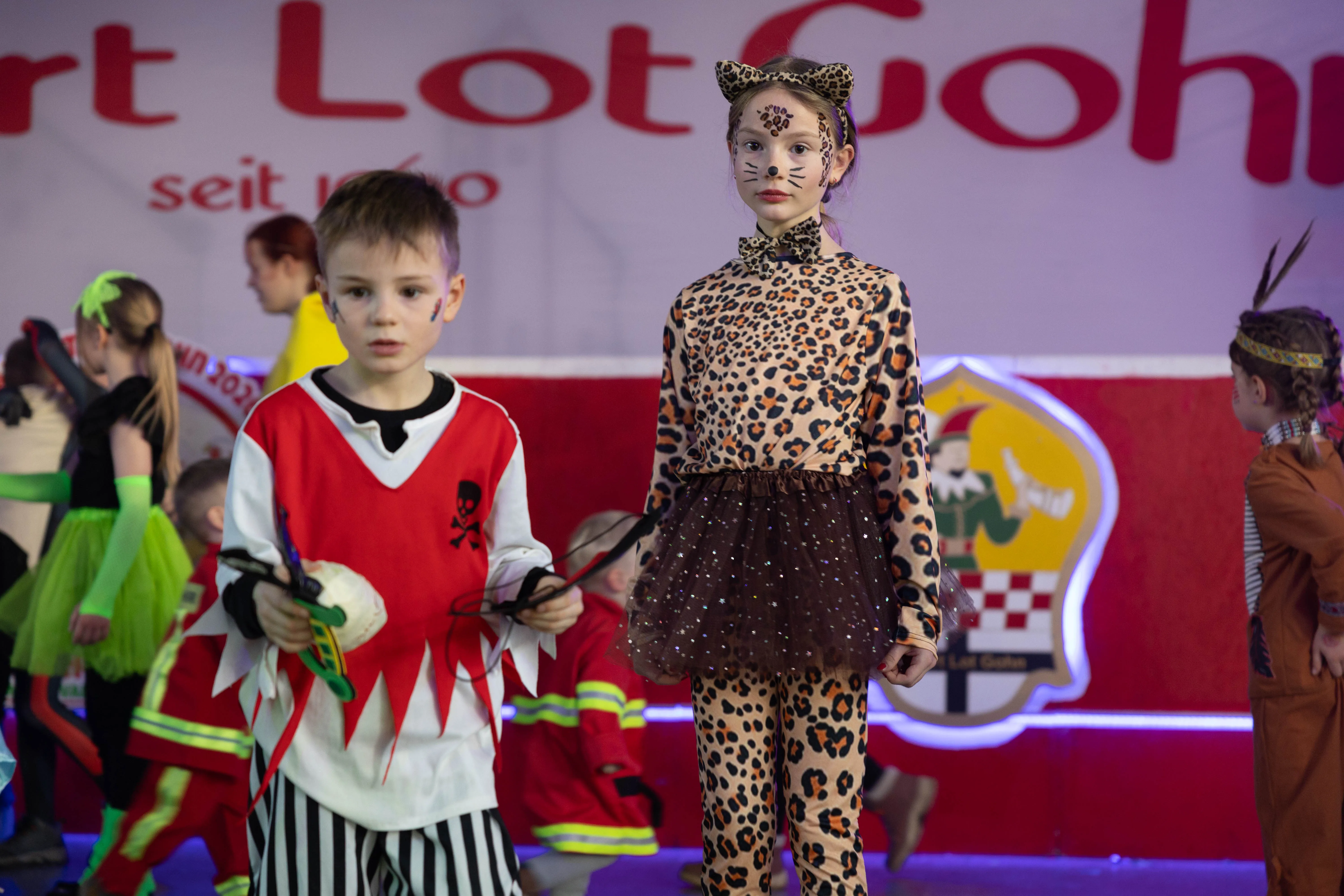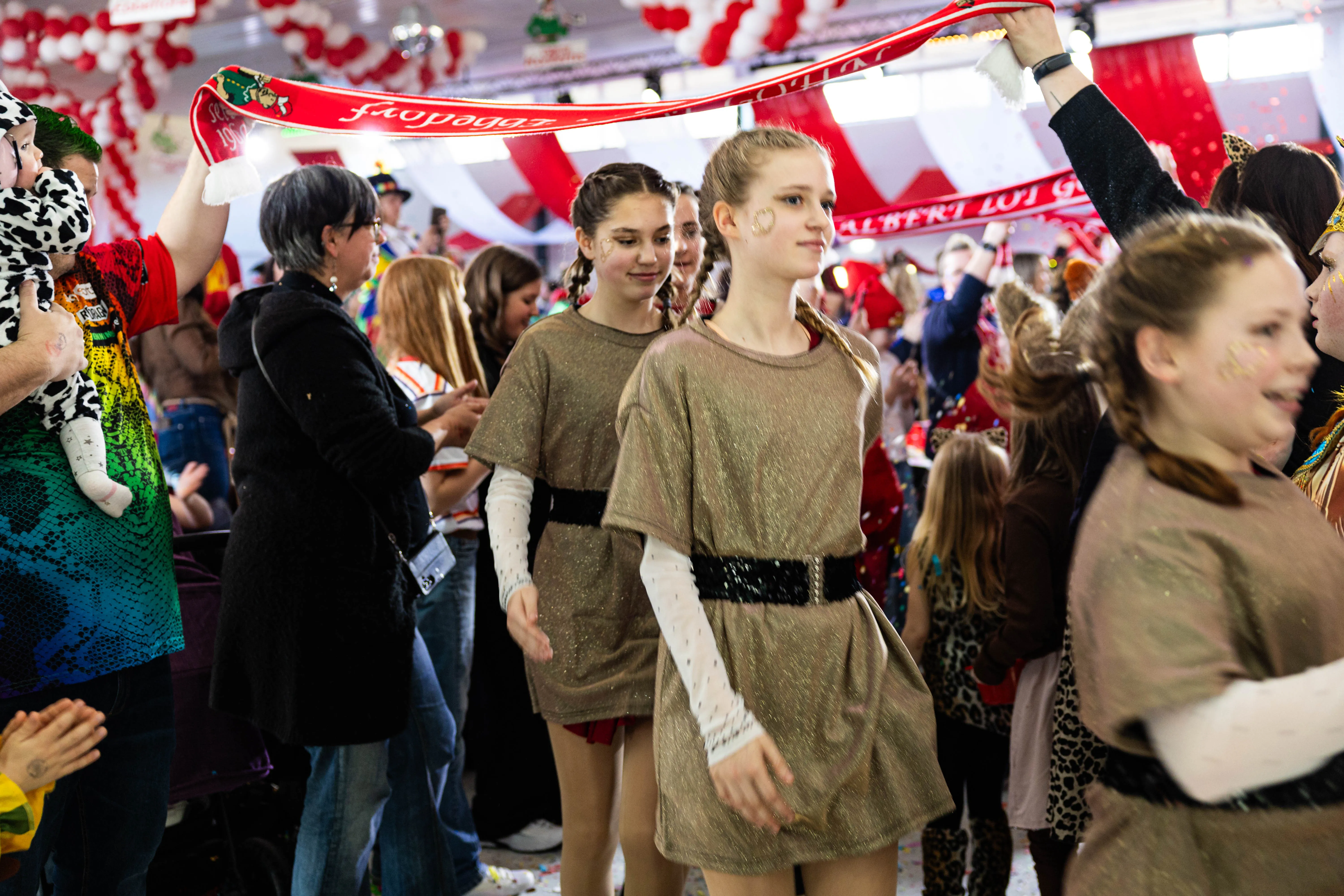 Für viele Kinder waren vermutlich die Tanzpausen das Highlight — denn dann konnten sie auf der großen Bühne immer wieder spielen, toben und tanzen. Moderator Dominik Busch im Comic-Anzug hatte jedenfalls zum Ende der Pause hin immer wieder Mühe, die Kinder zum Verlassen der Bühne zu bewegen. Der Platz auf der Bühne wurde jedoch für die fünf eigenen Garden der Valberter sowie die Gäste vom Miniballett Neu-Listernohl sowie des Schützenvereins Welschen Ennest benötigt, die zum wiederholten Mal in der Session ihr Können zeigten.