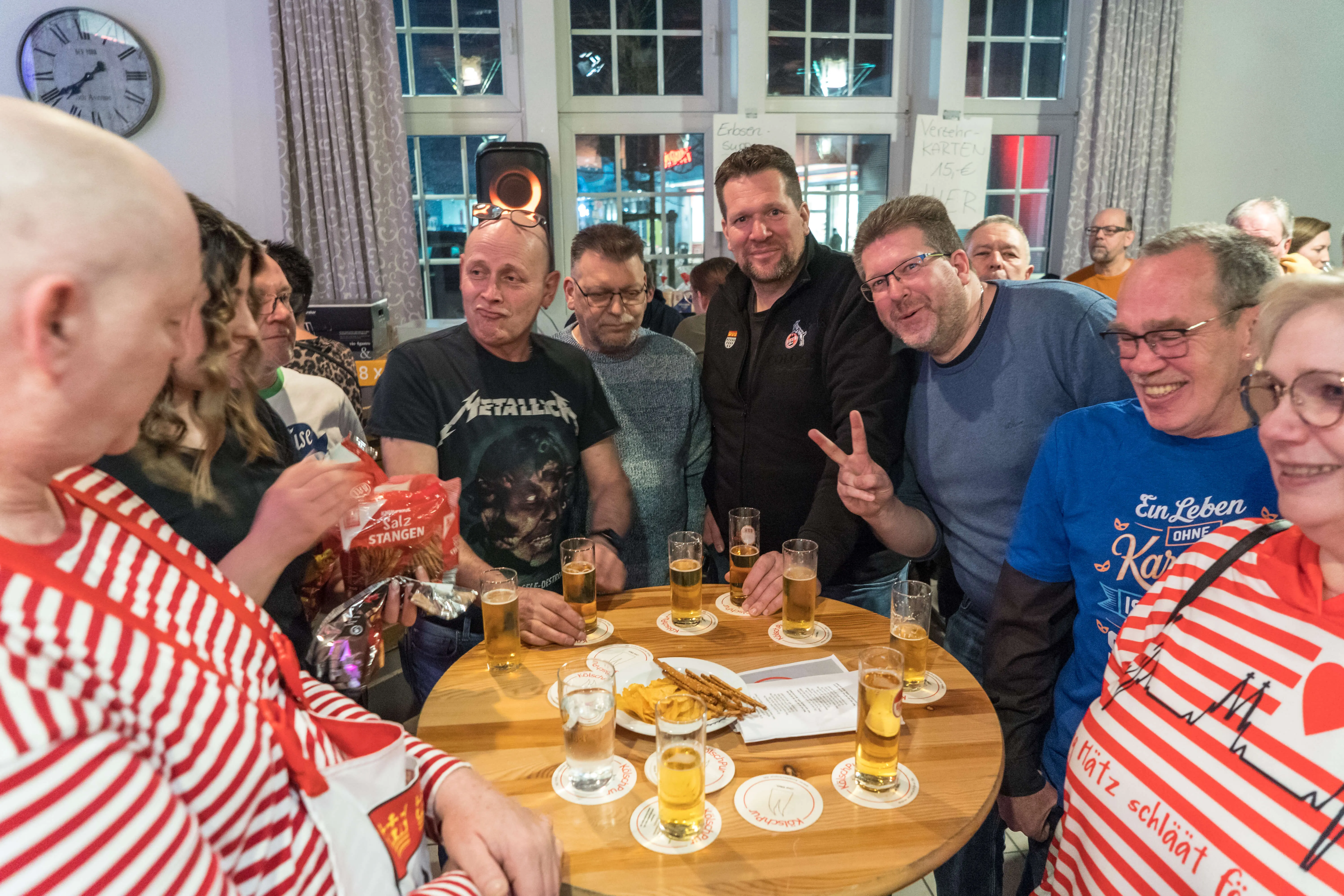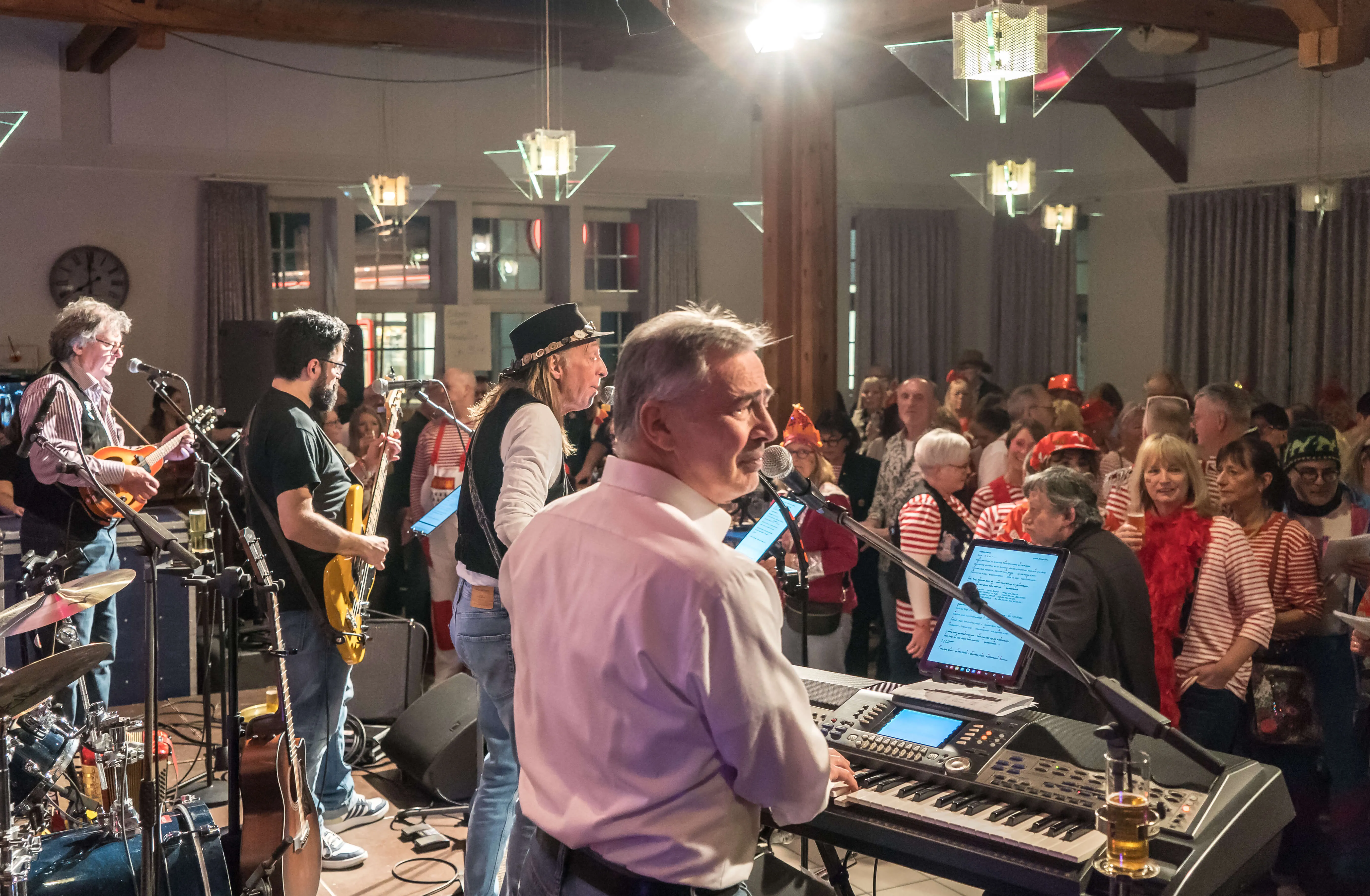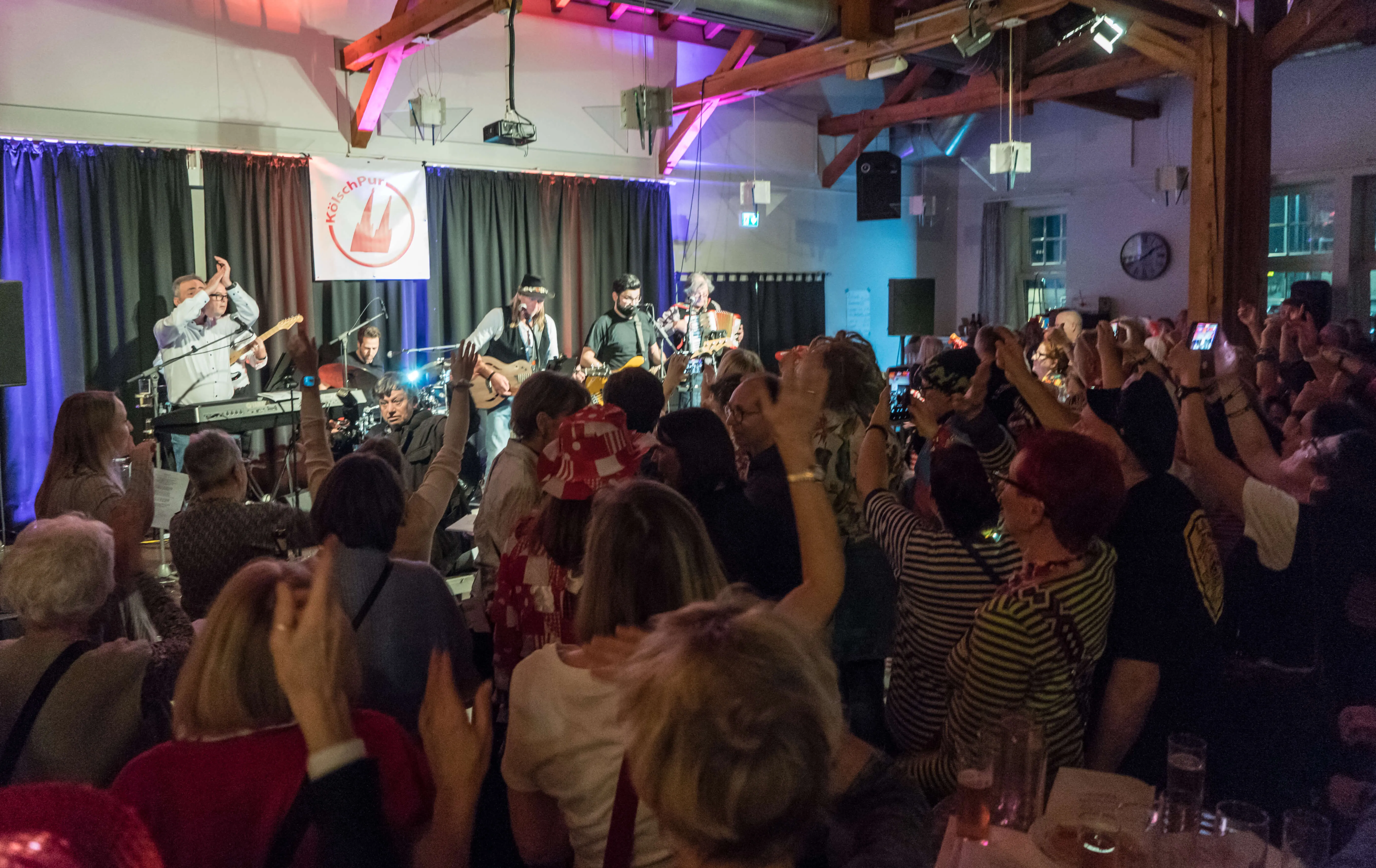 Dem Motto des Abends „Kölsch singe, drinke, leeve“ konnte keiner widerstehen. „Kölsche Leeder“ wurden geschmettert, dass der ganze Bahnhof bebte. „Hück steht die Welt still“, schallte es vielstimmig durch den Saal und „Su läuf dat he“ versicherte man sich a auf musikalische Weise. Die „Stääne“ am Himmel wurden besungen und Lieder von den Bläck Fööss wie „Drink doch eine met“ oder „Schön dat mir noch zusamme sin“ oder auch der BAP-Klassiker „Verdamp lang her“ wurden gesungen. Dabei gelang es den Musikern, kölsche Lebensfreude und Frohsinn zu verbreiten, aber auch Werte wie Toleranz und Offenheit zu vermitteln.