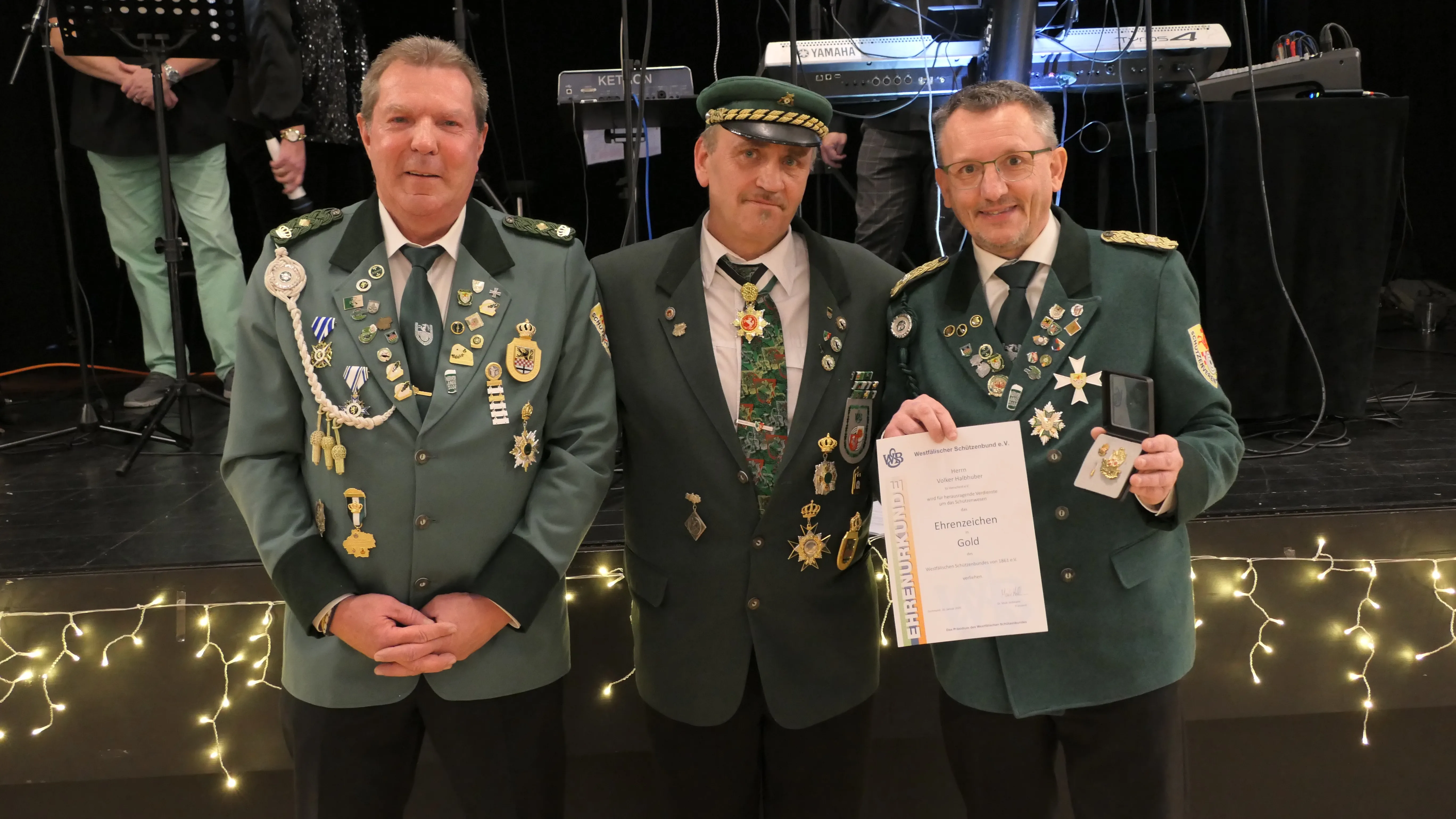 Nach dem Eröffnungstanz des Königspaares gab es noch eine Überraschung. Der Vorsitzende des Herscheider Schützenvereines, Volker Halbhuber, wurde für seine langjährige, unermüdliche Vorstandsarbeit, aber auch für den Einsatz beim Umbau der Gemeinschaftshalle unter Mithilfe von Fördermitteln des Landes NRW, sowie dem besonderen Einsatz im Bereich Sportschützen von dem zweiten Repräsentanten für Tradition und Brauchtumspflege, Jörg Makowski, mit dem Ehrenzeichen in Gold des Westfälischen Schützenbundes ausgezeichnet. Sichtlich gerührt, aber auch erfreut, nahm Volker Halbhuber diese überraschende Ehrung entgegen.