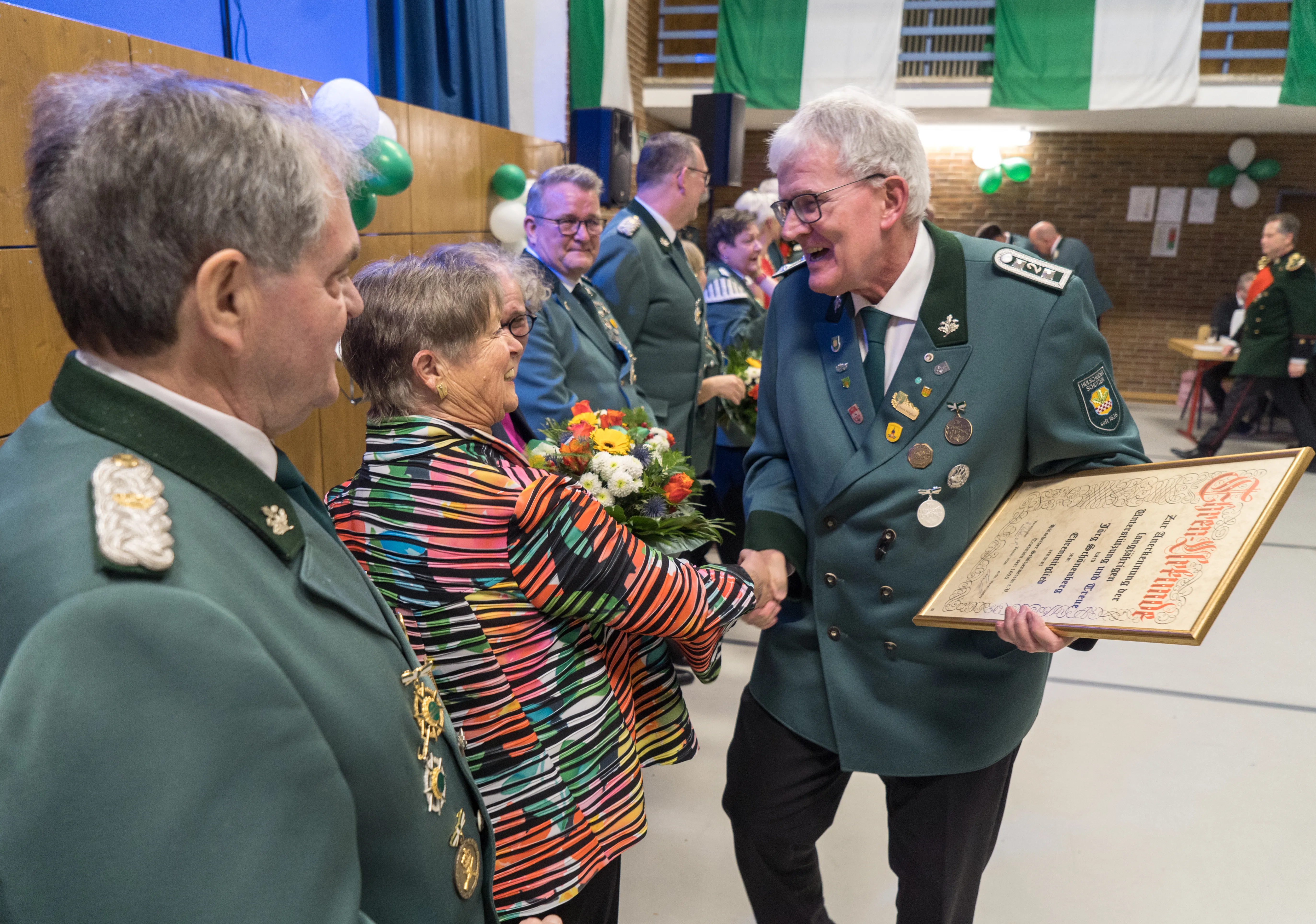 Den Treuedienstorden in Silber gab es für Carmen Walkhoff-Halbe, Jochen Hohage und Daniel Krause, den in Gold für Volkmar Kämper. Höhepunkt der Ehrungen war die Ernennung von Altbürgermeister Jörg Schönenberg zum Ehrenmitglied. Die Laudatio hielt der Ehrenvorsitzende Holger Rutenbeck. Er dankte Jörg Schönenberg für „fast 20 Jahre gemeinsamen Schaffens“ und lobte dessen Einsatz für das Schützenwesen. Er sei stets Ansprechpartner bei vielen Projekten des Vereins gewesen, habe Kontakte vermittelt und für reibungslose Abwicklung gesorgt.