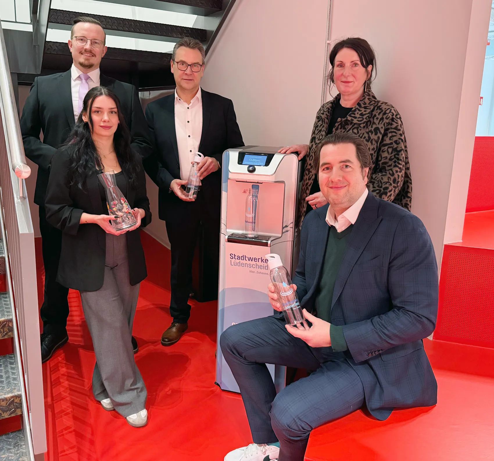 Der Wasserspender wurde bereits am Freitag, 13. Februar, im Eingangsbereich des TUMO-Zentrums offiziell in Betrieb genommen. Anwesend waren Vertreterinnen und Vertreter der Träger- und Betreibergesellschaft b.invest gGmbH sowie der Stadtwerke Lüdenscheid.
