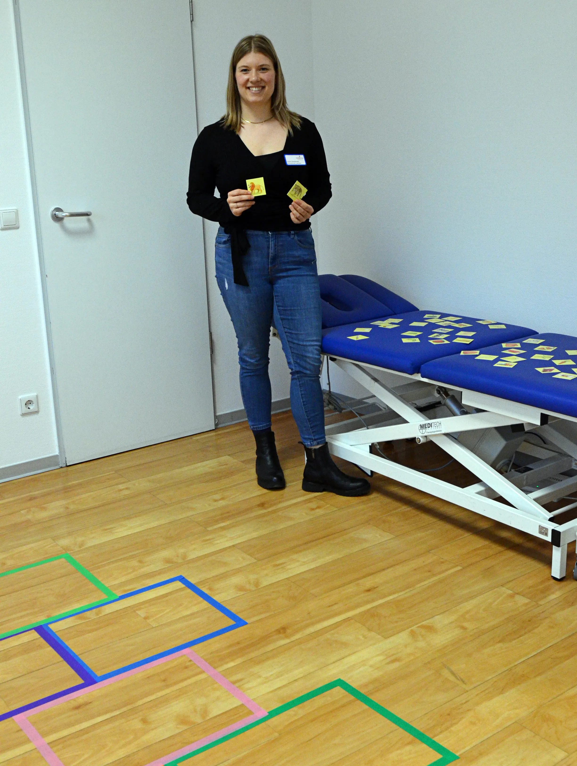 Aus dieser Zusammenarbeit könnten beispielsweise Maßnahmen zur Sprach- und Motorikförderung angeboten, Beratung und Kurse direkt in den Schulen und Kitas durchgeführt werden. Zur Demonstration als auch zum Testen hatte Carolin Kausemann Mitmach-Spielchen aufgestellt. Mit Bildkartenpaaren zu einem Oberbegriff wird die Anzahl der Silben eines Wortes ermittelt und motorisch auf einem Hüpfparcours umgesetzt. Ein winziger Auszug aus dem Bereich logopädischer Übungen.