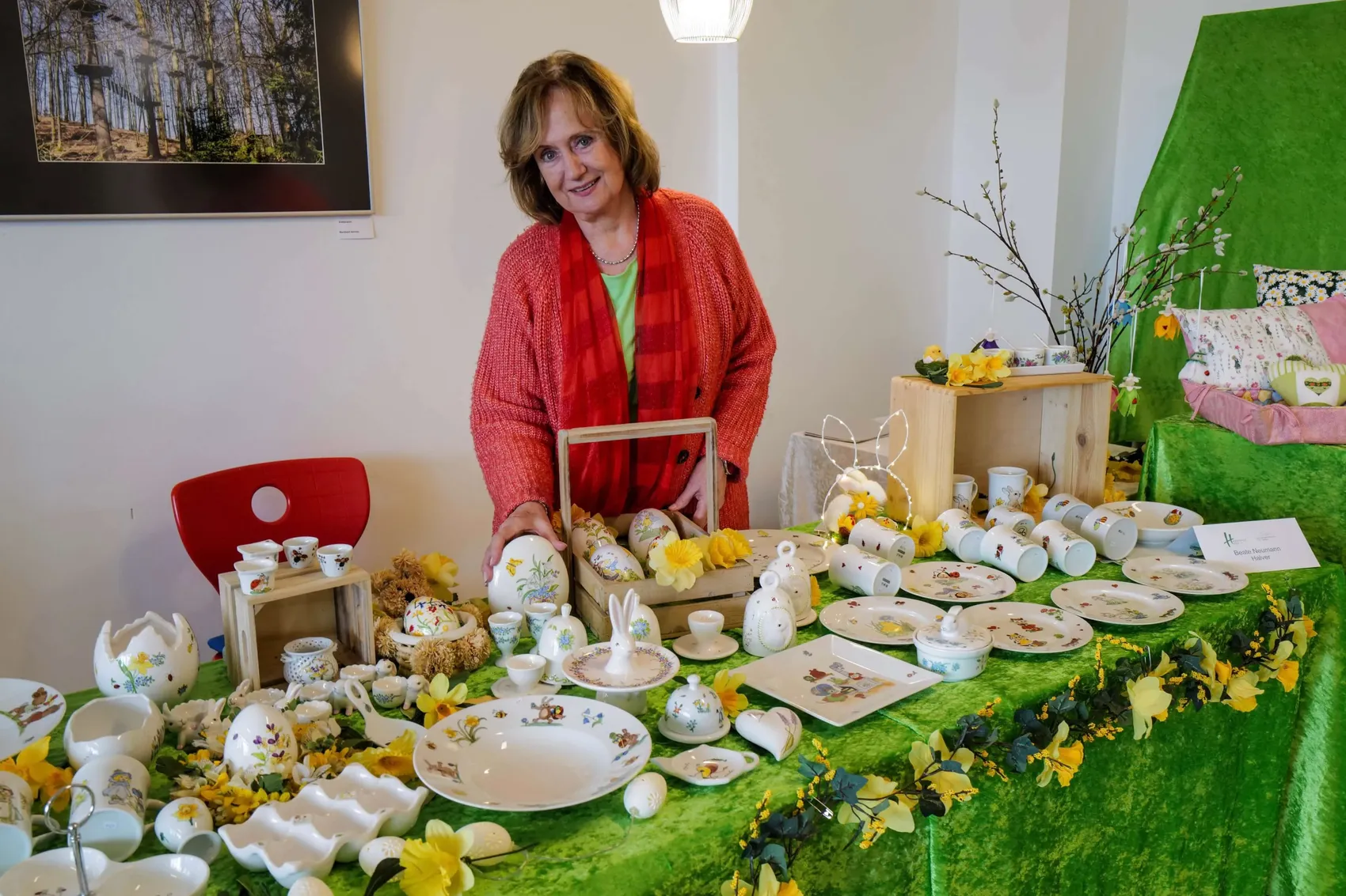 Insgesamt 19 Ausstellerinnen präsentieren an diesem Wochenende ihre selbst gefertigten Arbeiten. Das Angebot reicht von kunstvoll gestalteten Ostereiern über Frühlingsdekorationen bis hin zu gestickten Ostertischdecken und weiteren handgemachten Geschenkideen.