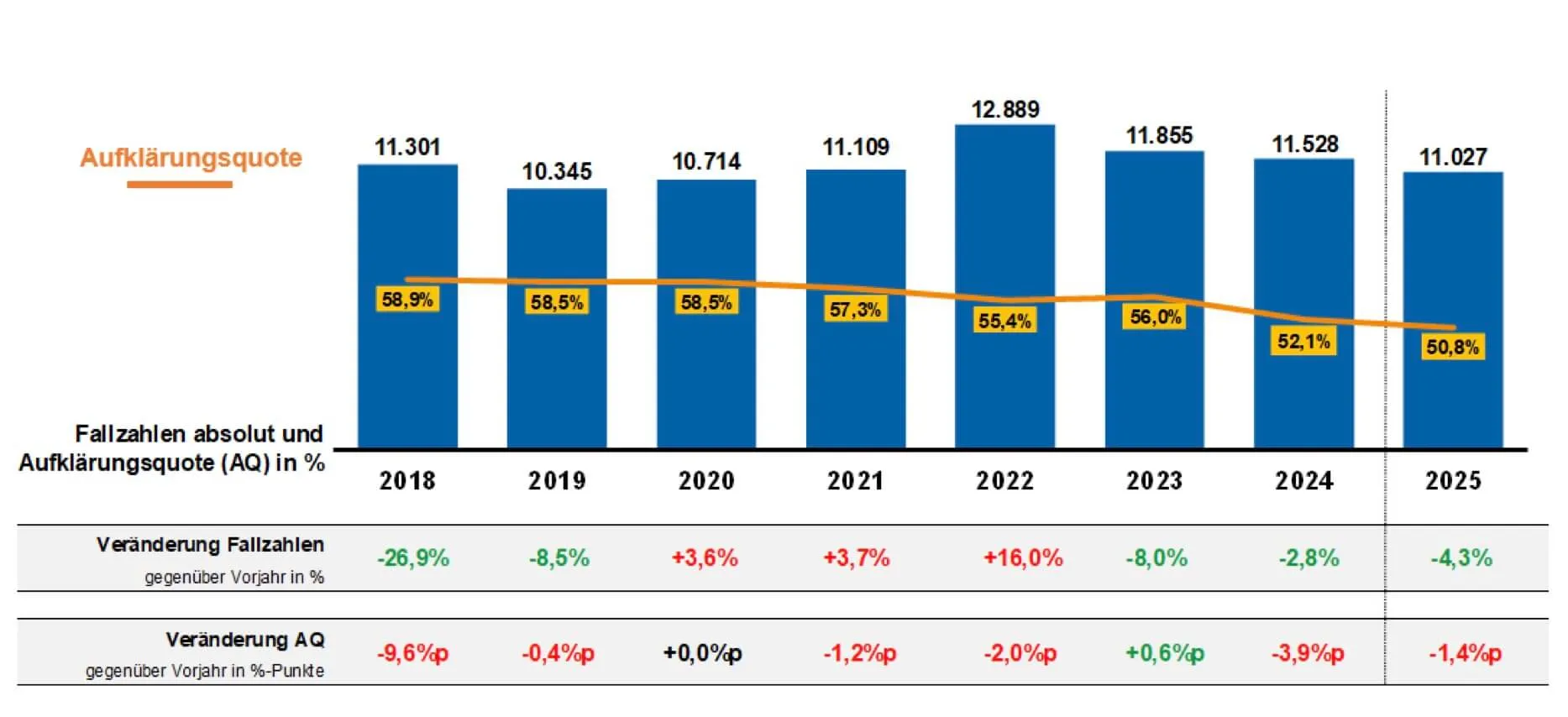 Im Jahr 2025 wurden insgesamt 11.027 Straftaten registriert — 501 weniger als im Vorjahr (-4,3 Prozent). Die Aufklärungsquote lag mit 50,8 Prozent auf nahezu gleichbleibendem Niveau. Die meisten Straftaten wurden in Hattingen (2537 Fälle) und Schwelm (1856 Fälle) gezählt, die wenigsten in Breckerfeld mit insgesamt 276 Delikten.