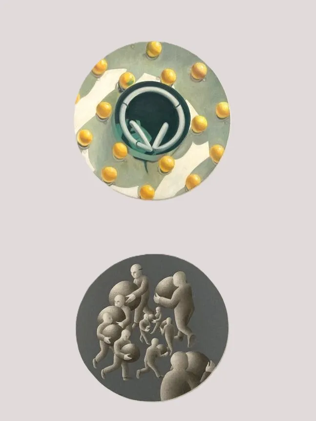 Die Grundlage der Künstlerknöpfe ist eine Sperrholzscheibe von 30 Zentimetern Durchmesser. Diese wurde den Künstlern zur Verfügung gestellt. Neben der so entstandenen beeindruckenden Vielfalt ist vor allem die jeweilige charakteristische künstlerische Handschrift zu entdecken. "So zeigt uns Ludwig Wilding sein Prinzip der optischen Irritation, und Bernard Schultze gibt Einblick in ein informelles Rund. Rolf Nolden sucht die rotierende Dynamik in der dritten Dimension, und Sandra Eades formuliert ein reduziertes Vokabular zart aquarellierter bildhafter Zeichen", formuliert die Galerie in ihrer Einladung. Für die Teilnahme an der Führung wird ein Beitrag von 3 Euro erhoben.