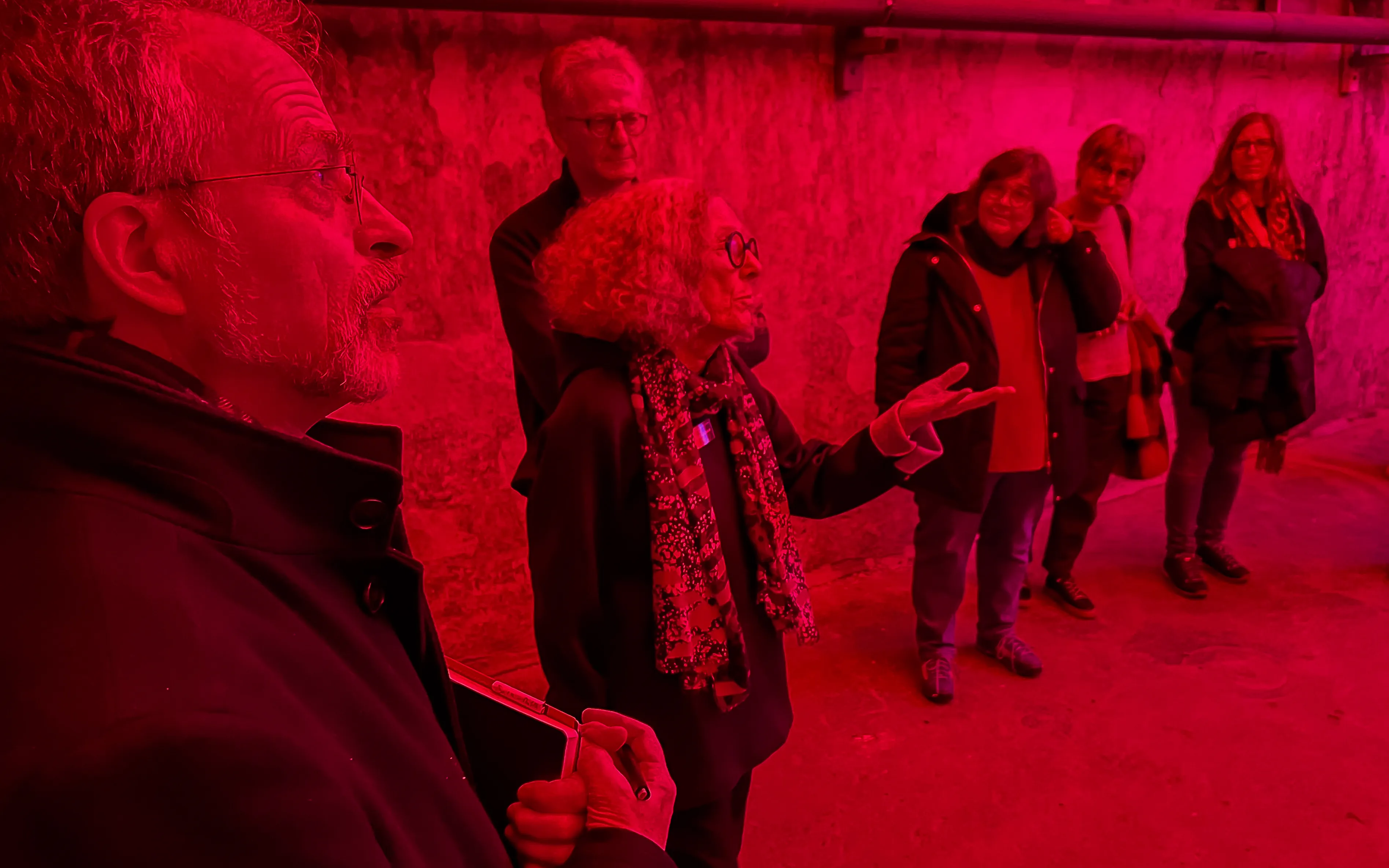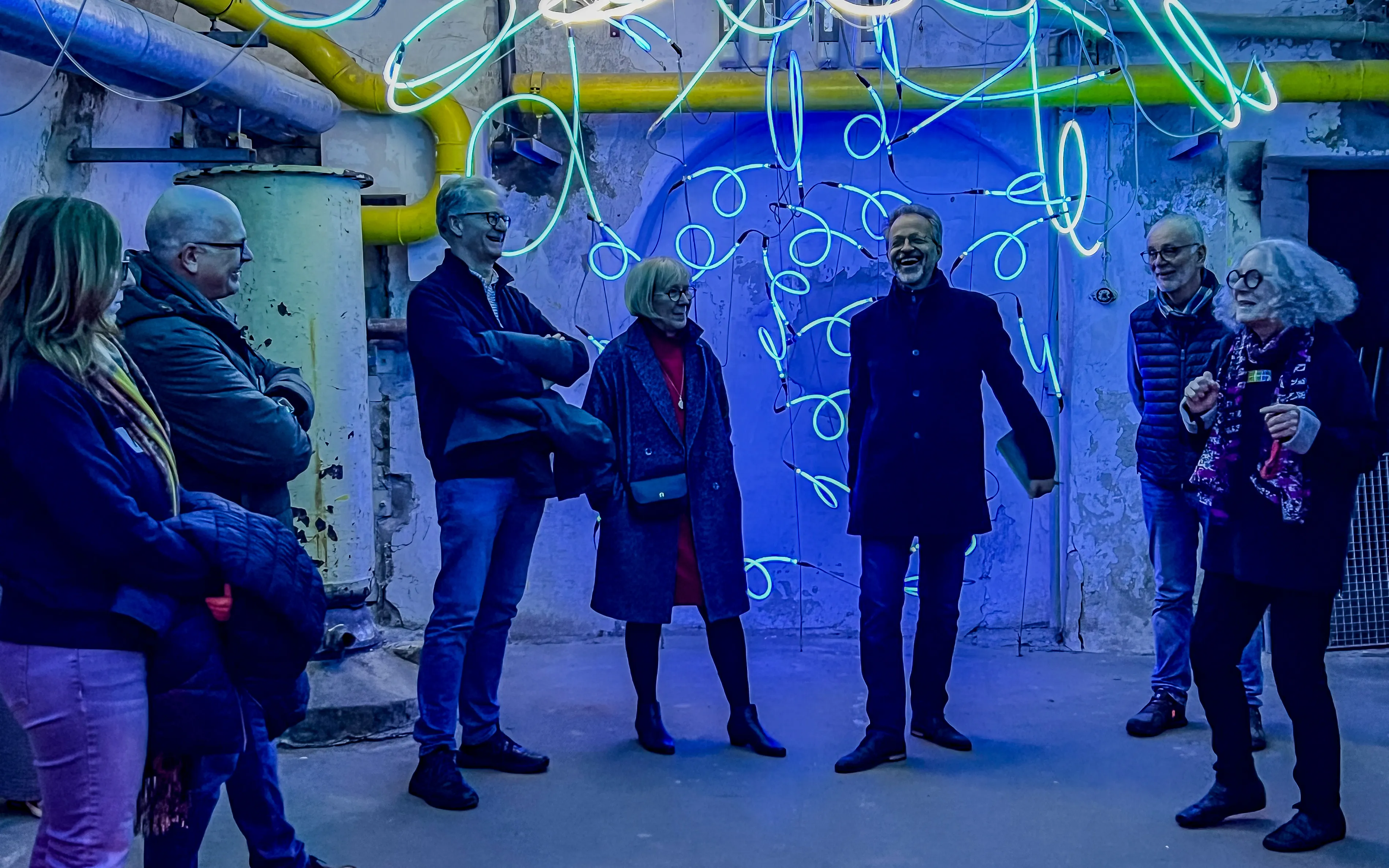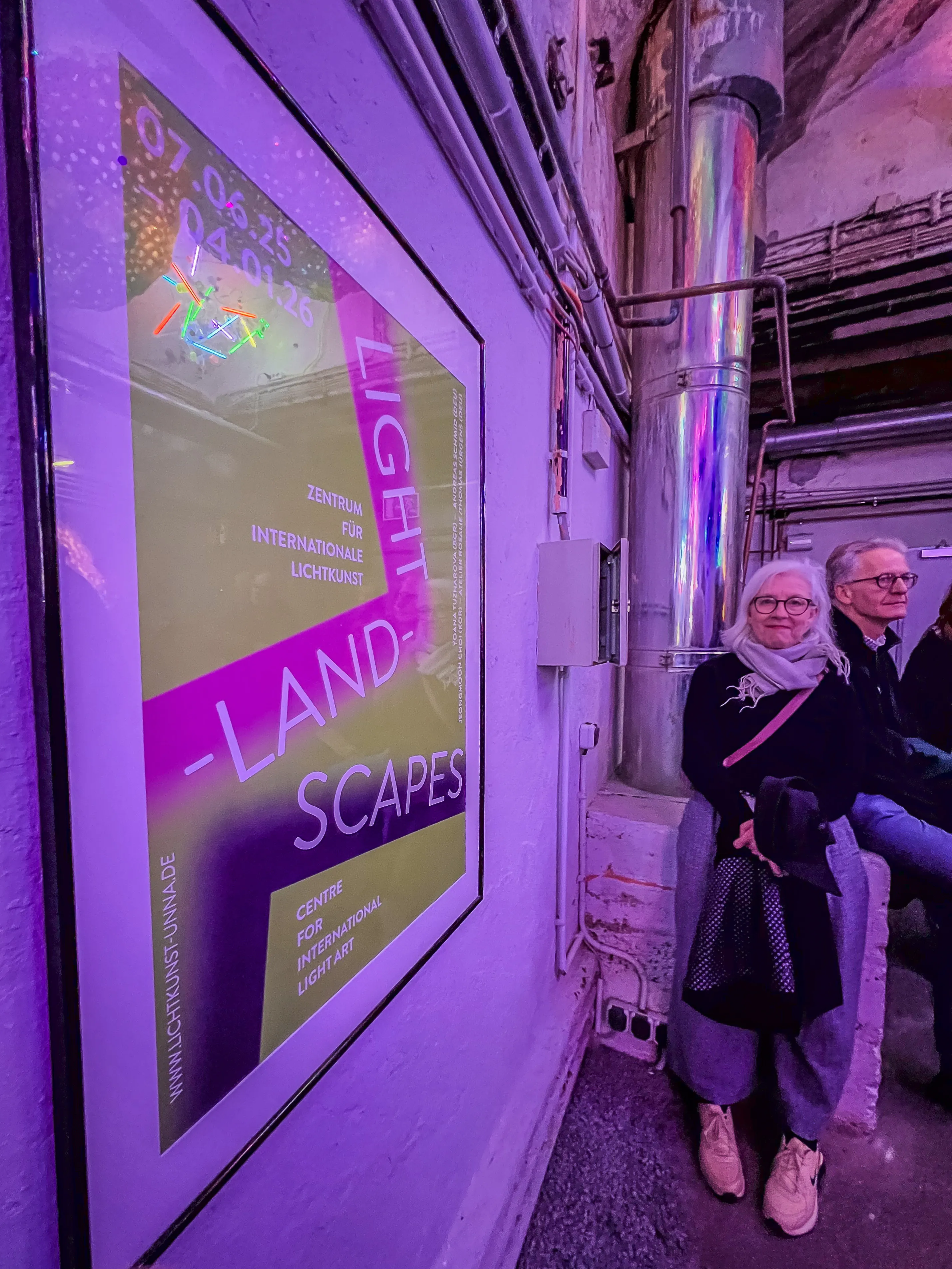 Bei der 90-minütigen Führung sah die Gruppe aus Lüdenscheid Arbeiten von Andreas Schmid (DEU), Jeongmoon Choi (KOR), Yoana Tuzharova (BGR), und Atelier Rosalie/Thomas Jürgens (DEU). Alle Werke interagieren mit der vorhandenen Umgebung und schaffen eine neue Landschaft, die erst durch das Licht sichtbar wird. Das Hindurchbewegen durch die Licht-Landschaften kommt einem nächtlichen Spaziergang gleich, der Besucherinnen und Besucher durch die Abwesenheit von Tageslicht und der Anwesenheit von Kunstlicht einen eigentlich bekannten Ort mit anderen Augen sehen lässt.