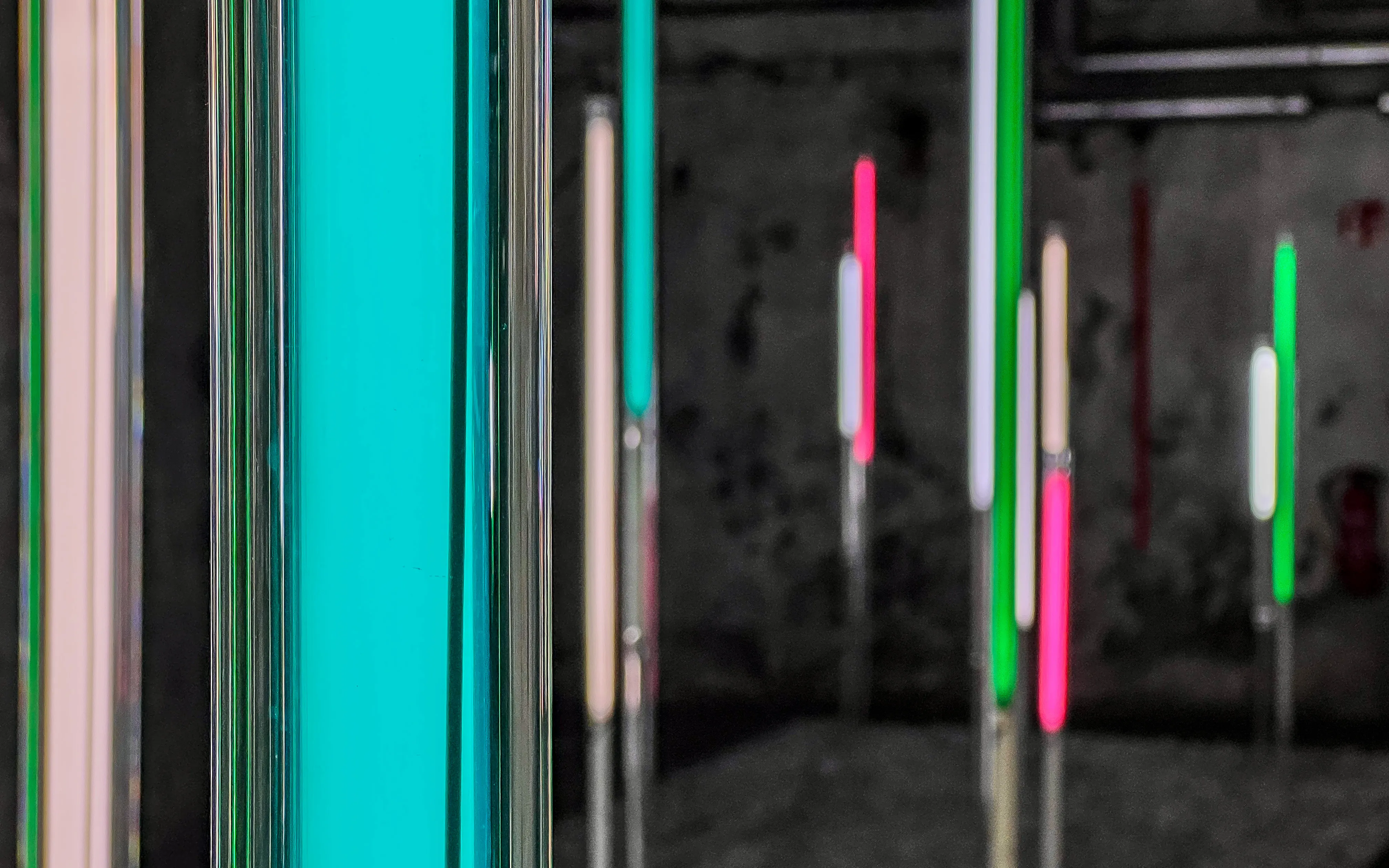 Andreas Schmids Werkkomplex Lichtungen besteht aus mehreren vertikal installierten Leuchtstoffröhren in unterschiedlicher Höhe und Farbigkeit, die durch eine elektronische Steuerung rhythmisch ihre Farbe und Lichtintensität verändern und scheinbar aus dem Boden zu sprießen scheinen.