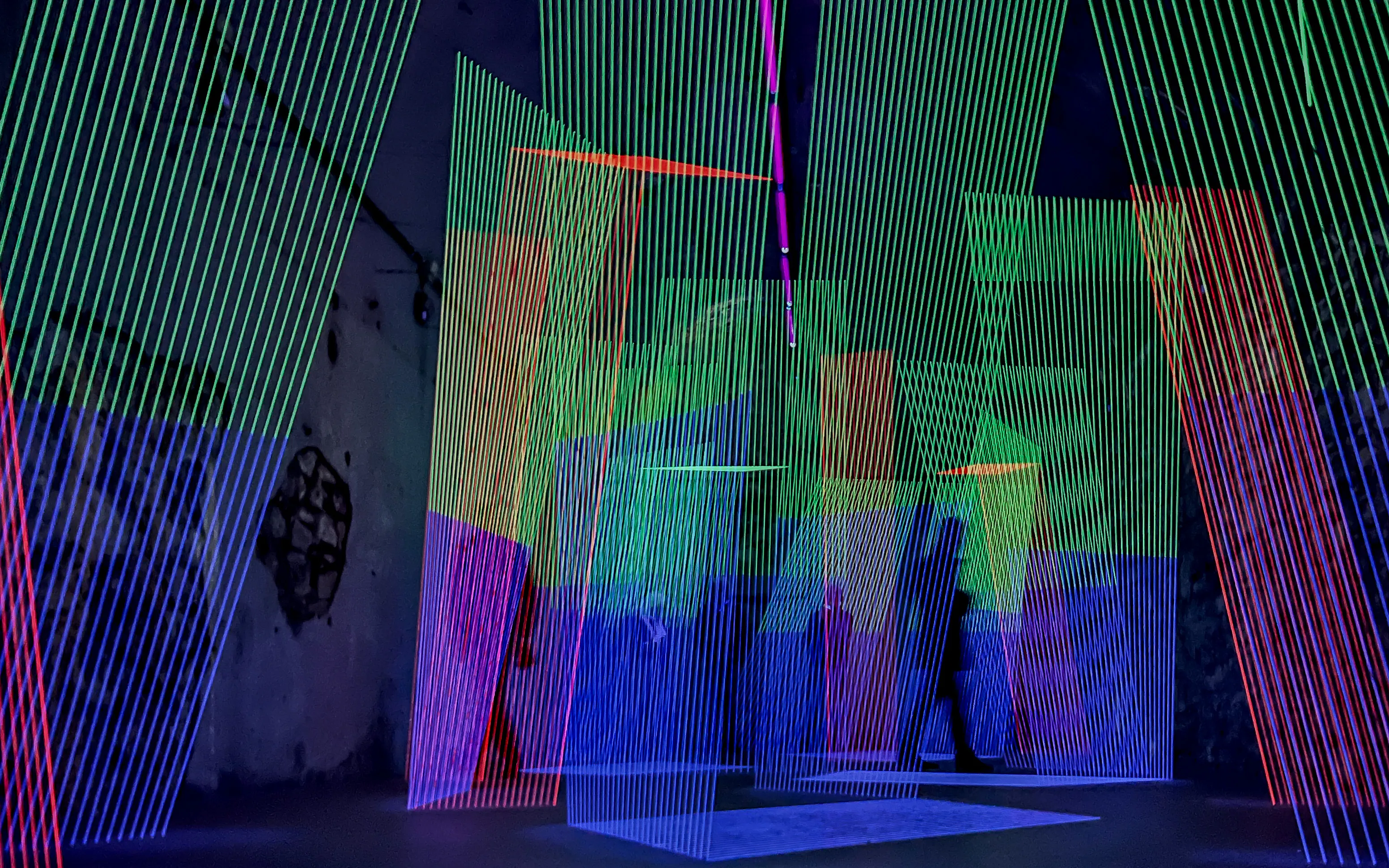 Auch bei den immersiven Raumzeichnungen der Künstlerin Jeongmoon Choi steht die Linie im Zentrum. Ein geeignetes Material für ihr Werk Floating Horizon findet sie in fluoreszierenden Fäden, die durch den Einsatz von Schwarzlicht sichtbar gemacht werden und so zu einer dreidimensionalen Zeichnung werden, die die Besucherinnen und Besucher betreten können.