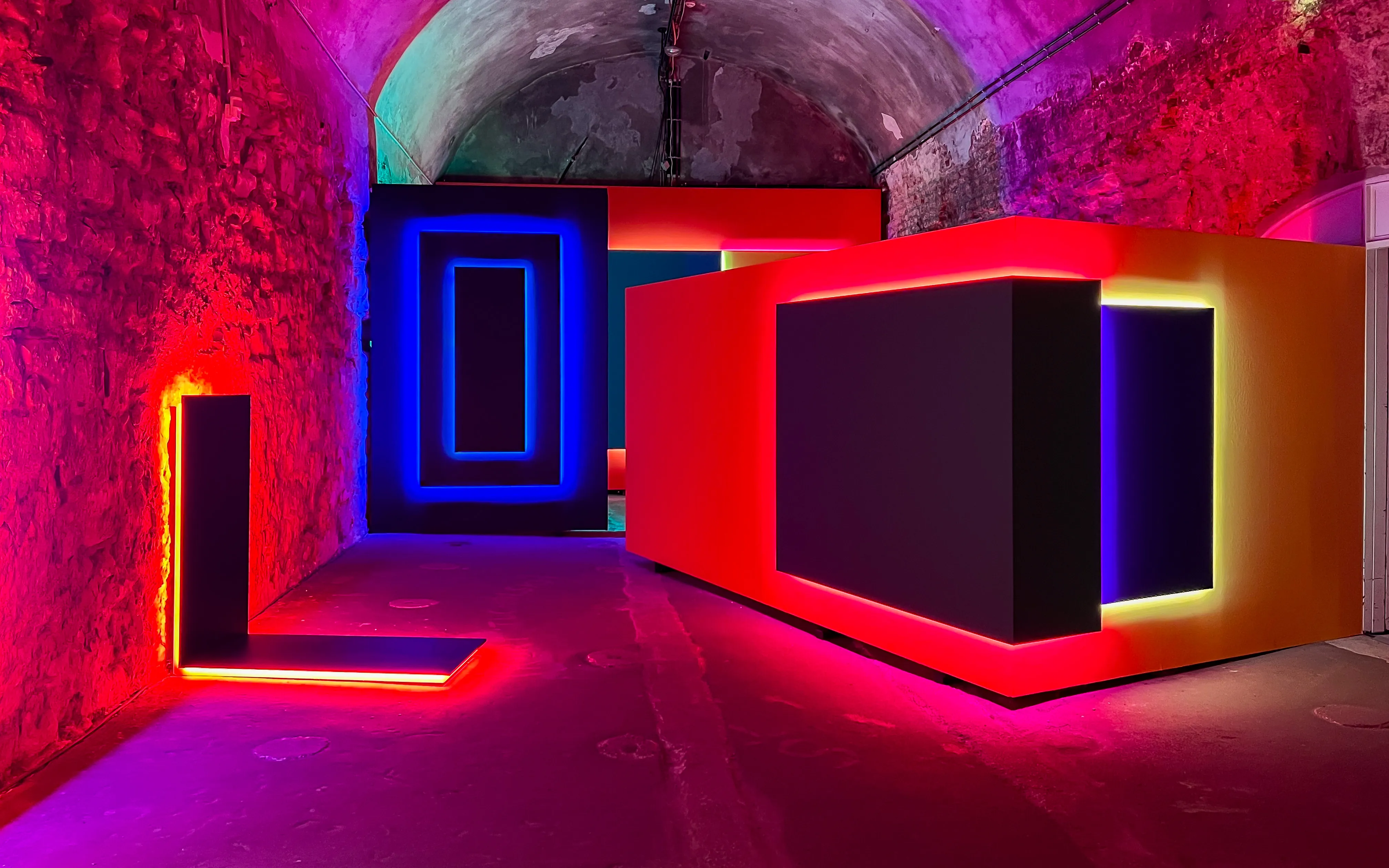 Yoana Tuzharova nutzt das Zusammenwirken von Licht und Dunkelheit auf besondere Weise in ihrer Licht- und Farblandschaft Penumbra. Sie greift die Dunkelheit als Ausgangspunkt für ihre malerisch-skulpturalen Umgebungen auf und erschafft labyrinthartige Räume aus farbigen Flächen, in denen die Interaktion von spektralem Licht und farbigen Schatten eine zentrale Rolle spielt.