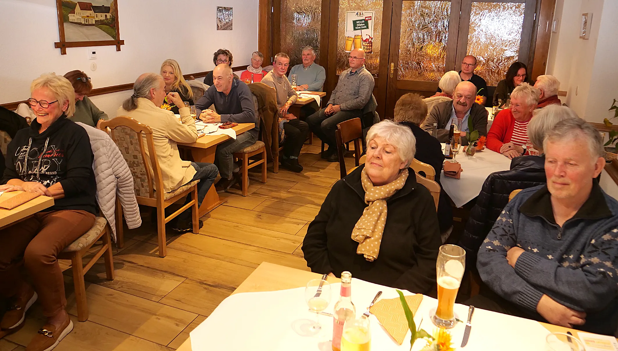 Tatsächlich, früher war alles besser? Nun ja, auf jeden Fall war das Essen weniger vegan. An diesem Abend ist es nicht anders: Peter Schürmann trägt Gulasch mit Klößen zum Sattwerden auf. „Von glücklichen Herscheider Kühen“, lässt er uns wissen und freut sich später über fast durchweg leergegessene Teller. Wobei: Es hätte sogar Nachschlag gegeben, aber sehr üppig war’s bis dahin bereits – Landgasthof eben. Und das Dessert – Pudding Schoko-Vanille mit Kirschen - muss man ja auch noch schaffen. Von wegen nur „Sauerländer Häppchen“ ….