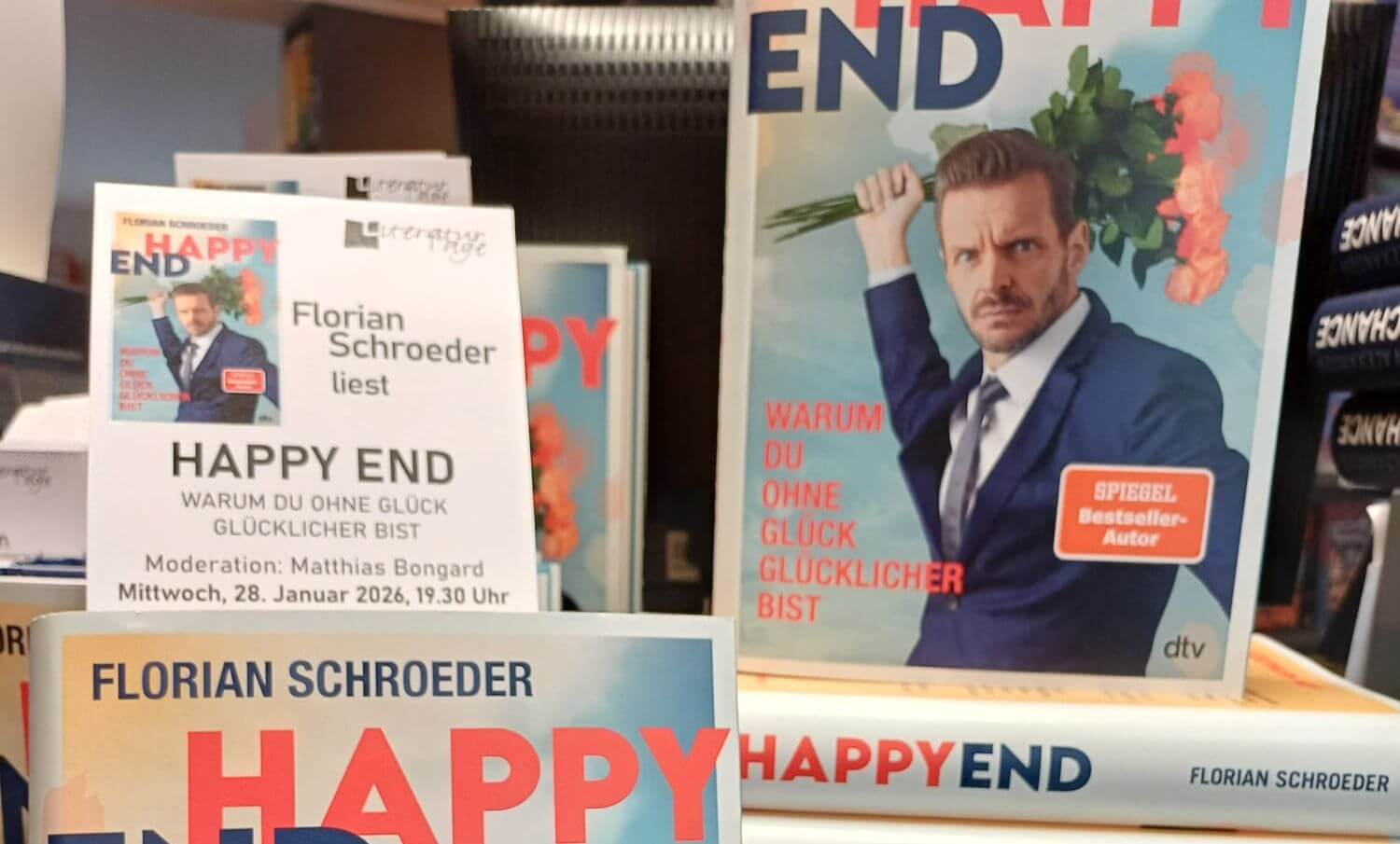 Kriege, Krisen, Katastrophen. Gibt es da einen Lichtblick, ein Happy End? Florian Schroeder macht sich auf die Suche. Das Ergebnis hat er auf 240 Seiten zusammengefasst. Sein Buch „Happy End — Warum du ohne Glück glücklicher bist“ stellt er am Mittwoch, 28. Januar, vor.