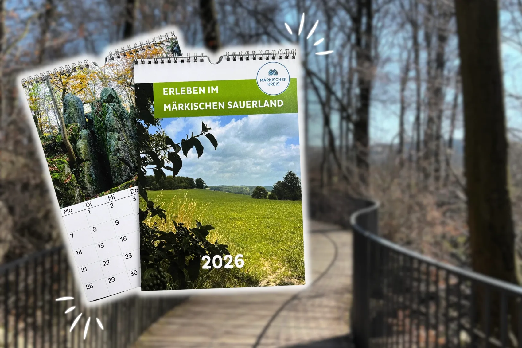 Der kostenlose Wandkalender „Erleben im Märkischen Sauerland 2026“ des Märkischen Kreises ist ab sofort in den Touristikstellen der Städte und Gemeinden sowie in den Bürgerbüros der Kreisverwaltung in Lüdenscheid und Iserlohn verfügbar.