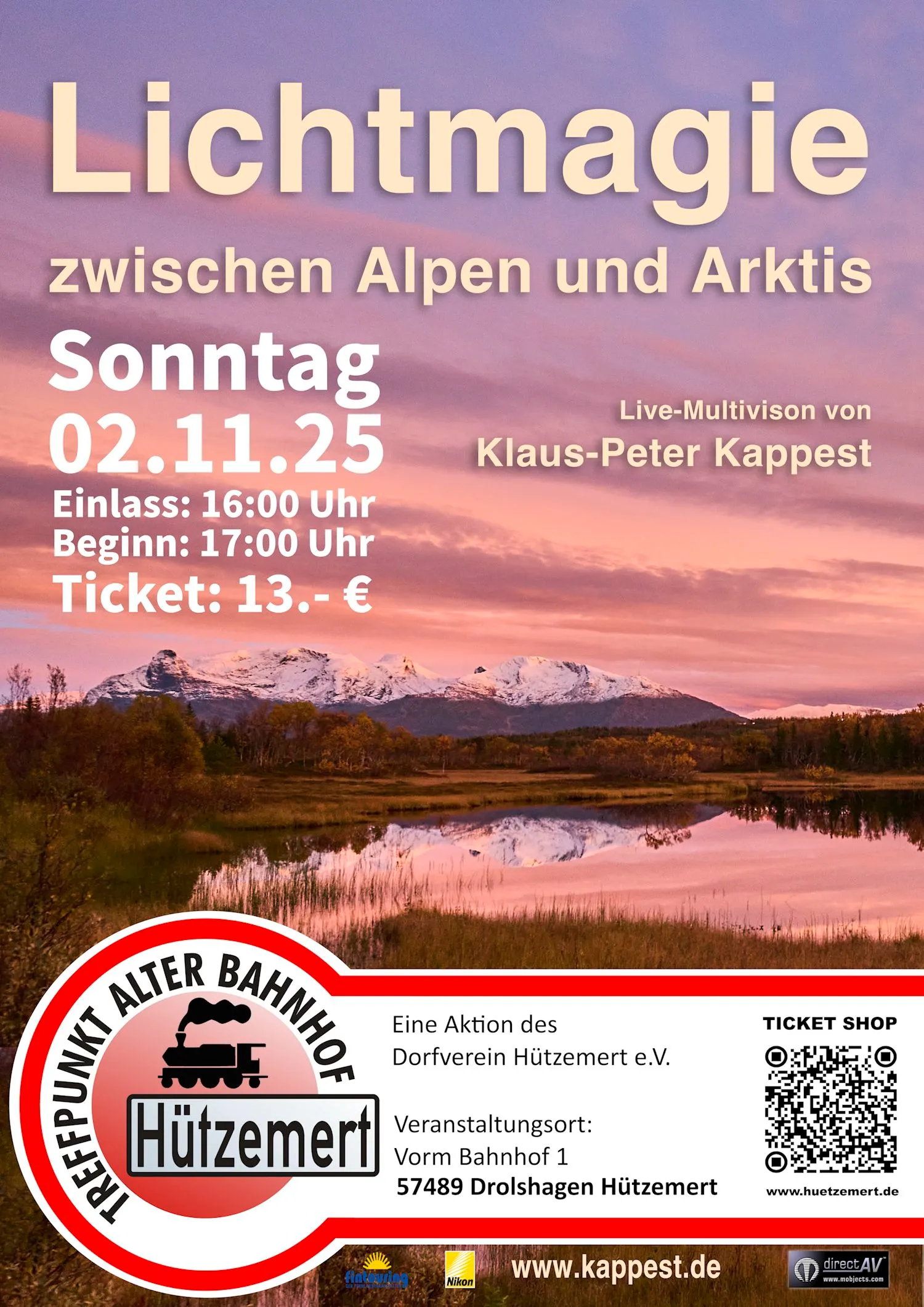 „Lichtmagie zwischen Alpen und Arktis“ ist das Thema einer Multivisionsschau. Der Reisefotograf Klaus-Peter Kappest aus Hilchenbach präsentiert diese am Sonntag, 2. November, im Alten Bahnhof in Hützemert.
