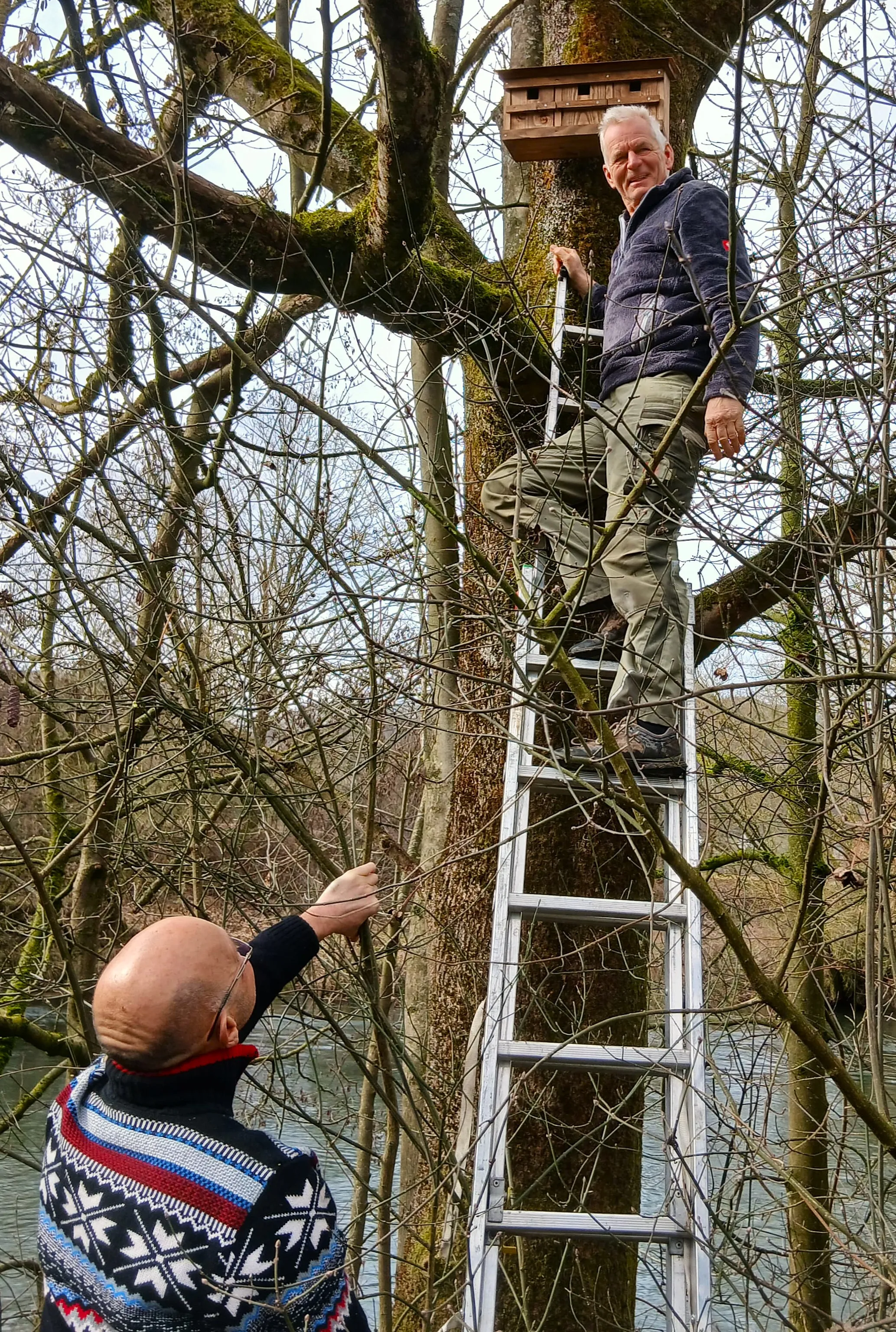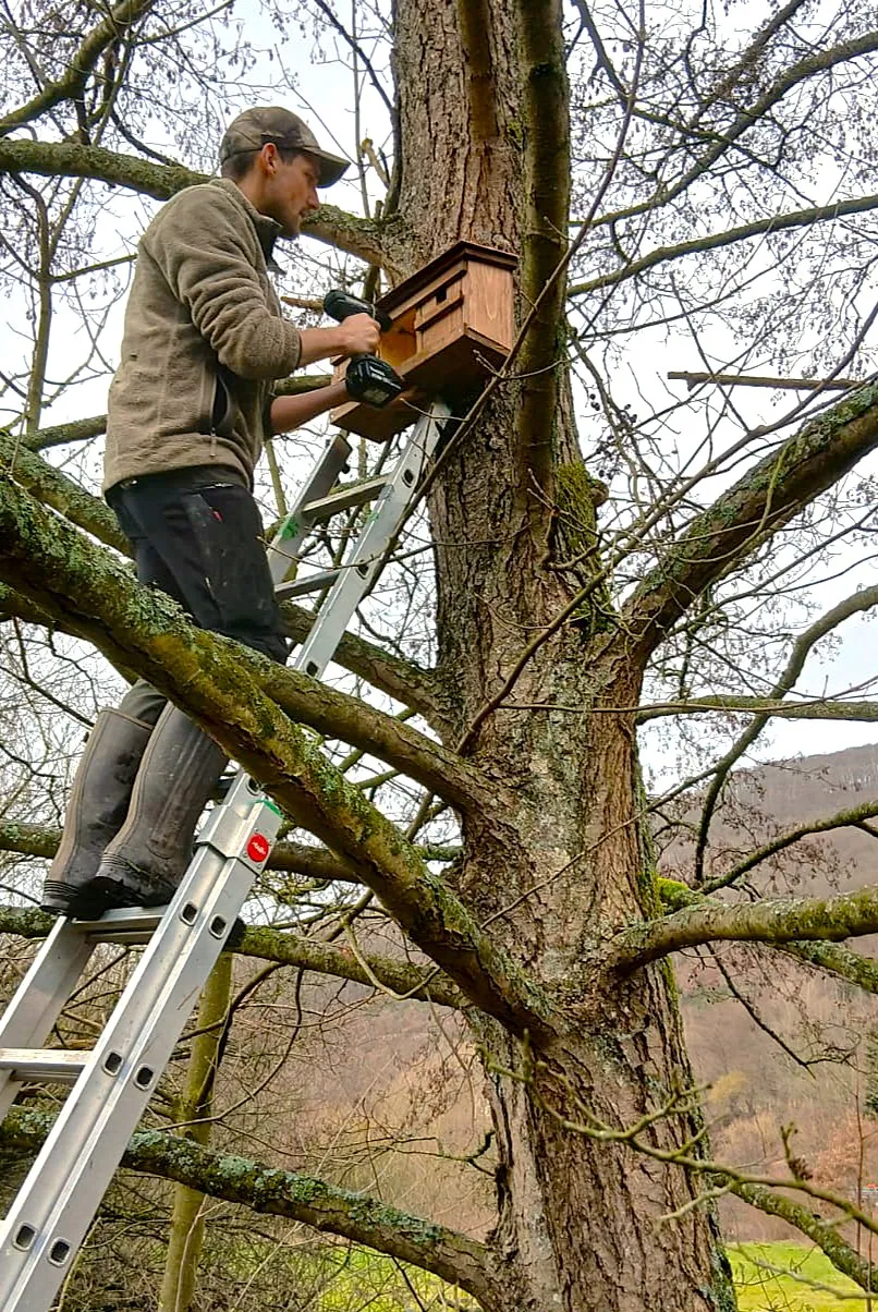 Somit begab sich ein wetterfester Trupp unter der Leitung von Maipiere-Geschäftsführer Dirk Meisch am frühen Samstagmittag daran, 39 Nistmöglichkeiten in den Baumkronen entlang des Lenneabschnitts vogelfreundlich in circa drei Meter Höhe an den passenden Bäumen anzubringen.