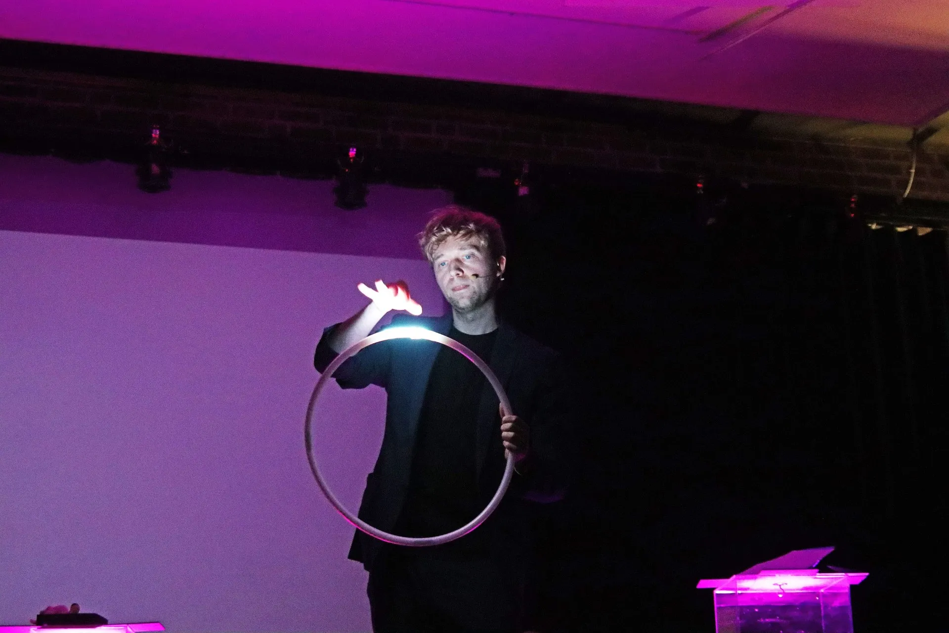 Spätestens da hat man das Gefühl: ein Abend zum Vergessen. Vergessen, im besten Sinne. Abschalten, dem Alltag mit Krisen und Katastrophen entfliehen. Zwei Stunden Staunen, Faszination pur. Marc Weide kommt unprätentiös, locker, bodenständig rüber. Ein Könner braucht kein großes Brimborium, kein „Glitzerzeug“, wie er es nennt. Nahbar, charmant, witzig wie der schelmische junge Mann von nebenan, nimmt er Besucher mit durch den Abend. Der Applaus ist kräftig. Eine Zugabe unausweichlich. Für die hat sein „persönlichstes Kunststück“, seine vierjährige Tochter Patin. Sie fürchtet die Dunkelheit vorm Einschlafen, aber mit Marcs zauberhafter Lichtschau löst sich auch das Problem – ein glanzvoller Schluss.