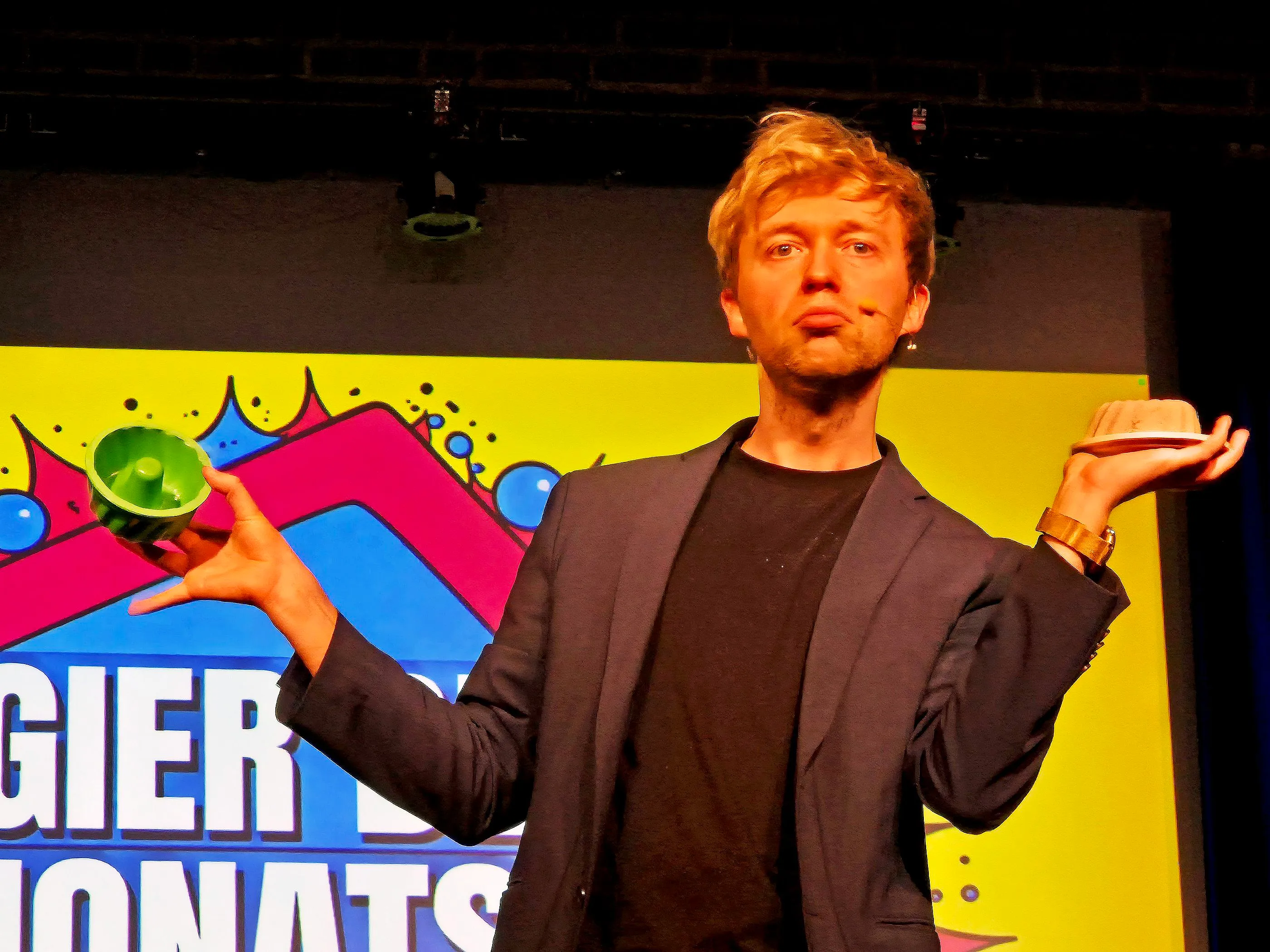 Auch drei Tricks, „die es nicht in die Show geschafft haben“, wie der verstellte Rubiks-Würfel, der mit richtigen Farbflächen wieder auftaucht und zum Glas mit Orangensaft mutiert, verzaubern das Publikum. Der magische Handwerker, bezieht die Besucher ein, geht mit der Zeit und wendet „digitale Tricks“ an. Er lässt die Smartphone-Besitzer rechnen, lässt unter anderem Schuhgröße und die letzten drei Ziffern der Handynummer multiplizieren, und am Ende ist das Ergebnis das Datum mit der aktuellen Uhrzeit.