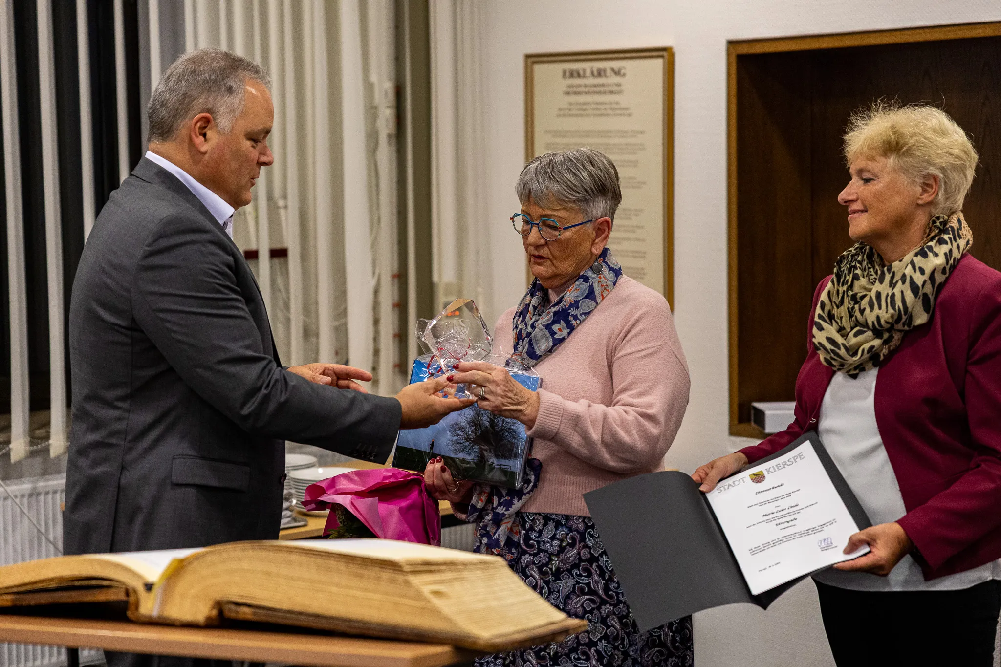 Emotional wurde es, als Marie-Luise Linde (CDU), die sich seit 1989 im Rat engagierte und darüber hinaus seit 1999 ununterbrochen als erste stellvertretende Bürgermeisterin wirkte, mit der Ehrenbürgerschaft ausgezeichnet wurde.
