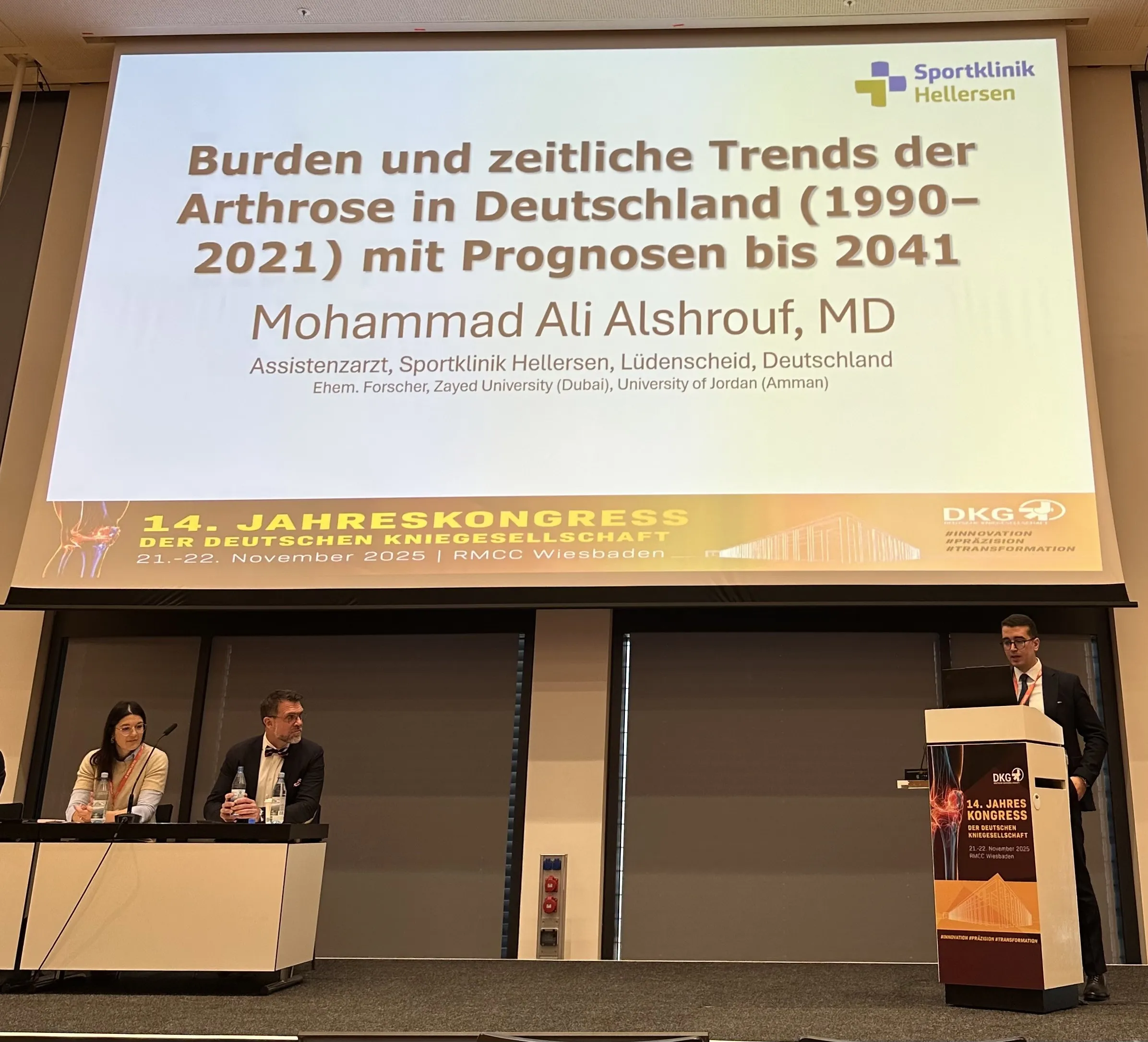 Arthrose entwickelt sich zunehmend zu einer der dominantesten Volkskrankheiten in Deutschland. Die chronische Gelenkerkrankung beeinflusst die Lebensqualität der Betroffenen erheblich. Besonders alarmierend: Immer häufiger sind auch jüngere Menschen betroffen – ein Trend, der die bisherige Wahrnehmung der Erkrankung als rein altersbedingt infrage stellt. Im Rahmen des Jahreskongresses der Deutschen Kniegesellschaft (DKG) in Wiesbaden – einem der bedeutendsten wissenschaftlichen Foren für moderne Kniechirurgie und -forschung – präsentierte Mohammad Alshrouf, Assistenzarzt in der Abteilung für Schulter-, Ellenbogen-, Kniechirurgie und Traumatologie in der Sportklinik Hellersen, seine aktuellen Forschungsergebnisse.