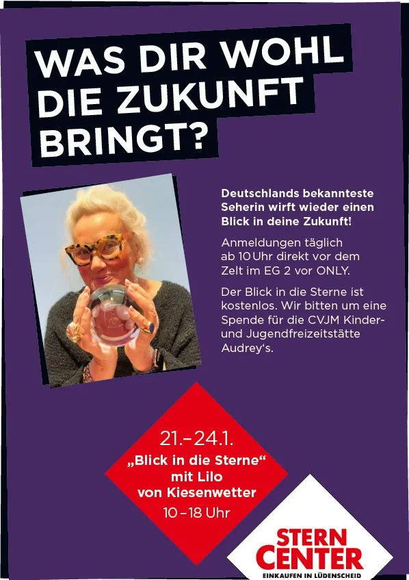 Neben dem Meet & Greet wird Lilo von Kiesenwetter vom 21. bis zum 24. Januar mit der Aktion „Blick in die Sterne“ im Stern-Center zu Gast sein und Besuchern gegen eine Spende zugunsten der CVJM-Kinder- und Jugendfreizeitstätte "Audrey’s" einen Blick in die Zukunft werfen. Die Aktion wird täglich von 10 bis 18 Uhr laufen. Anmeldungen sind ab 10 Uhr direkt vor dem Zelt im EG2 möglich.