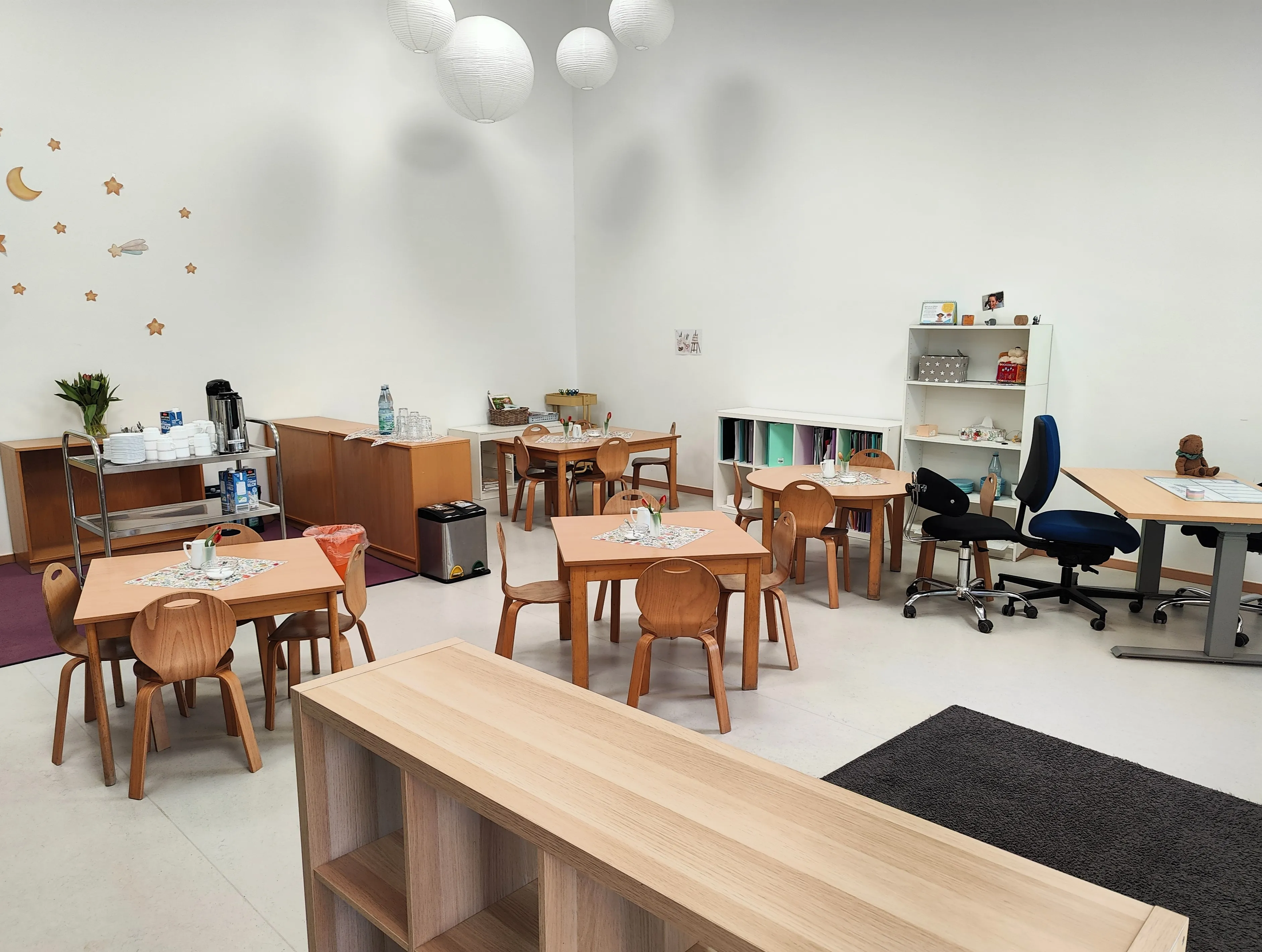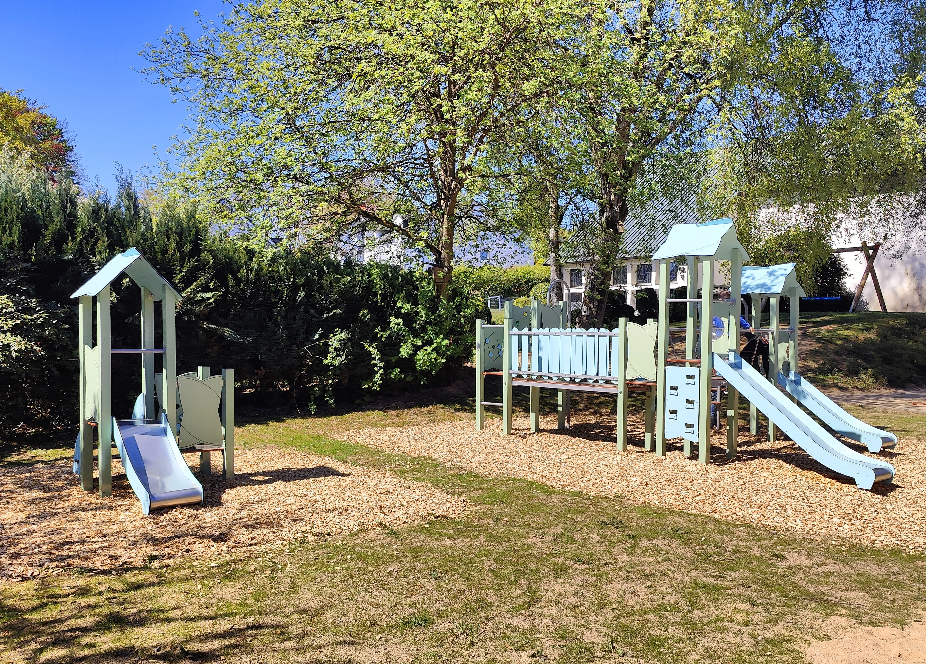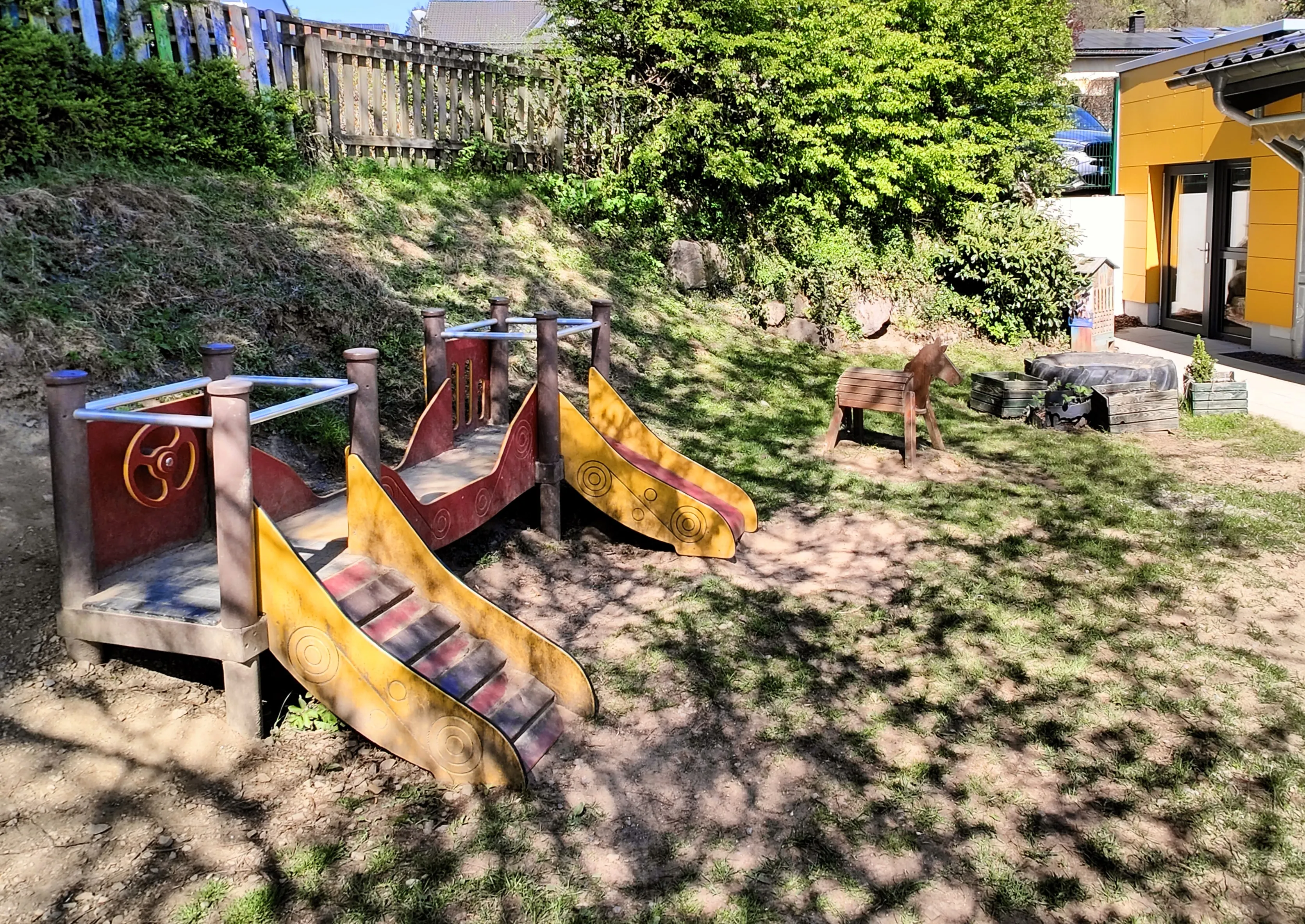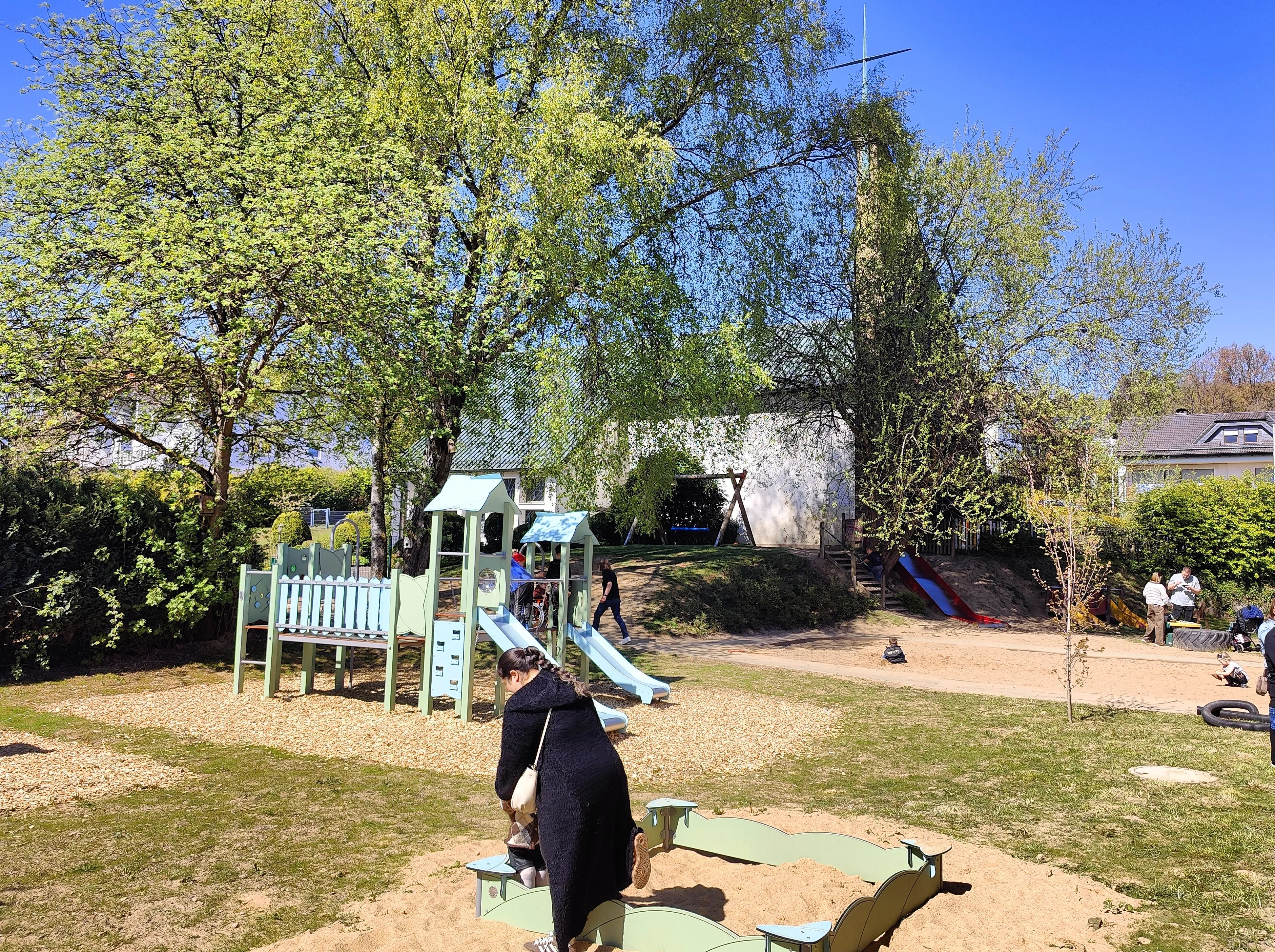 Im Zuge der Baumaßnahmen wurde das angrenzende ehemalige Pfarrhaus durch einen Durchgang mit der Kita verbunden. Dadurch entstand Platz für eine dritte Gruppe, die nun ausreichend Raum zum Spielen und Toben bietet. Gleichzeitig wurden auch die bestehenden Räume modernisiert.