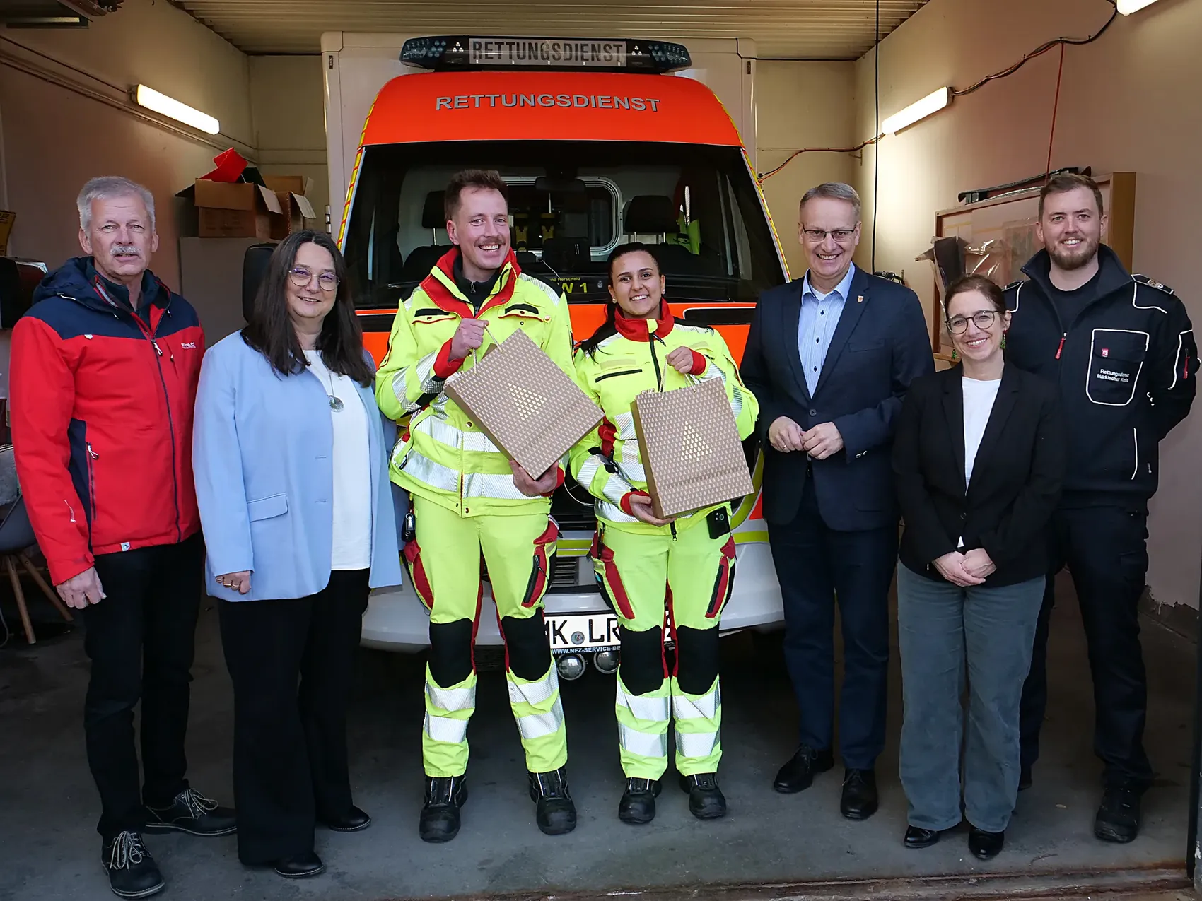 Beim Besuch aus dem Herscheider Rathaus versahen Rettungssanitäterin Larissa Hinz von der Wache Rosmart und Notfallsanitäter Julian Philippi von der Wache Halver ihren Dienst. Fabian Wagner, der Leiter der Rettungswache Rosmart war ebenfalls vor Ort und erklärte die Kombination: Für die Besetzung der Herscheider Wache werden als Stammpersonal Rosmarter Kräfte eingesetzt, denen je nach Personallage Besatzungen aus nahegelegenen 24-Stunden-Wachen beigestellt werden.