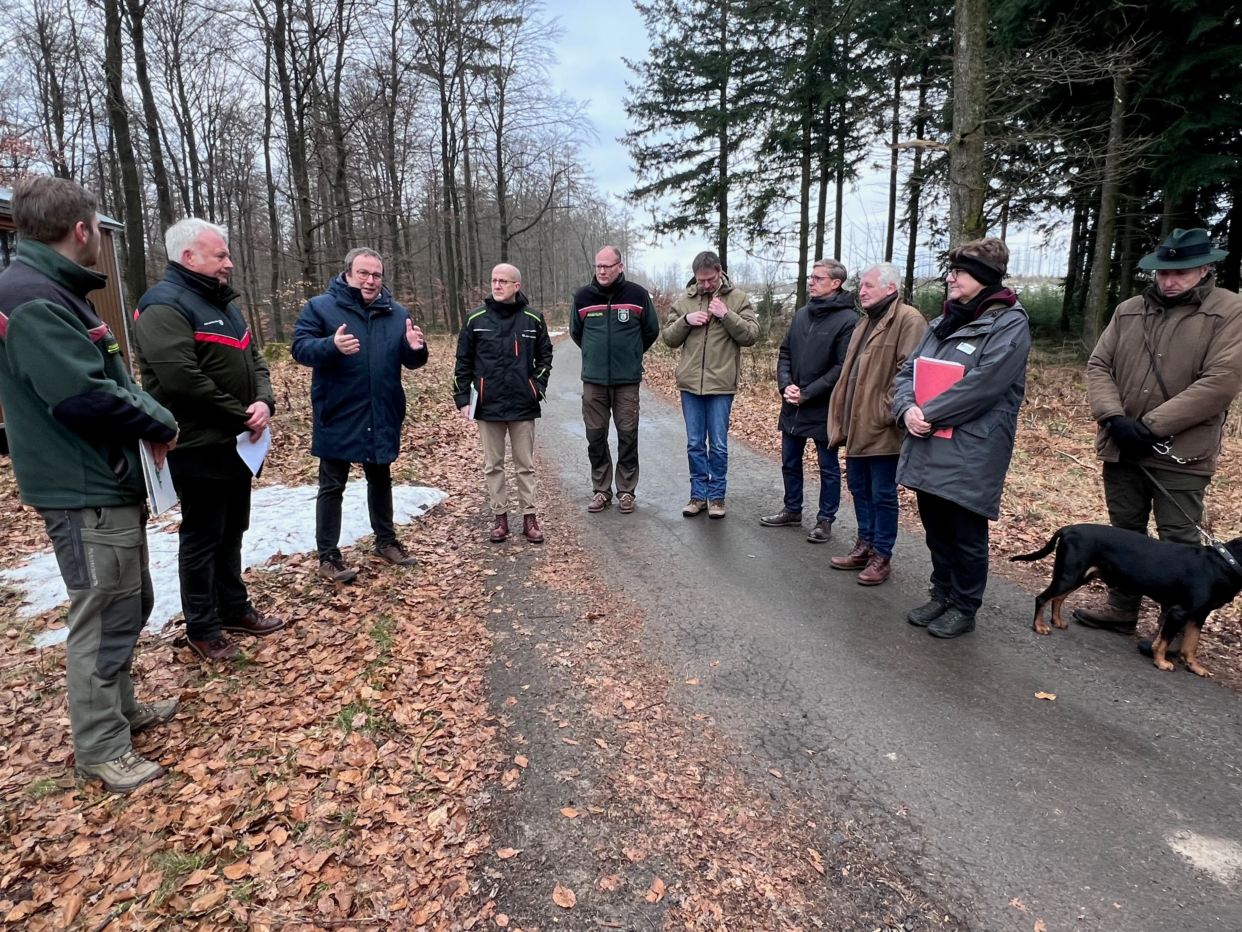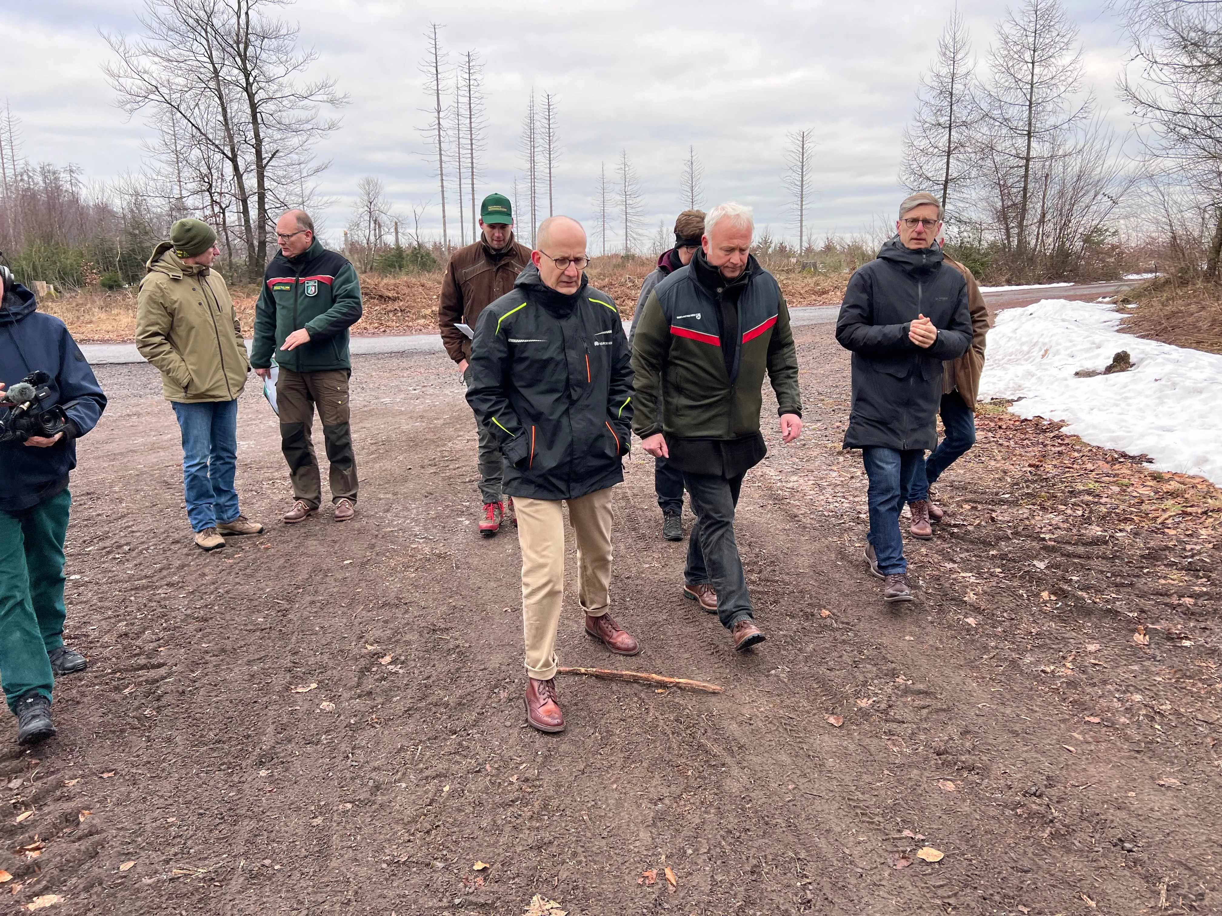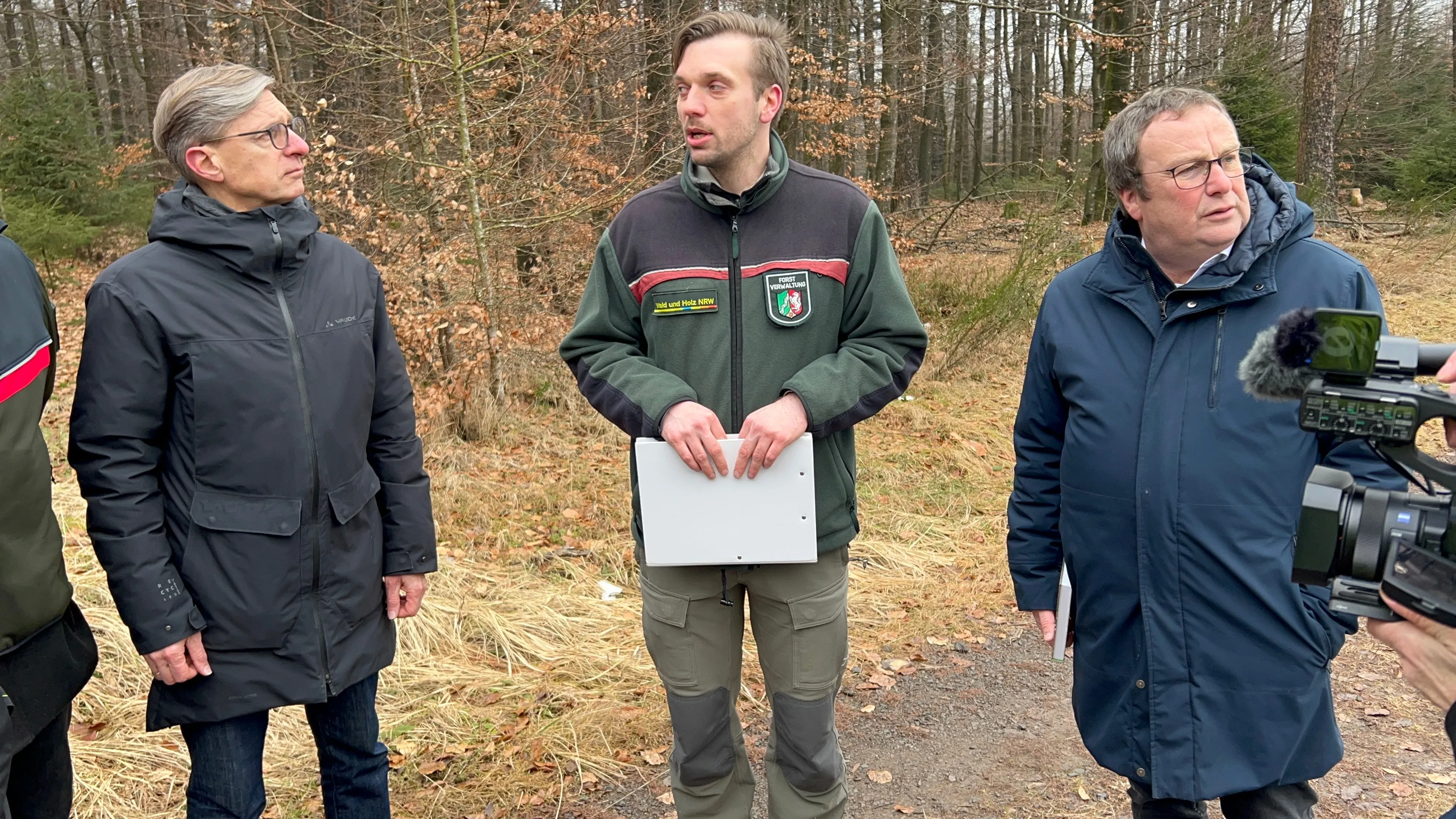 Bei einem Spaziergang durch einen Teil der zukünftigen Wildnis zeigte sich Minister Krischer fasziniert von den naturhistorischen Besonderheiten. Hohe Niederschlagsmengen bedingen Moorflächen und ein spezifisches Bauminventar, wie zum Beispiel die Karpatenbirke. Dass es in dieser Region die wahrscheinlich letzte Sichtung eines Auerhahns in Nordrhein-Westfalen gegeben habe, findet Krischer bezeichnend. Diese und andere Geschichten kann er in einem Buch nachlesen, das im Ralf Schwarzkopf überreichte.