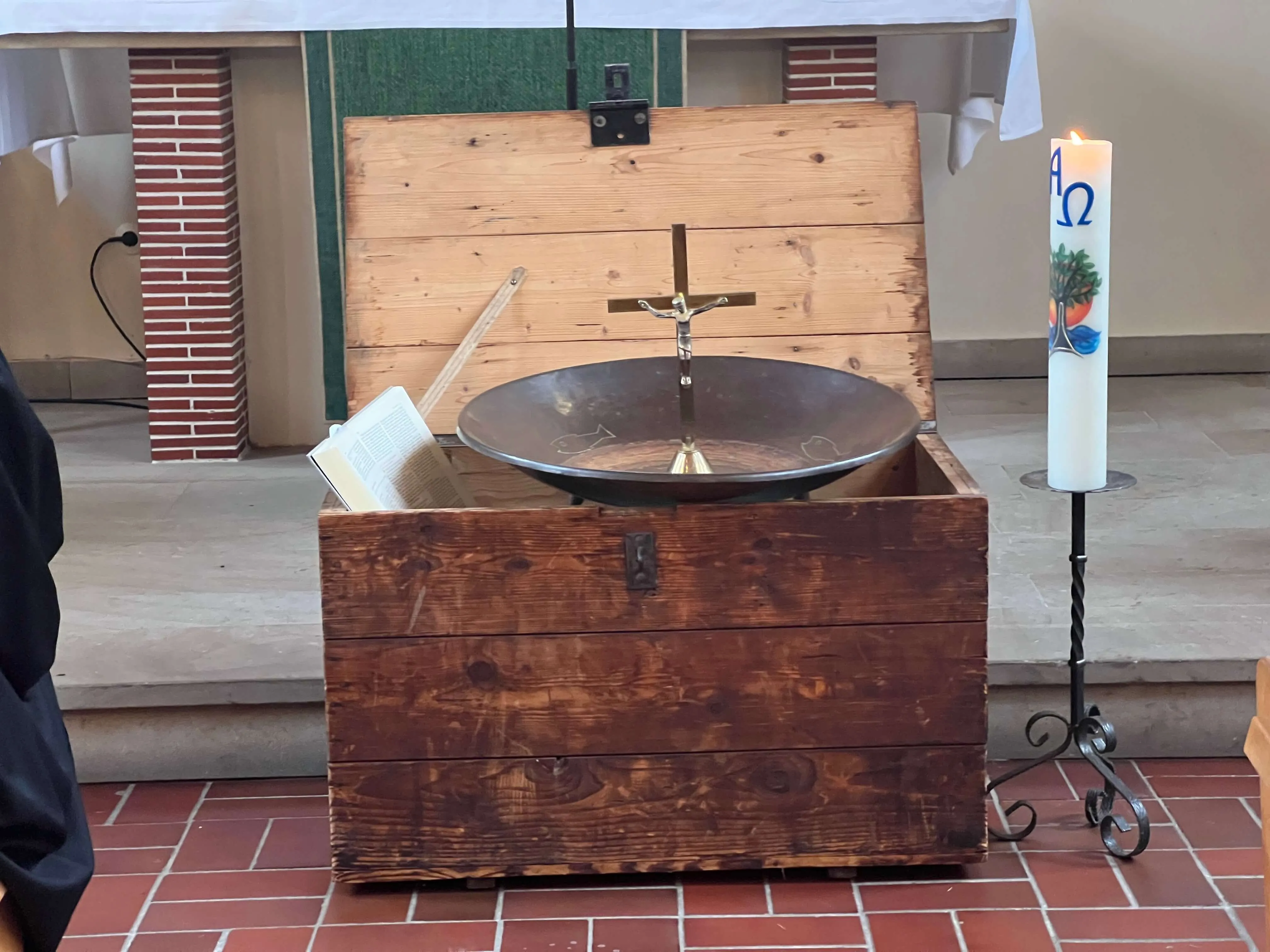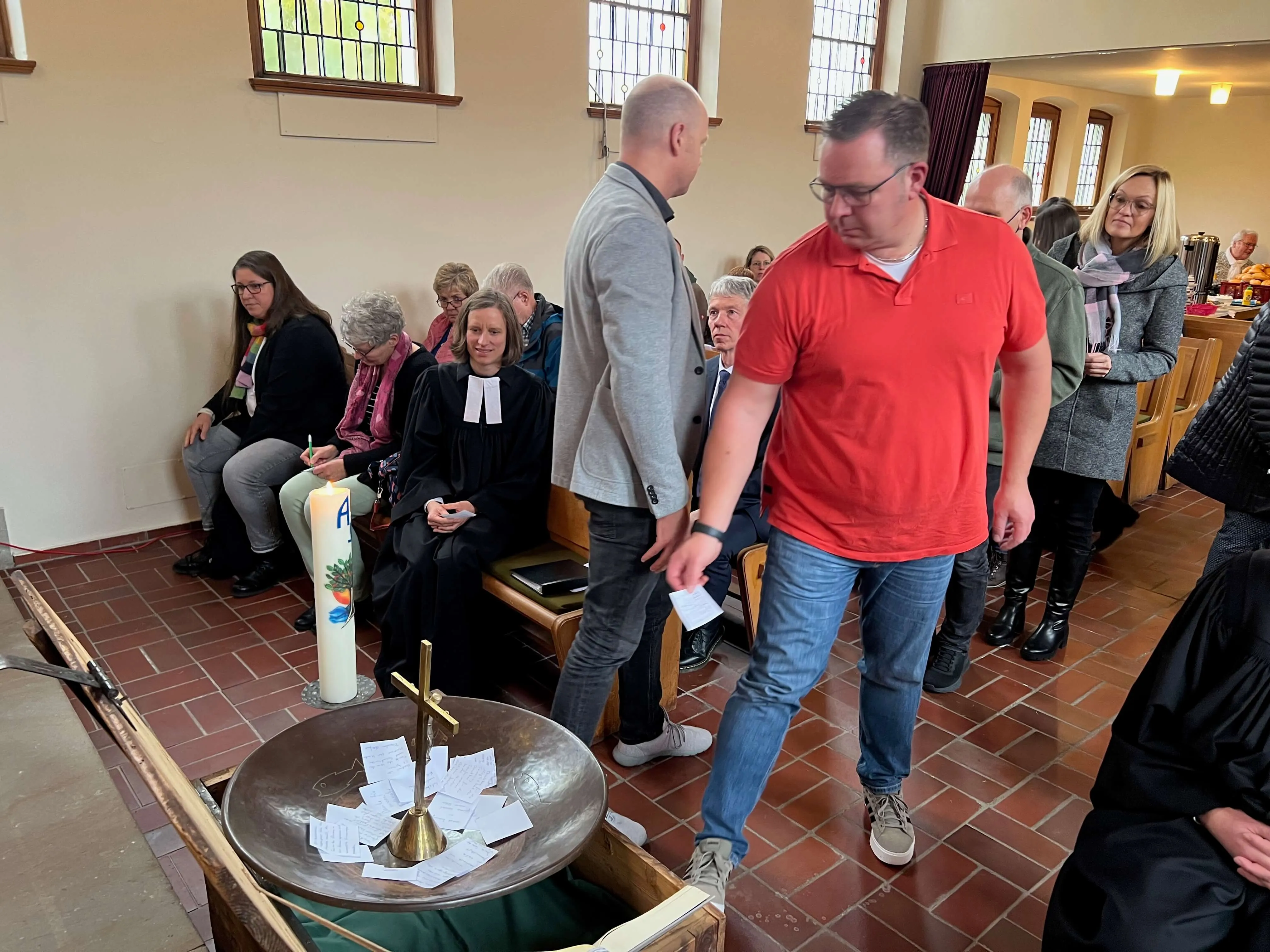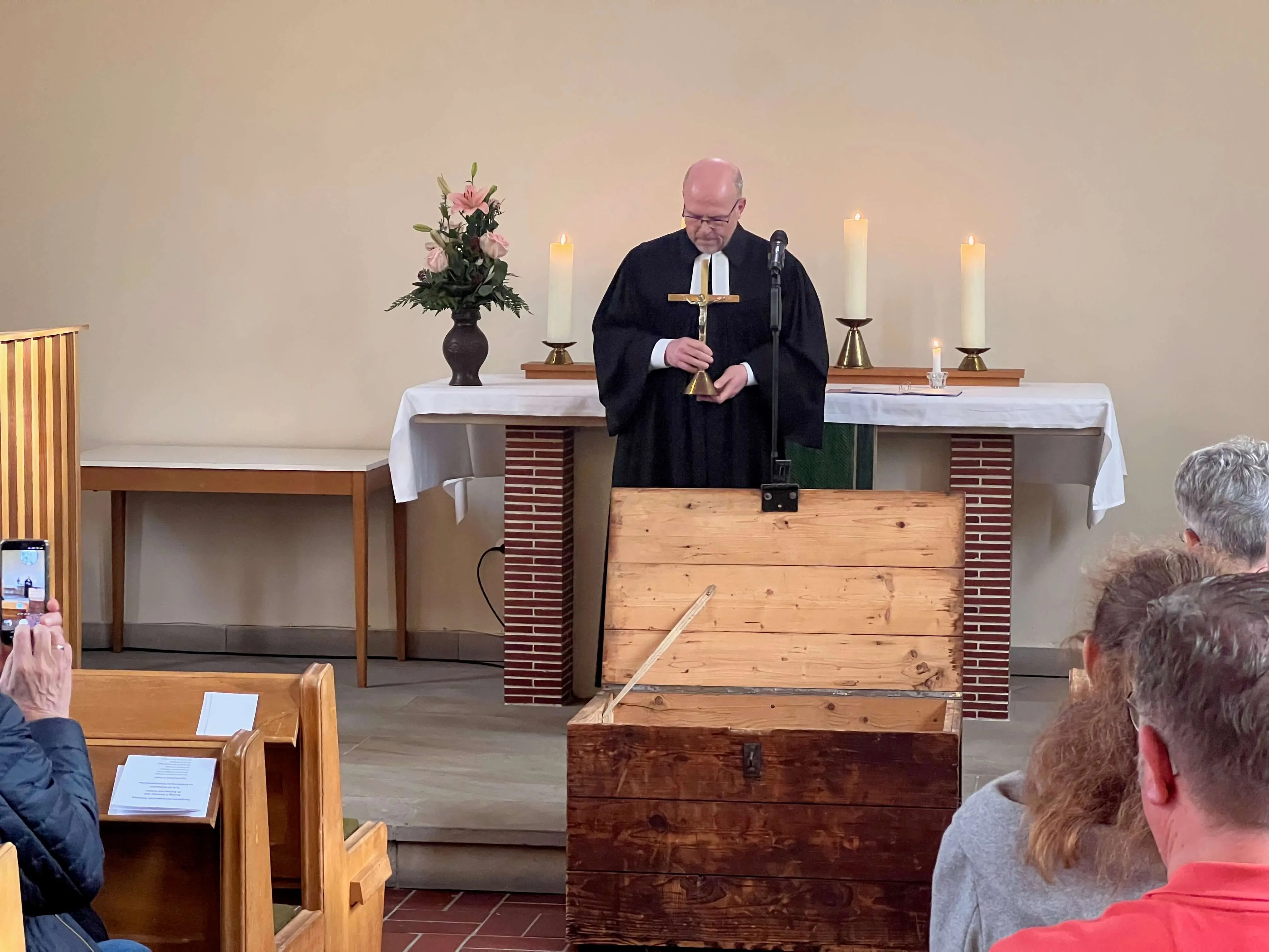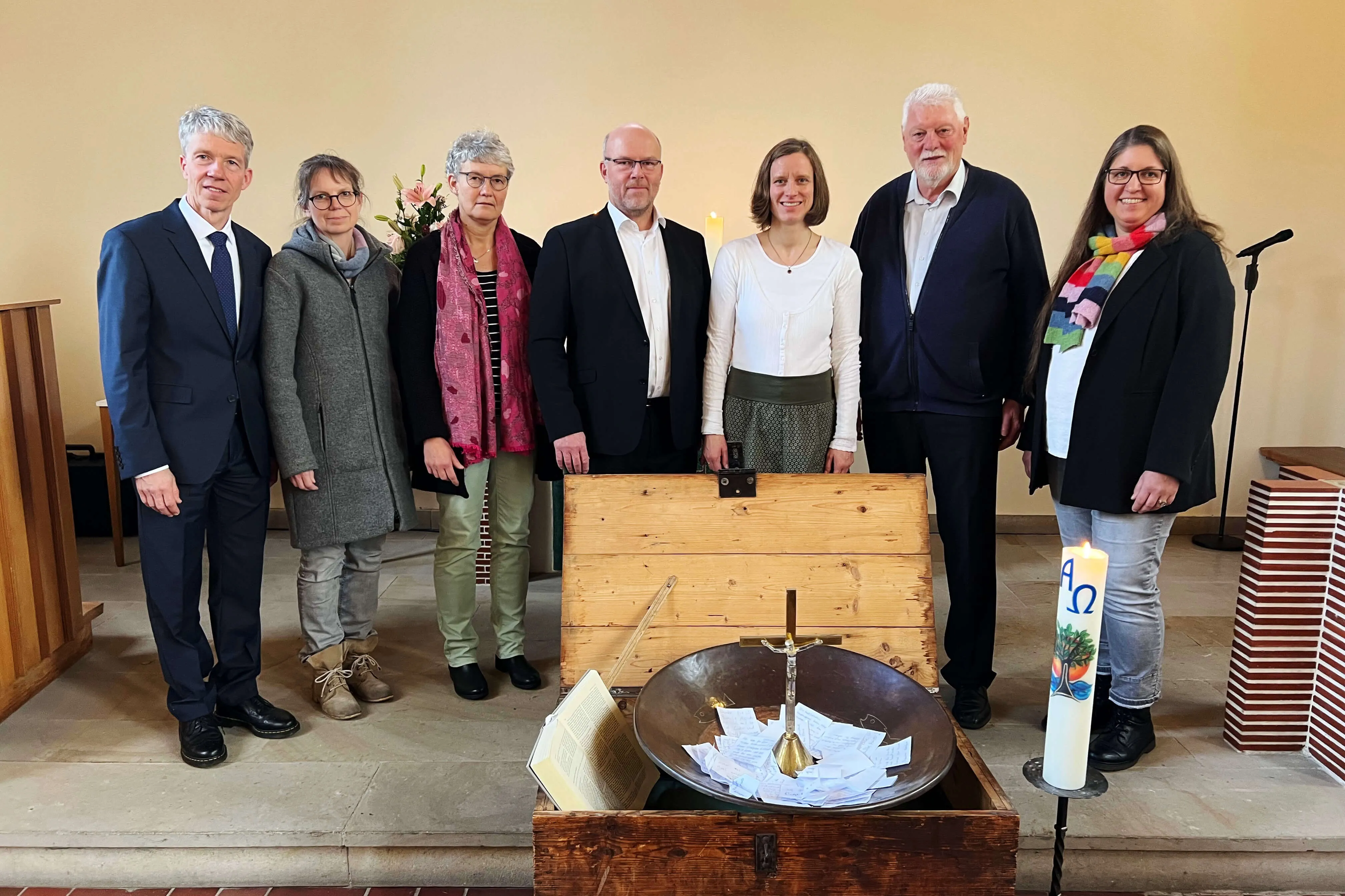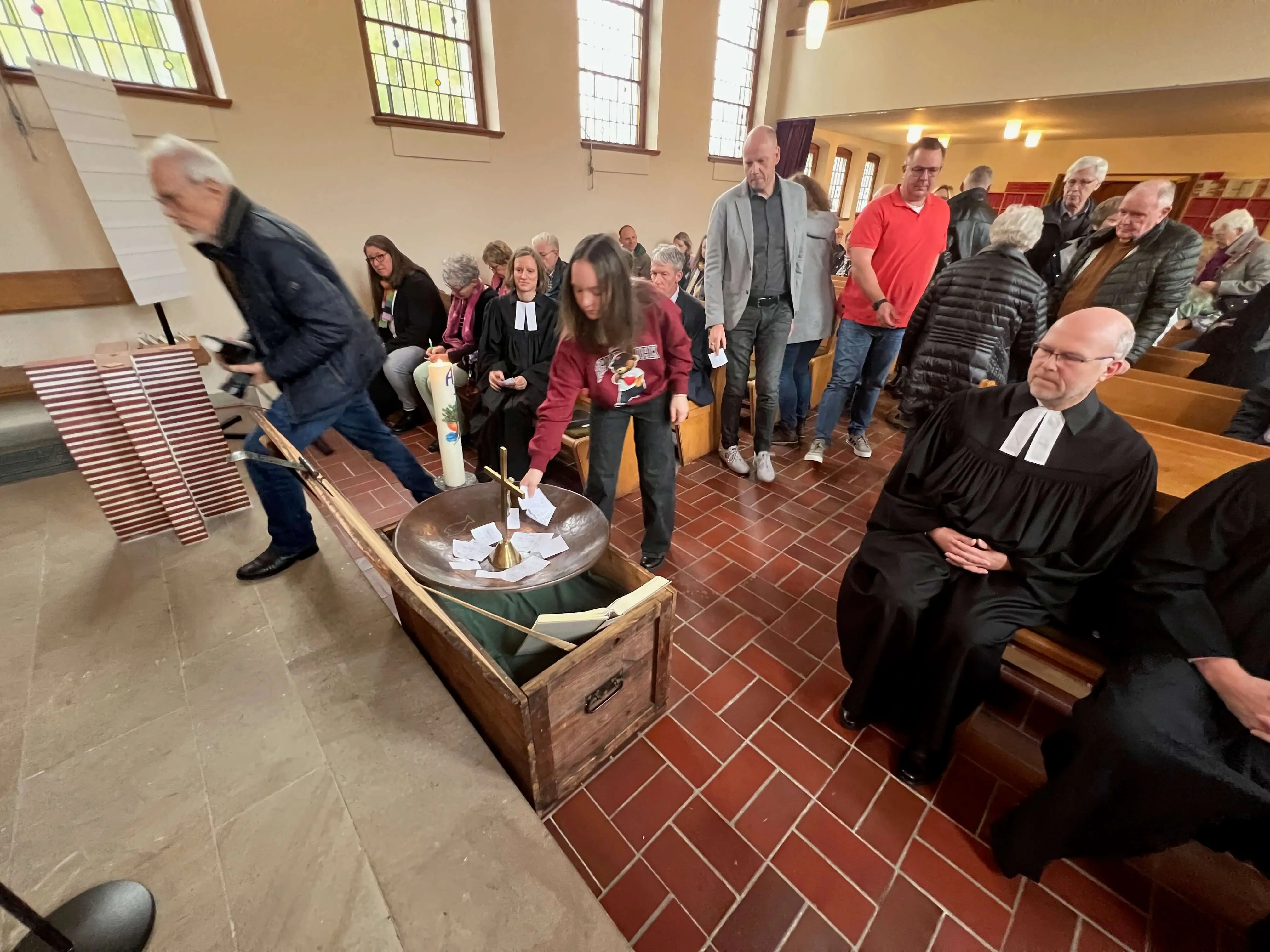 Am Ende des Gottesdienstes wurden die kirchlichen Utensilien, wie das Kreuz, die Bibel, die Taufkerze und das Taufbecken in eine Schatztruhe gelegt. Sie sollen anderenorts in der evangelischen Kirchengemeinde einen Platz und Verwendung finden, kündigte Presbyteriumsvorsitzender Peter Winkemann an. Ebenfalls in die Schatzkiste kamen die persönlichen Erinnerungen, die die Gottesdienstbesucher mit ihrer Kirche verbinden und die sie auf Zettel schrieben.