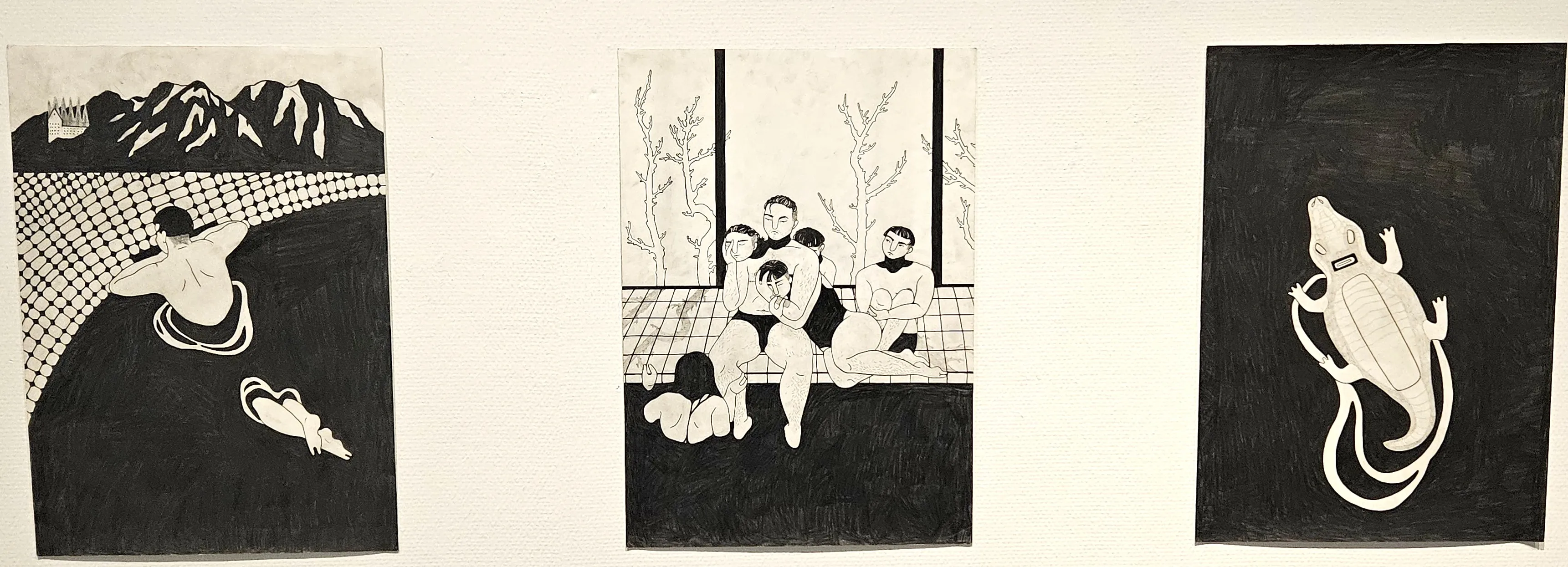 Beeindruckt hat ihn während eines zweimonatigen Stipendiums in Japan der Besuch eines Onsen. Diese traditionellen japanischen Thermalbäder sind ein zentraler Teil der japanischen Kultur, dienen der Entspannung, Gesundheit und sozialen Zusammenkunft. Der Besuch erfolgt meist nackt, streng getrennt nach Geschlechtern. Auch hier durfte Eden Nael Liedtke ganz für sich sein. „Ich wurde lediglich gefragt, wie viele japanische Wörter ich schon kenne“, berichtet er. Seine Eindrücke hat er in einem neunteiligen Werk verarbeitet, das eine Onsen-Szene zeigt.