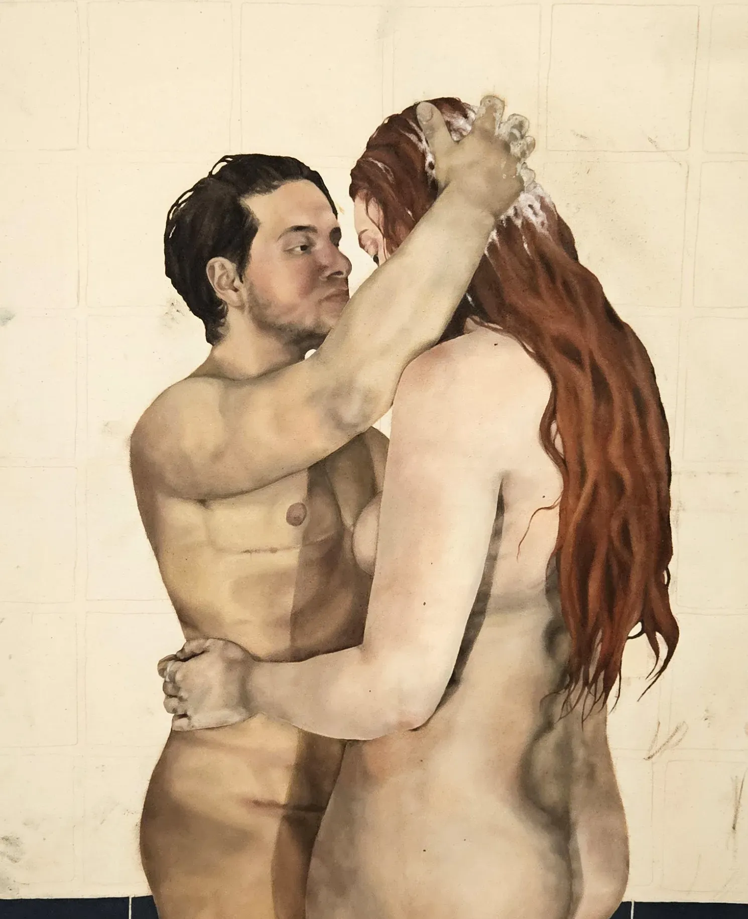 Dass Eden Nael Liedtke nicht nur als Zeichner wahrgenommen werden will, zeigt ein Ölgemälde. Es zeigt den Künstler und seine Partnerin hüllenlos im Bad bei einer zärtlichen Umarmung. Sich reinigen, nasswerden, baden – Szenen, die um diese Themen kreisen, tauchen immer wieder auf. „Das Bad ist für mich ein Raum, in dem man ganz für sich sein kann“, sagt der Künstler.