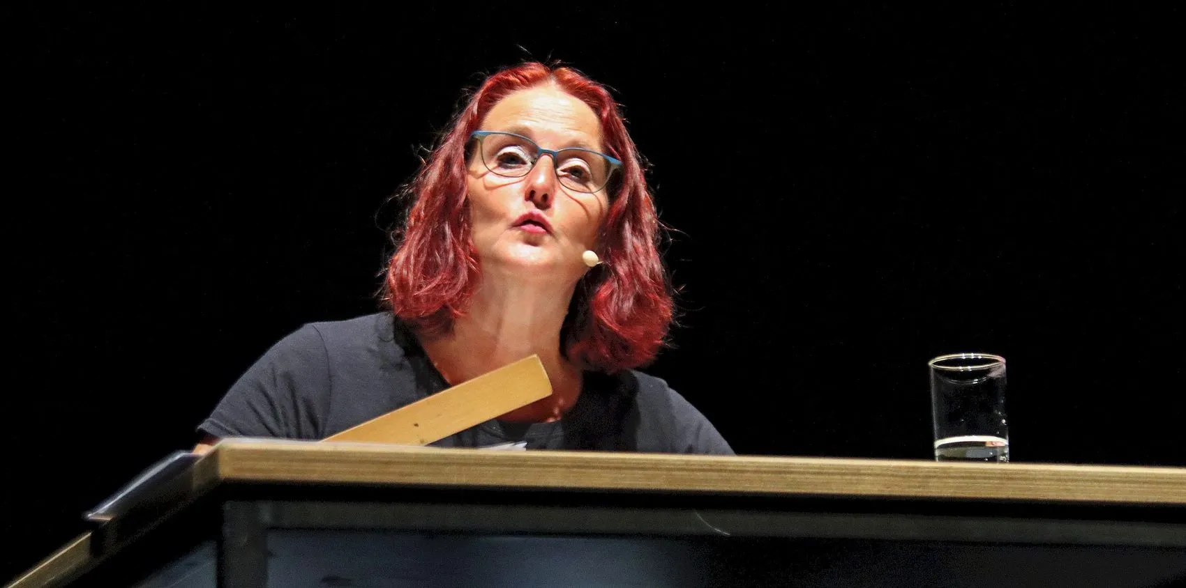 13. Mai: Minimalistisch das Bühnenbild. Anspruchsvoll das Programm. Als „Klima-Ballerina“ präsentiert sich Anny Hartmann bei ihrem Auftritt im PZ der Gesamtschule Kierspe.