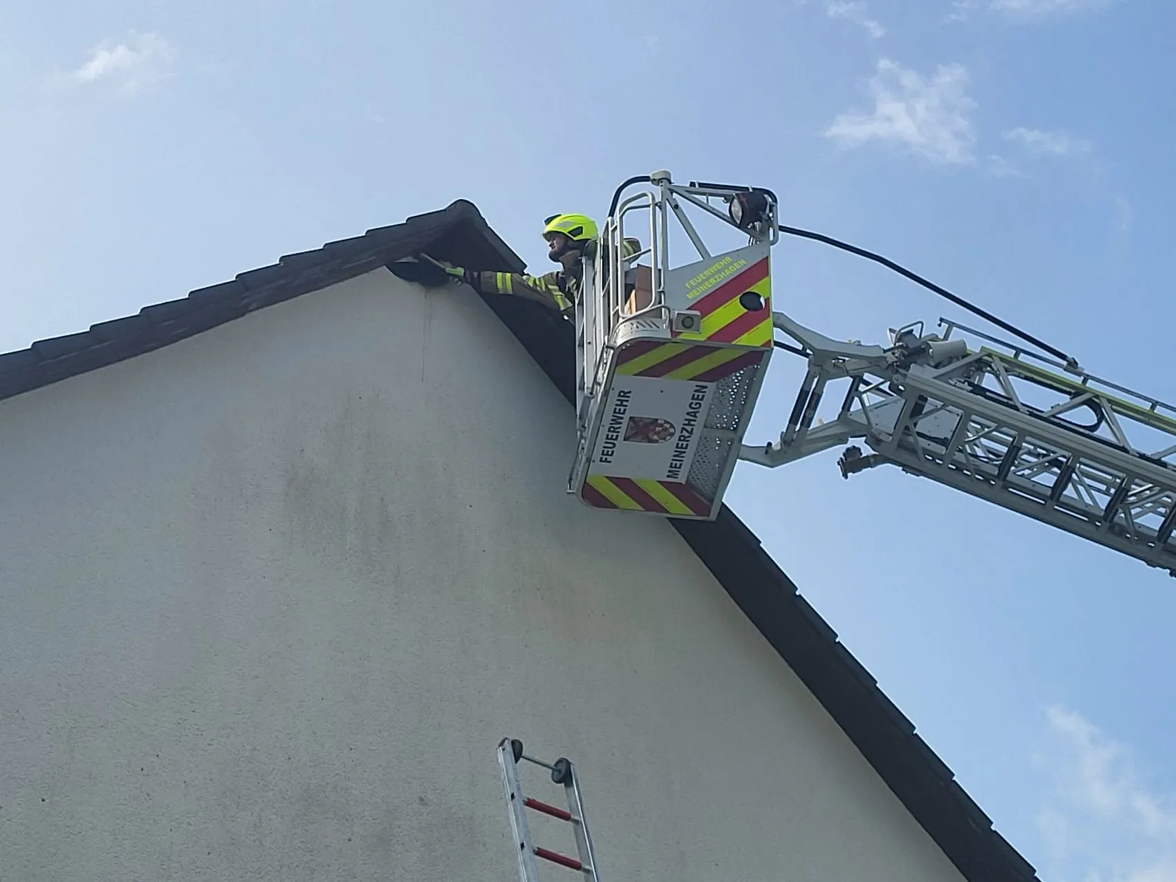 3. Juni: Tierischer Einsatz für die Freiwillige Feuerwehr Kierspe. „Dohlen-Rettung“ lautete das Einsatzstichwort. Mit Hilfe der Drehleiter aus Meinerzhagen kann das Tier aus 13 Metern Höhe gerettet werden.