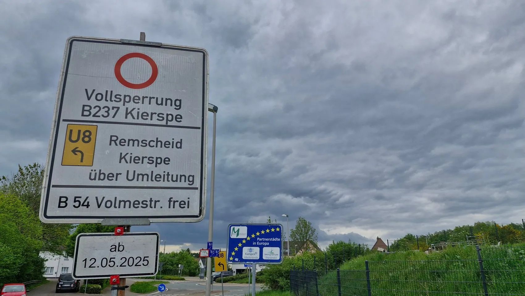 7. Mai: Die Beschilderung steht, die Vorbereitungen auf die große Sperrung in Kierspe sind so gut wie abgeschlossen. Am Montag, 12. Mai, beginnt der Abriss mit darauffolgendem Neubau der Volmebrücke.