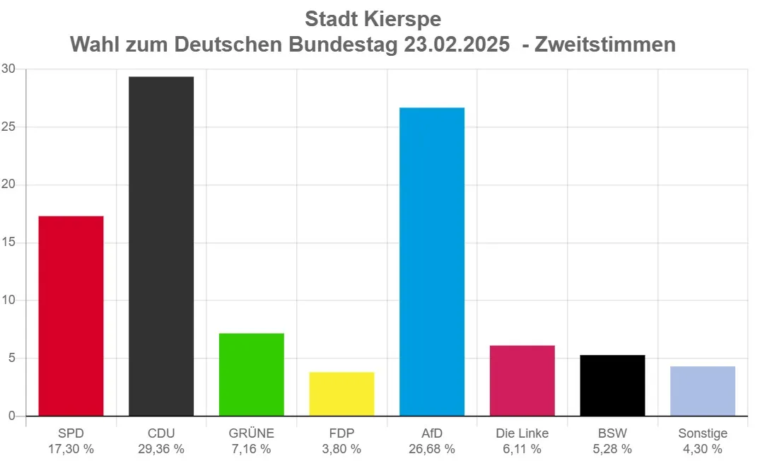 23. Februar: Bundestagswahl. Die Kiersper haben eine klare Tendenz zur AfD. Und so war das Ergebnis: Fast gleichauf sind in Kierspe die CDU und die AfD. Die Union liegt mit 29,36 Prozent der Wählerstimmen nur knapp vor der AfD, die bei den Kierspern 26,68 Prozent der Stimmen auf sich vereinen konnte. Das ist ein Zuwachs gegenüber der Wahl 2021 von mehr als 15 Prozent. Verlierer in der Volmekommune ist die SPD, die um fast elf Prozent auf nunmehr 17,3 Prozent zurückfällt. Und auch die FDP verliert fast acht Prozent ihrer Wählerstimmen auf nur noch 3,8 Prozent. Die Grünen kommen am Sonntag auf 7,16 Prozent der Stimmen, Die Linke schafft 6,11 Prozent.